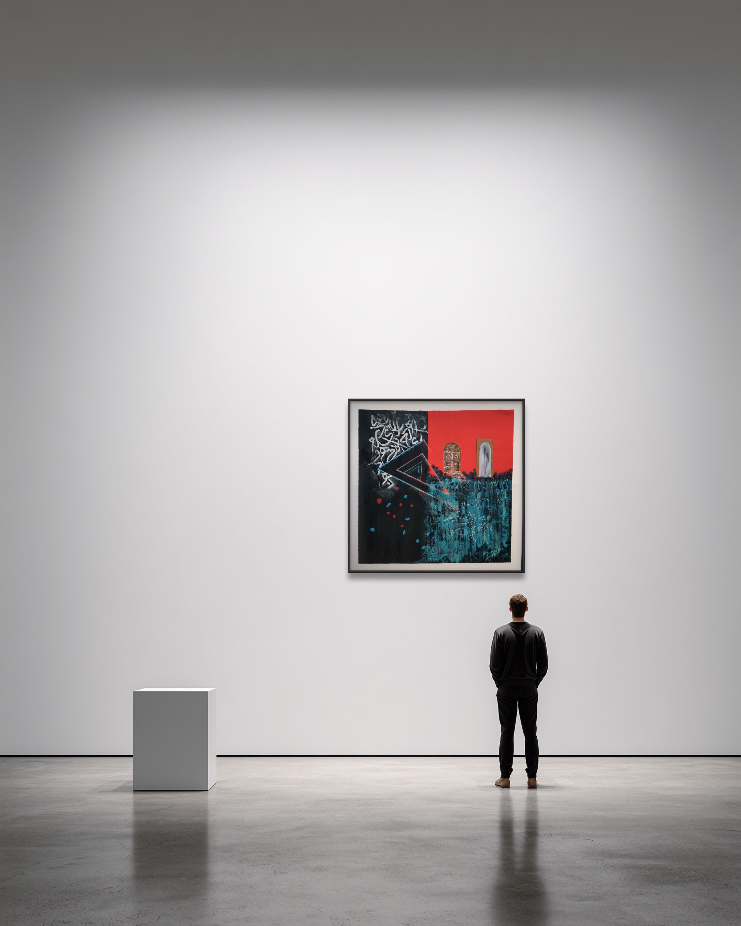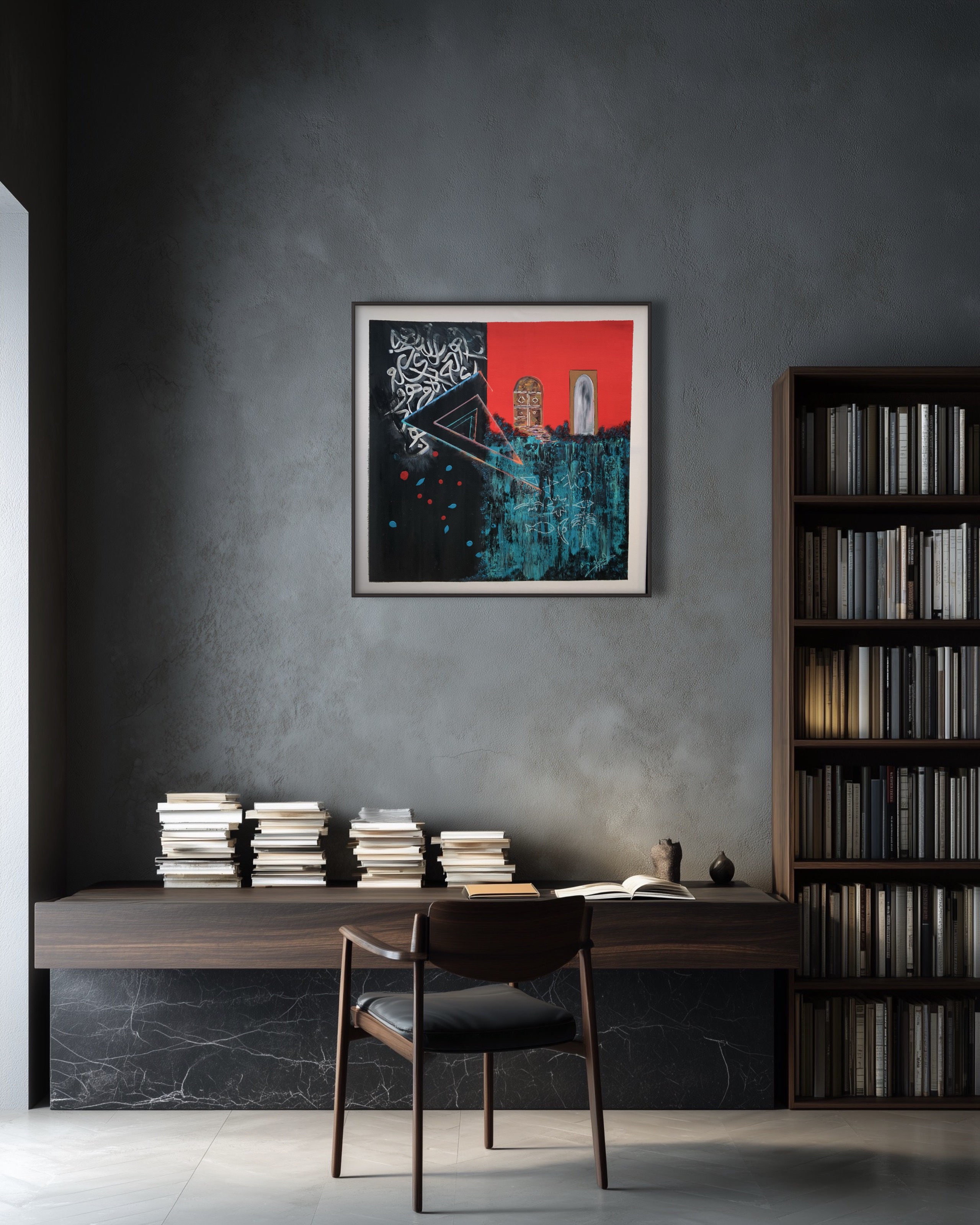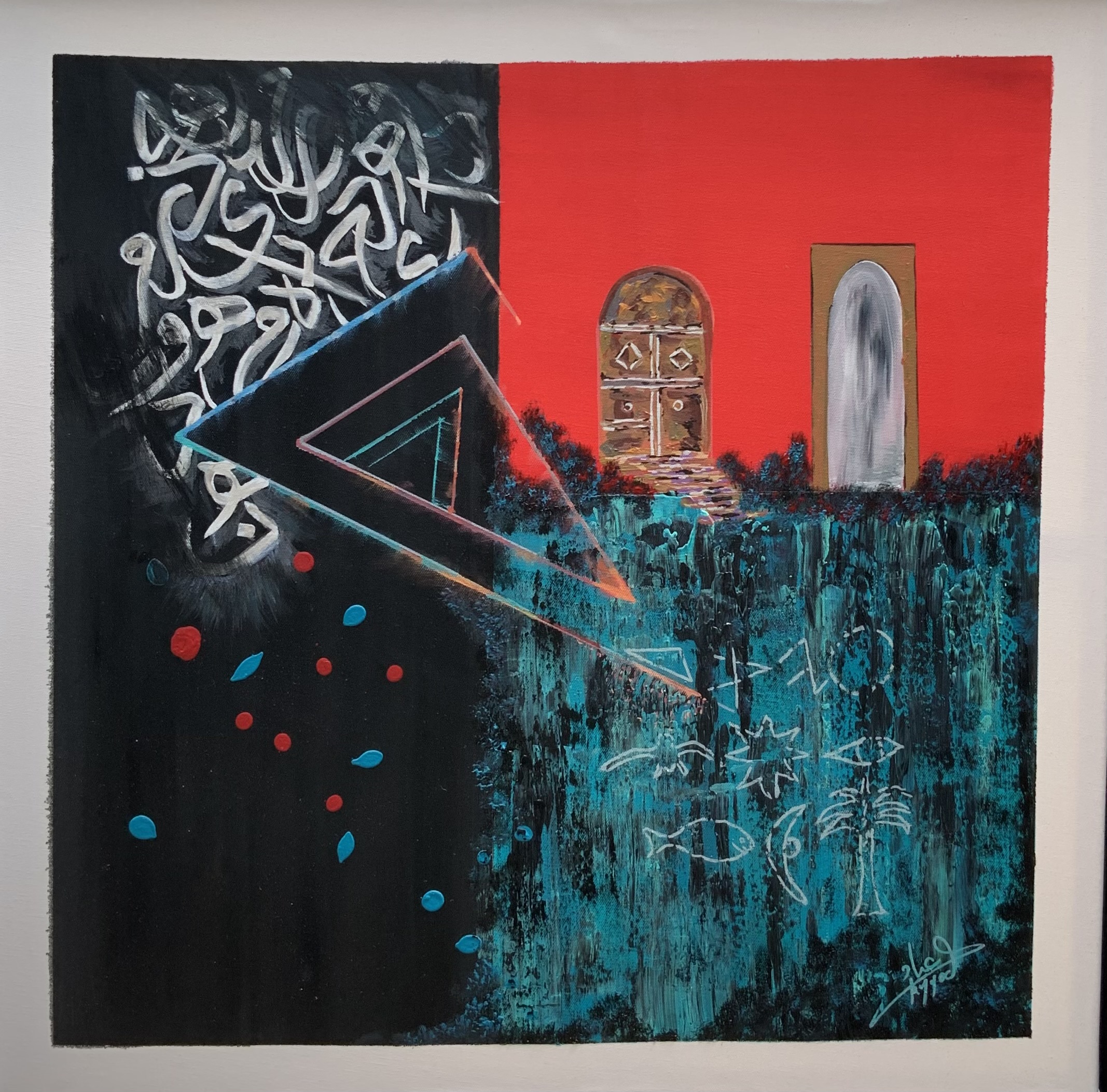 من كنعان إلى العربية” هي رحلة بصرية تختصر تحوّل الهوية واللغة عبر الزمن. تتقاطع الرموز والخطوط بين العتمة واللون، حيث تنبثق الحروف من جذورها الأولى لتتجسد في أشكال أكثر وضوحًا وحضورًا. الأبواب المرسومة تقف كرمز للعبور بين الحضارات، بينما يشق المثلث طريقه كإشارة للانتقال، الاكتشاف، واستمرار الحكاية