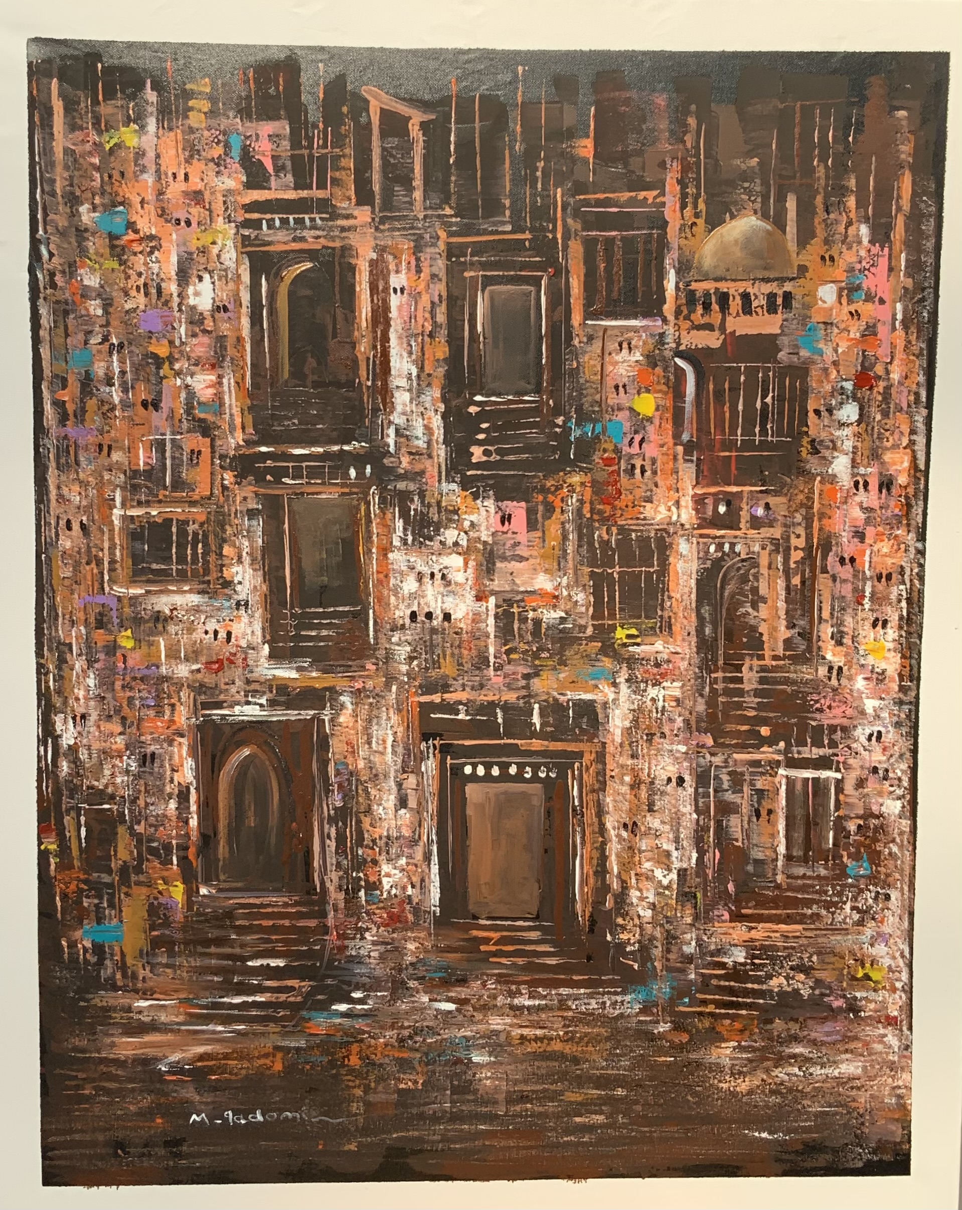 This painting portrays an abstract architectural vision of an old city façade, where doors and windows merge with rich earthy textures and scattered vibrant color accents. The work evokes depth and memory, as if documenting the stories of an ancient city whose secrets rest behind its weathered walls. Dynamic brushstrokes and subtle light contrasts breathe life into the composition, giving the city a silent yet vivid presence.