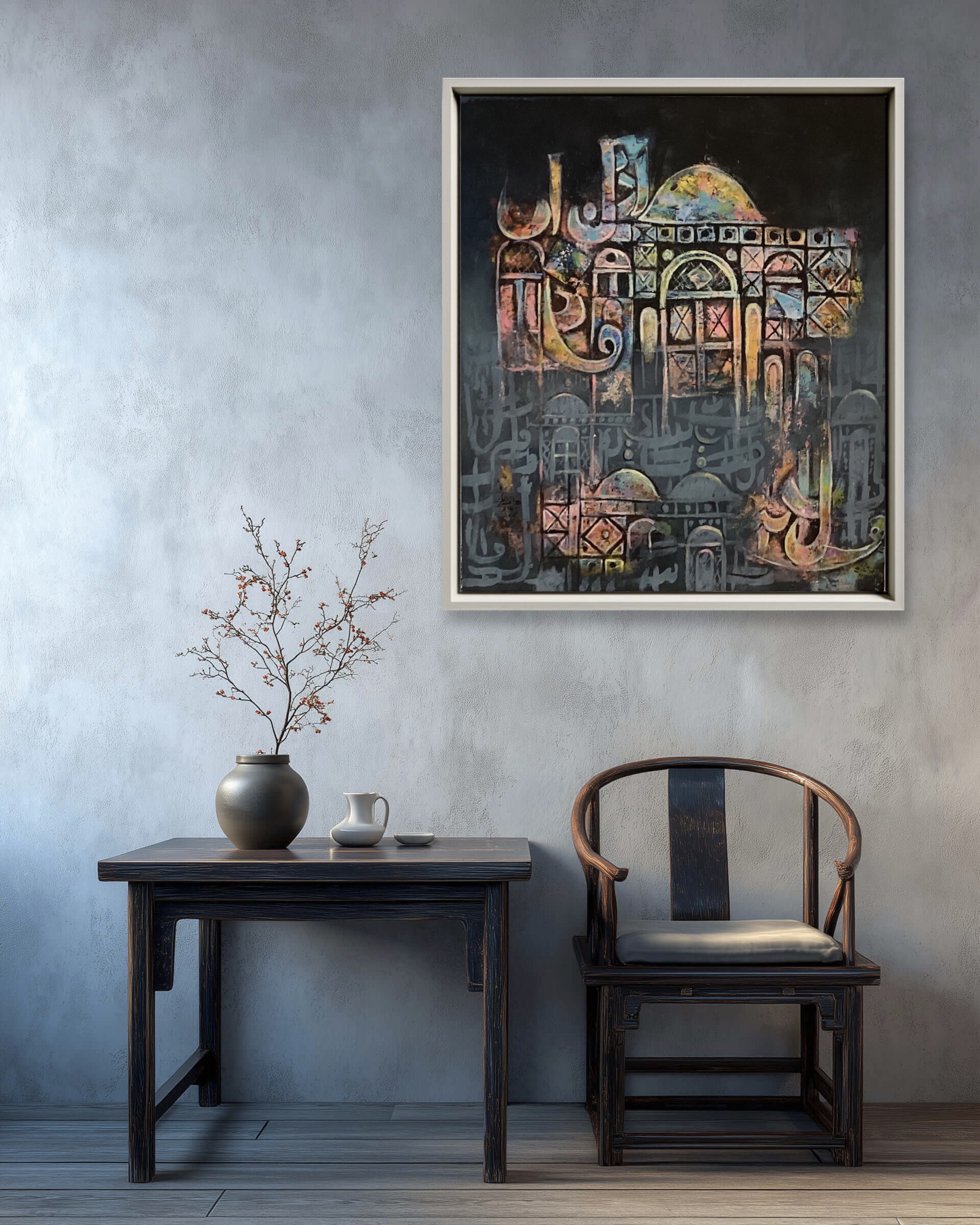 A mixed calligraphic–architectural artwork where heritage elements emerge from a deep, dark background. Domes, arches, and windows glow with warm colors, suggesting a spiritual pulse running through the city. The interplay of light and shadow creates a living memory of ancient Eastern cities, blending abstraction with symbolism in a harmonious visual rhythm.