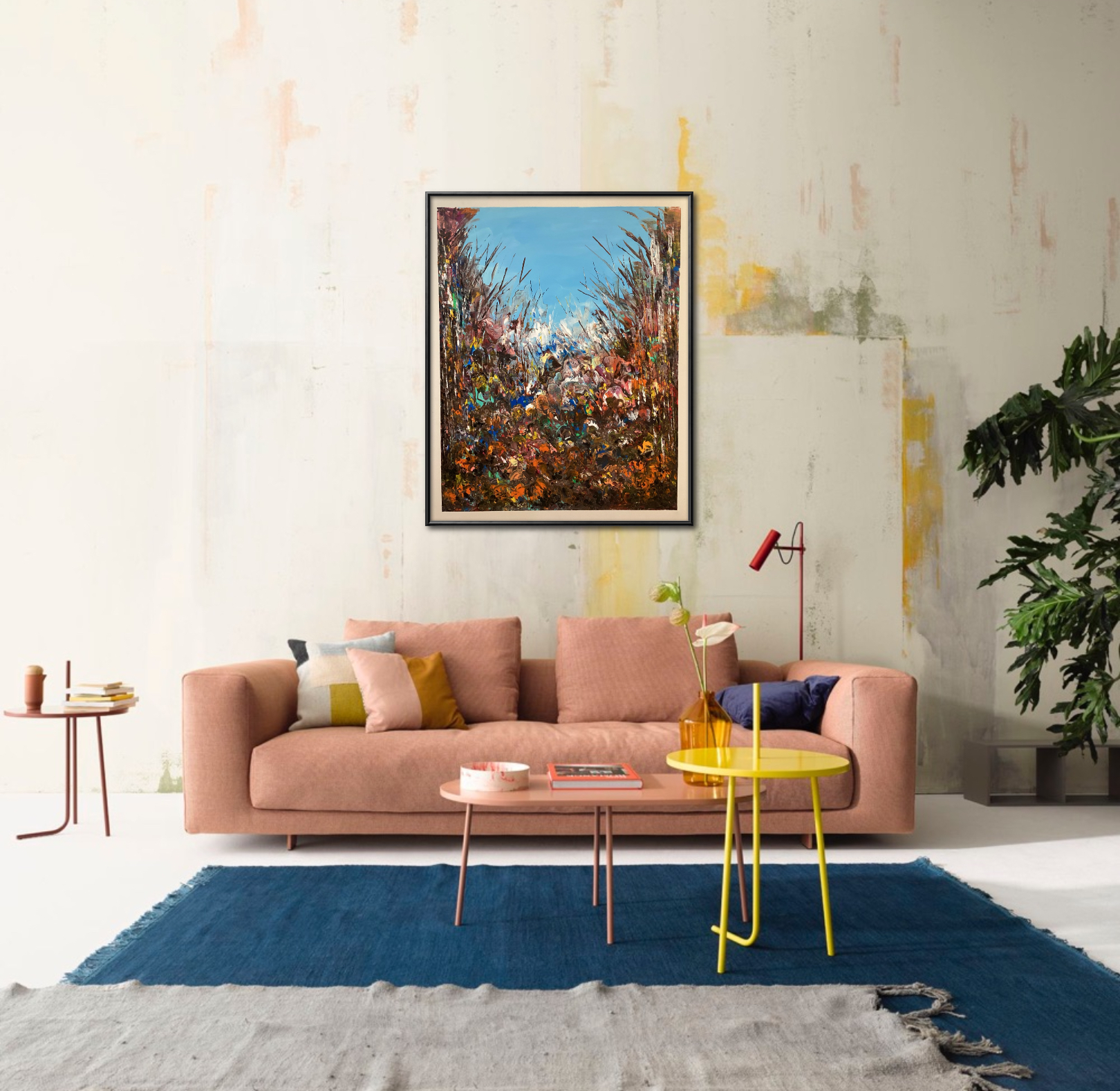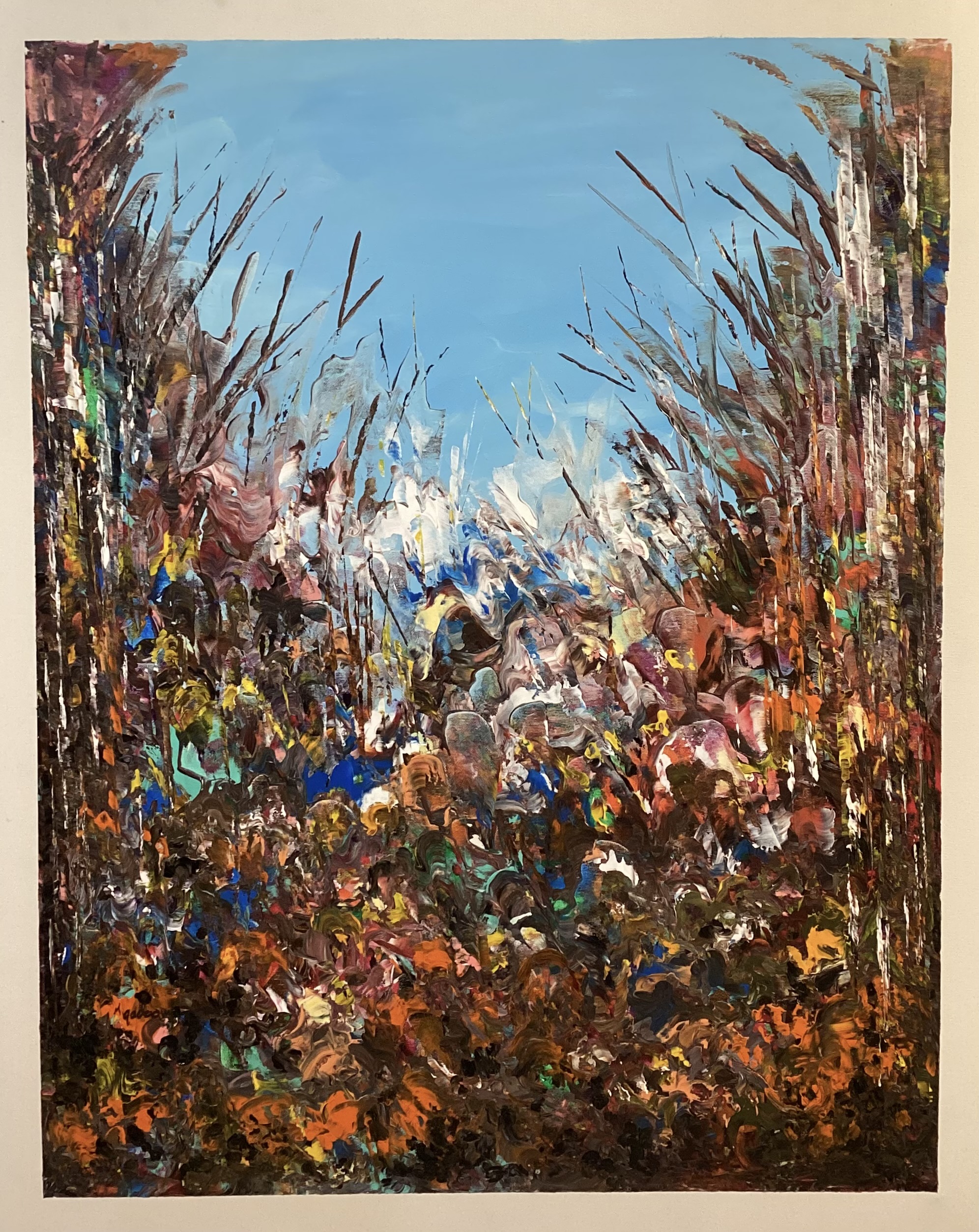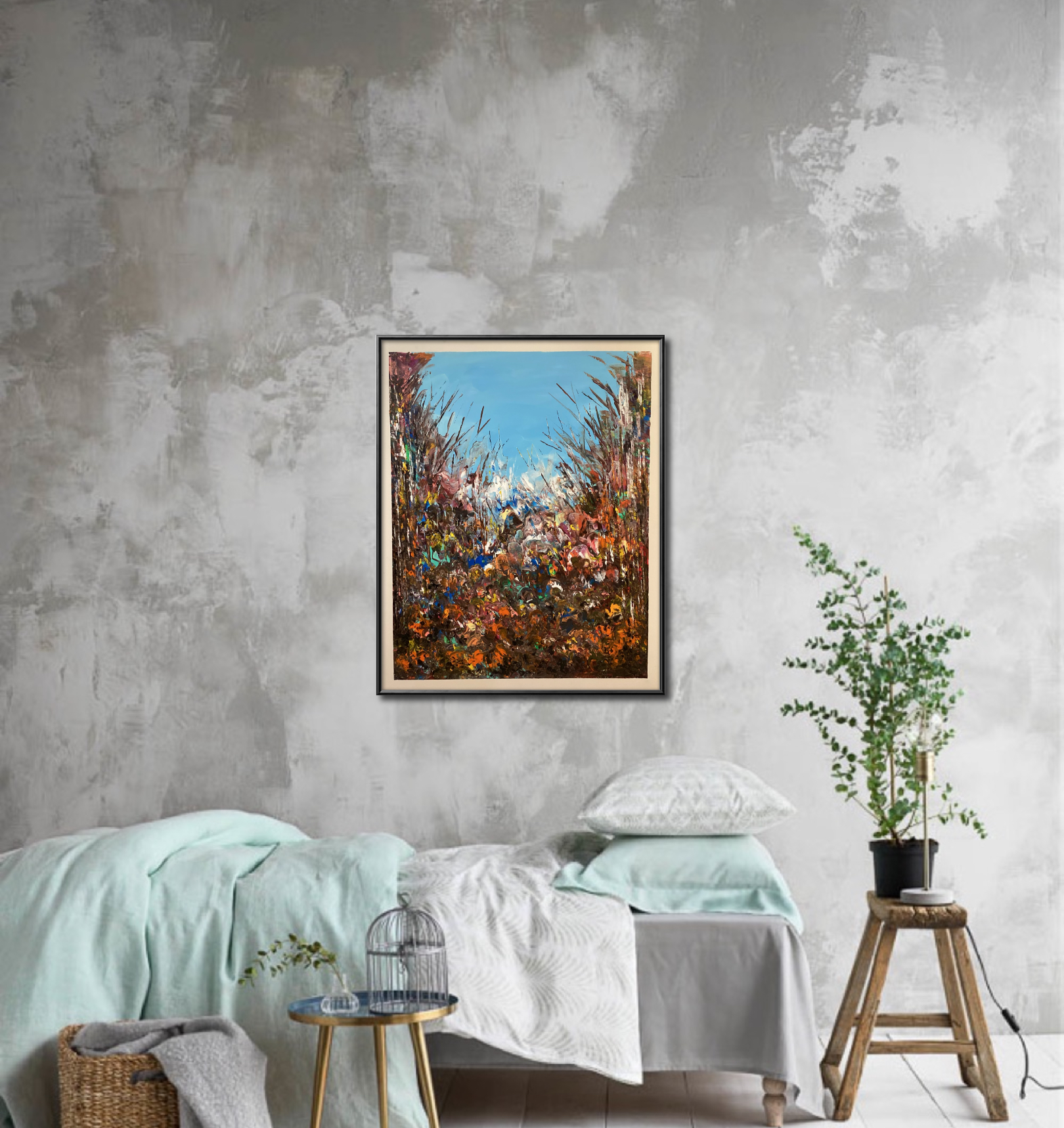 The painting presents a vibrant abstract scene where dense, warm, earthy colors dominate the lower part, gradually transitioning into brighter hues beneath a calm blue sky. The vertical strokes resemble swaying plants or reeds, forming a visual path that draws the eye toward the horizon. This blend of spontaneity and layered colors gives the artwork a sense of renewal and movement, as if nature is coming alive once more.