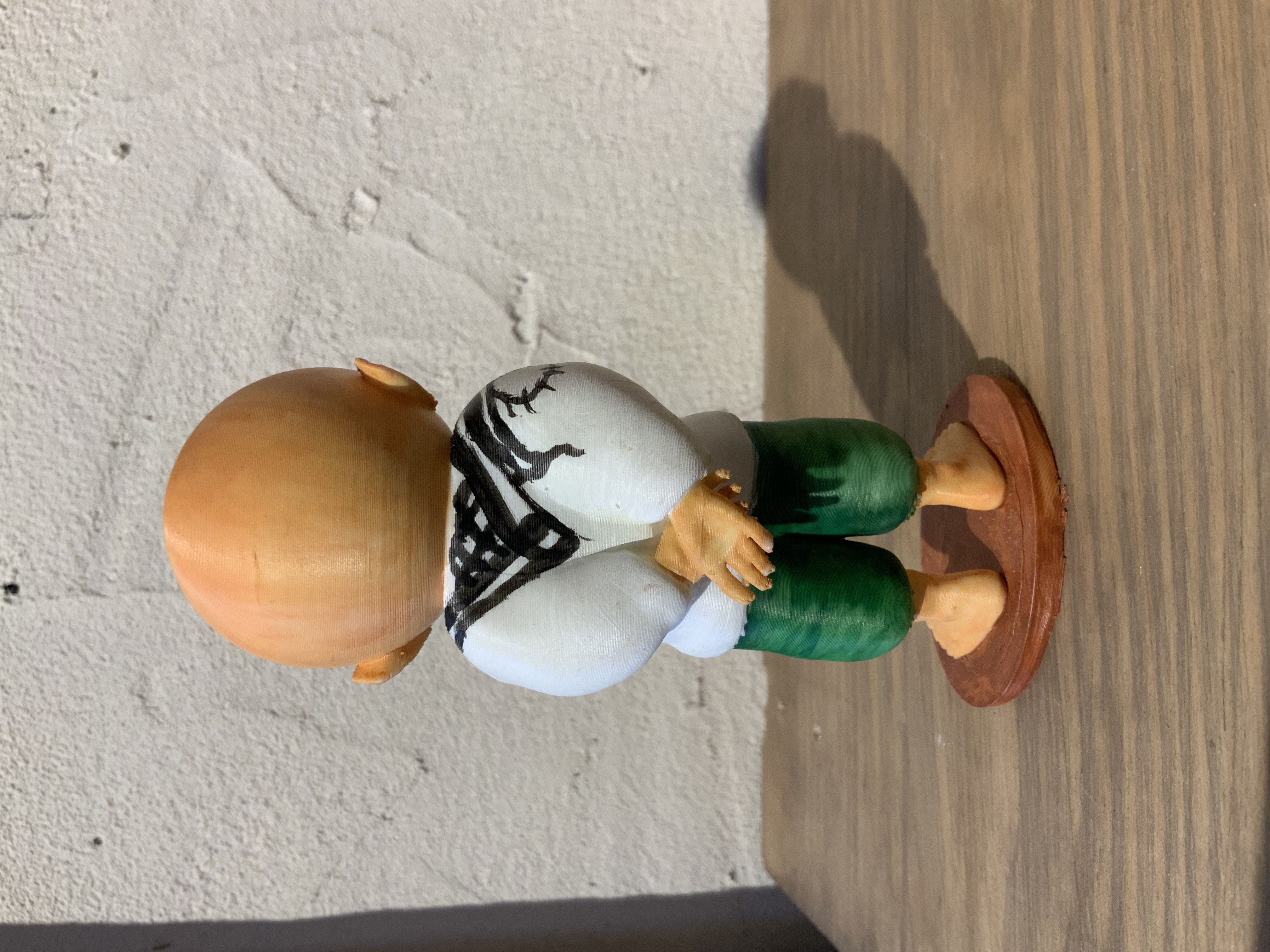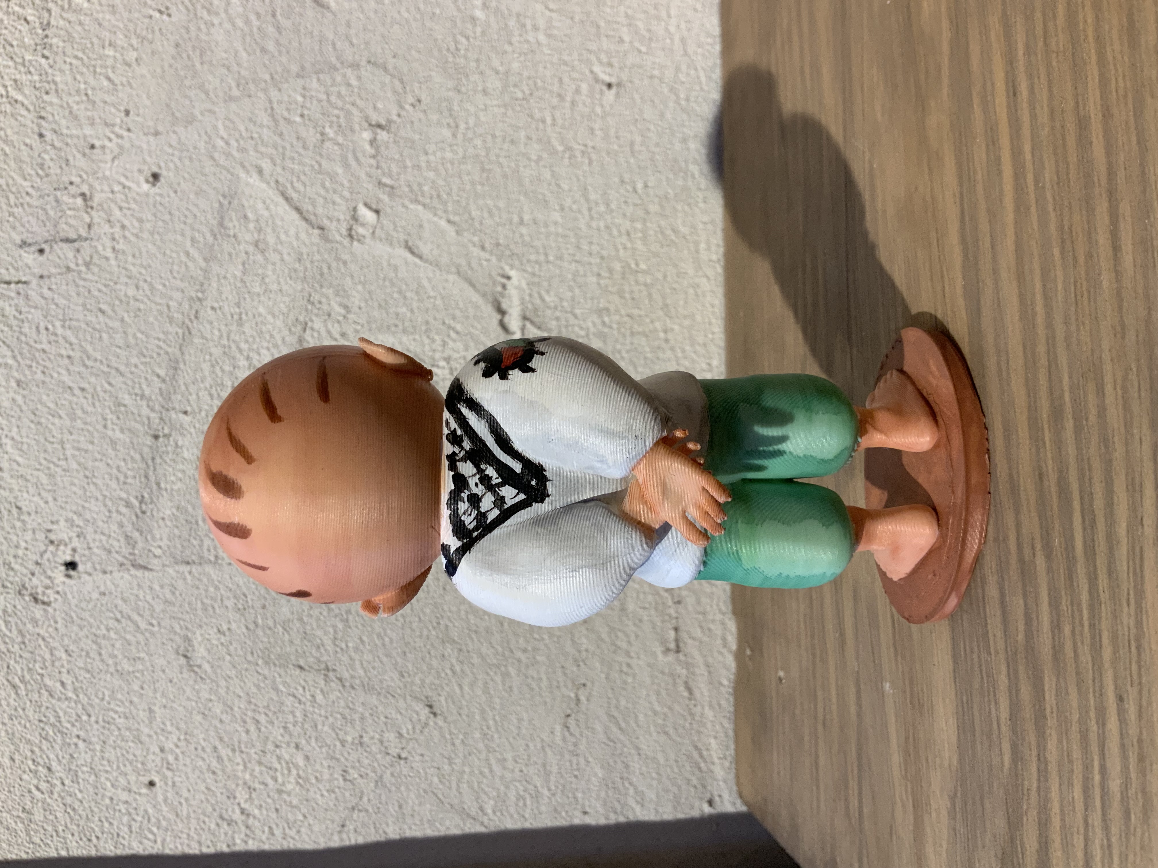This figurine represents the iconic character “Handala,” the Palestinian child who turned his back to the world to remain a witness to justice and freedom. With his simple yet powerful stance, he embodies resilience, nostalgia, and the preservation of Palestinian identity.