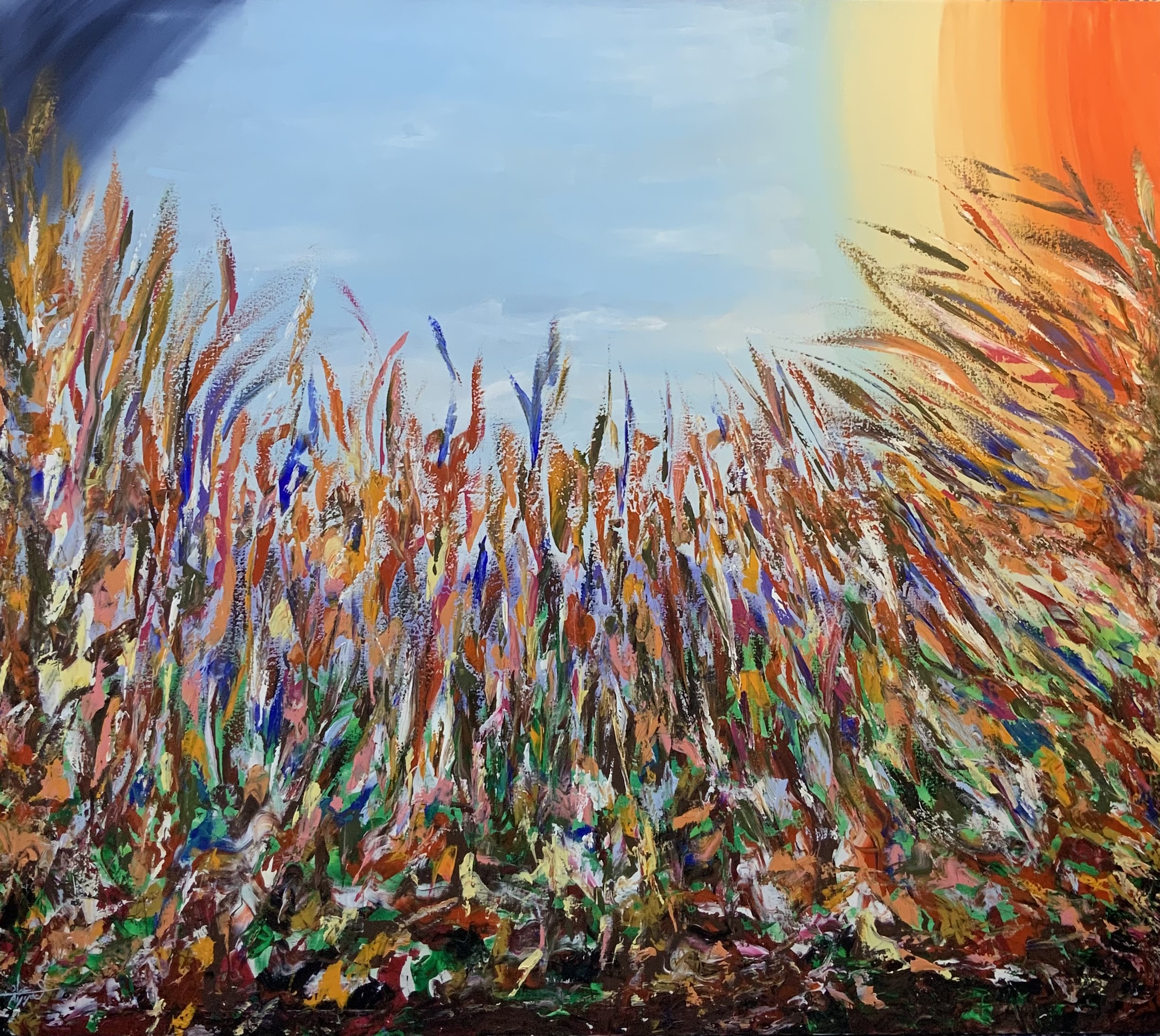 An abstract celebration of nature’s vitality, this painting bursts with energetic brushstrokes and vibrant hues. The foreground resembles wild grasses or blooming flowers in full flourish, rendered in reds, yellows, greens, and purples. These forms stretch upward into a calm, pale blue sky, creating a harmonious contrast between motion and serenity. The piece evokes a sense of growth and seasonal joy, capturing nature at its most expressive.