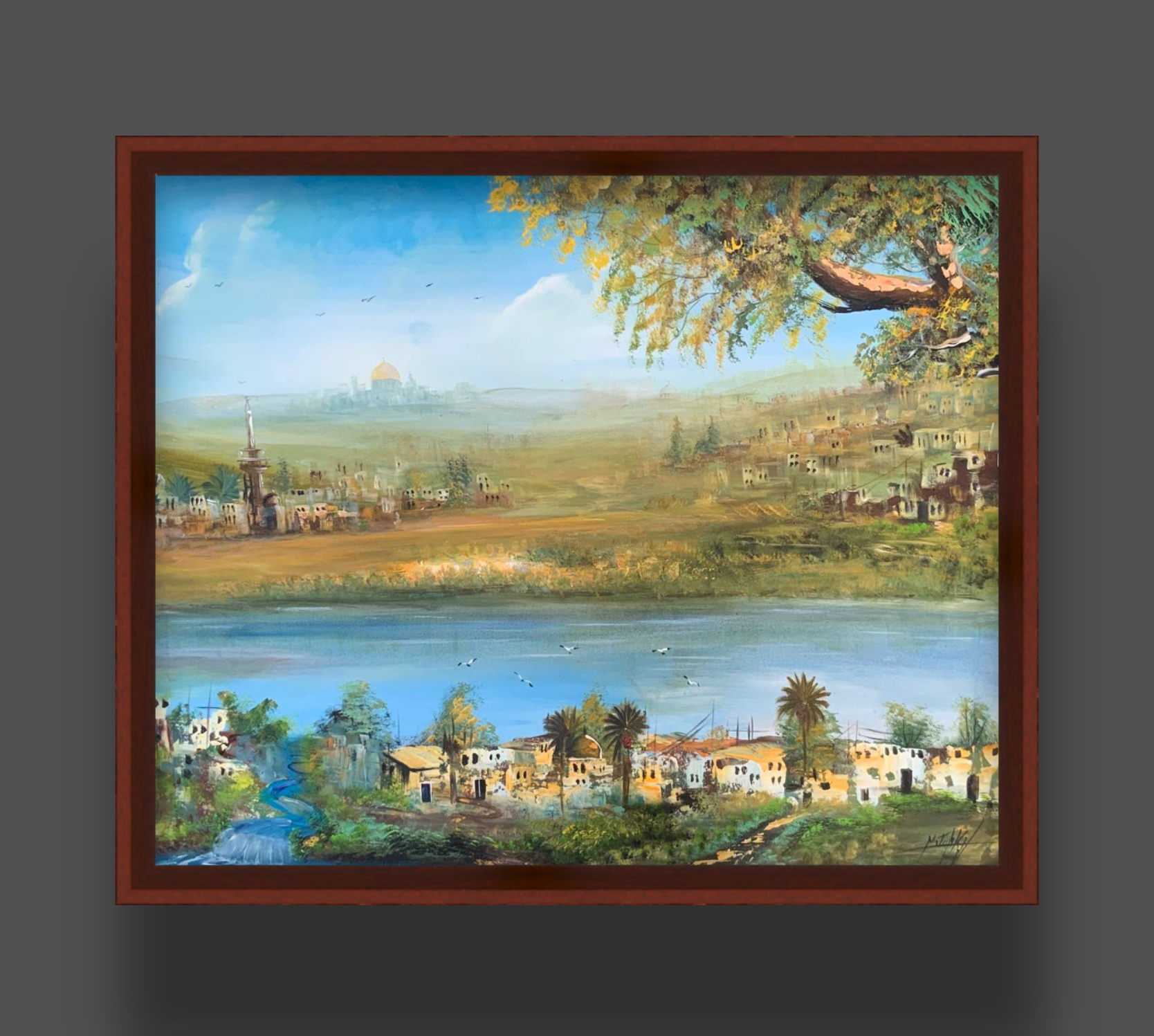 3. Contrast of Natural and Architectural Elements: The painting balances the splendour of nature (the river, palms, the leafy tree) with the depth of civilization and history (traditional houses and the historic/religious landmark on the horizon). This adds a narrative dimension to the work, making it a piece rich in visual and emotional content.