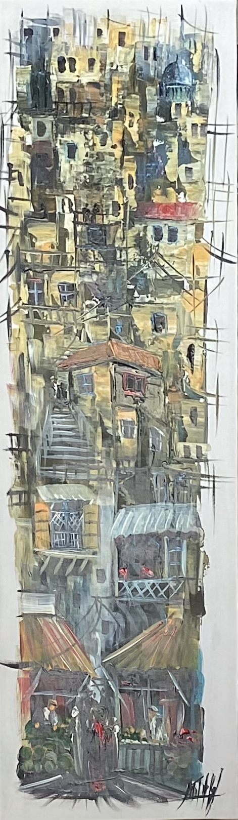 The painting portrays a lively scene from old Amman’s markets, where traditional wooden kiosks overflow with fresh fruits and vegetables. The atmosphere is intimate and authentic, capturing the simplicity and rhythm of daily life as people move between the stalls. Olive-green tones dominate the composition, giving it a nostalgic and earthy warmth that evokes the charm of old alleyways and the scent of rain on stone.