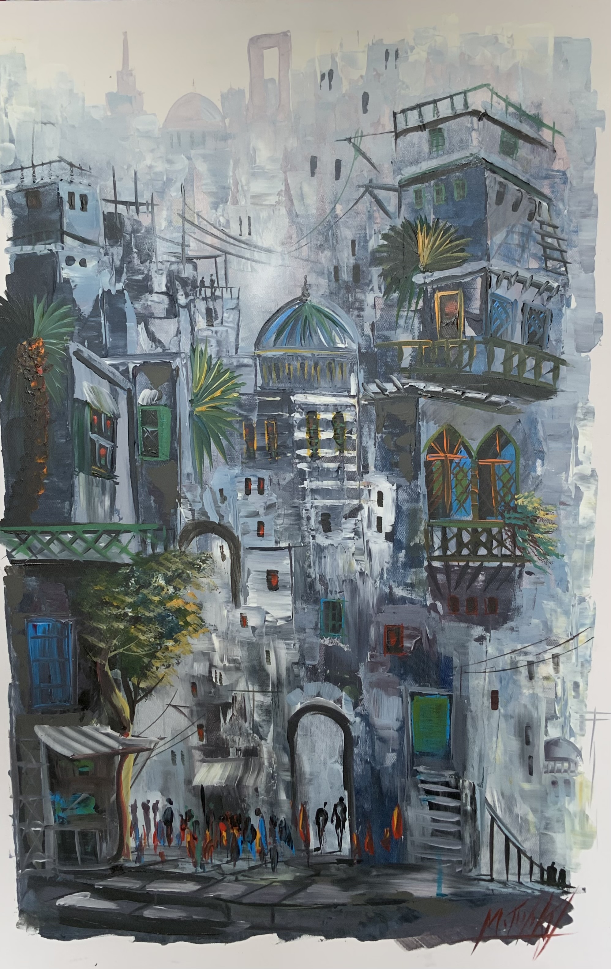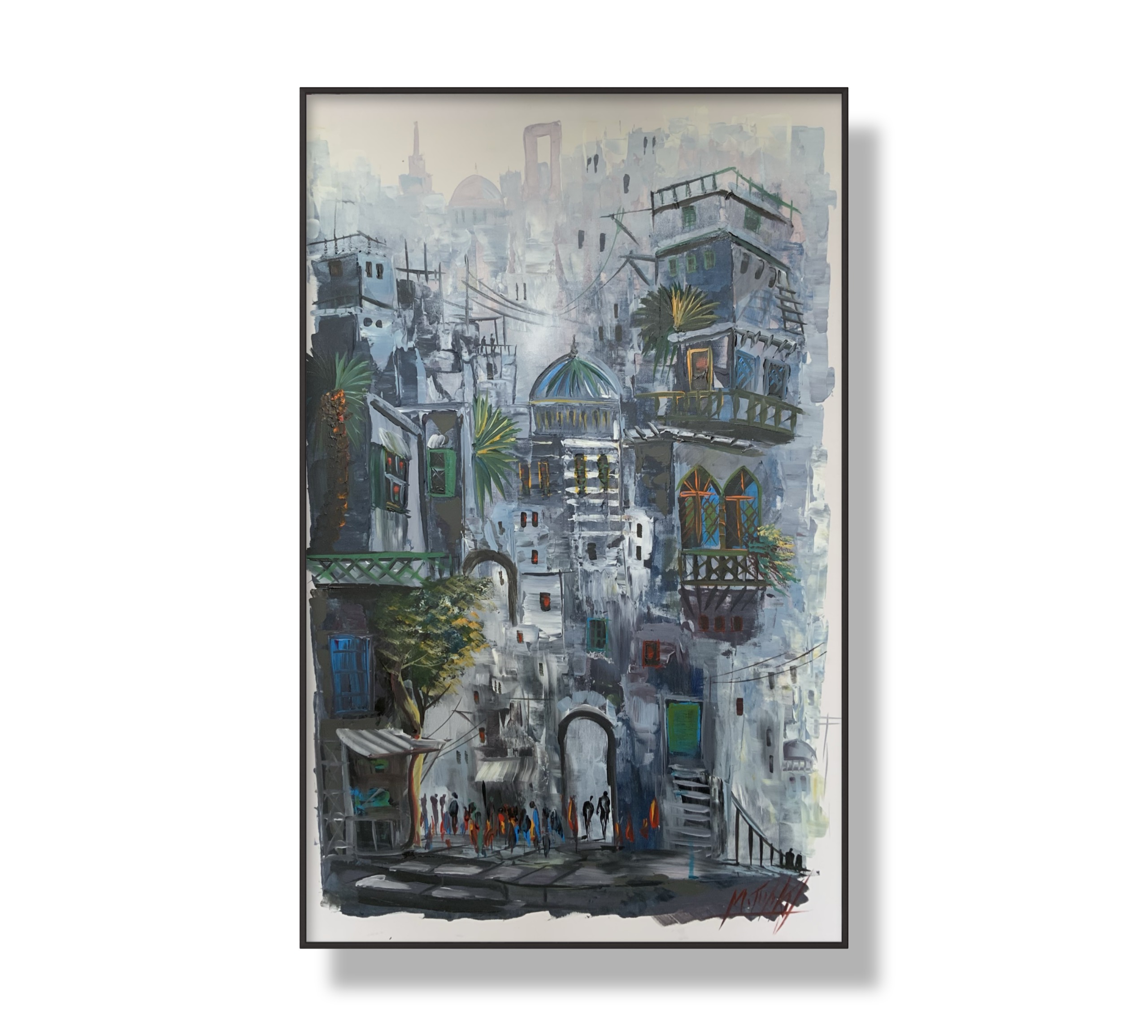 This painting depicts an old city wrapped in mist and tranquility, where stone houses blend with domes and wooden balconies in a poetic, serene composition. Shades of gray dominate the scene, softened by gentle touches of green and blue that bring warmth and life. Small figures at the bottom add a sense of movement, as if the city is quietly awakening to the footsteps of its people.