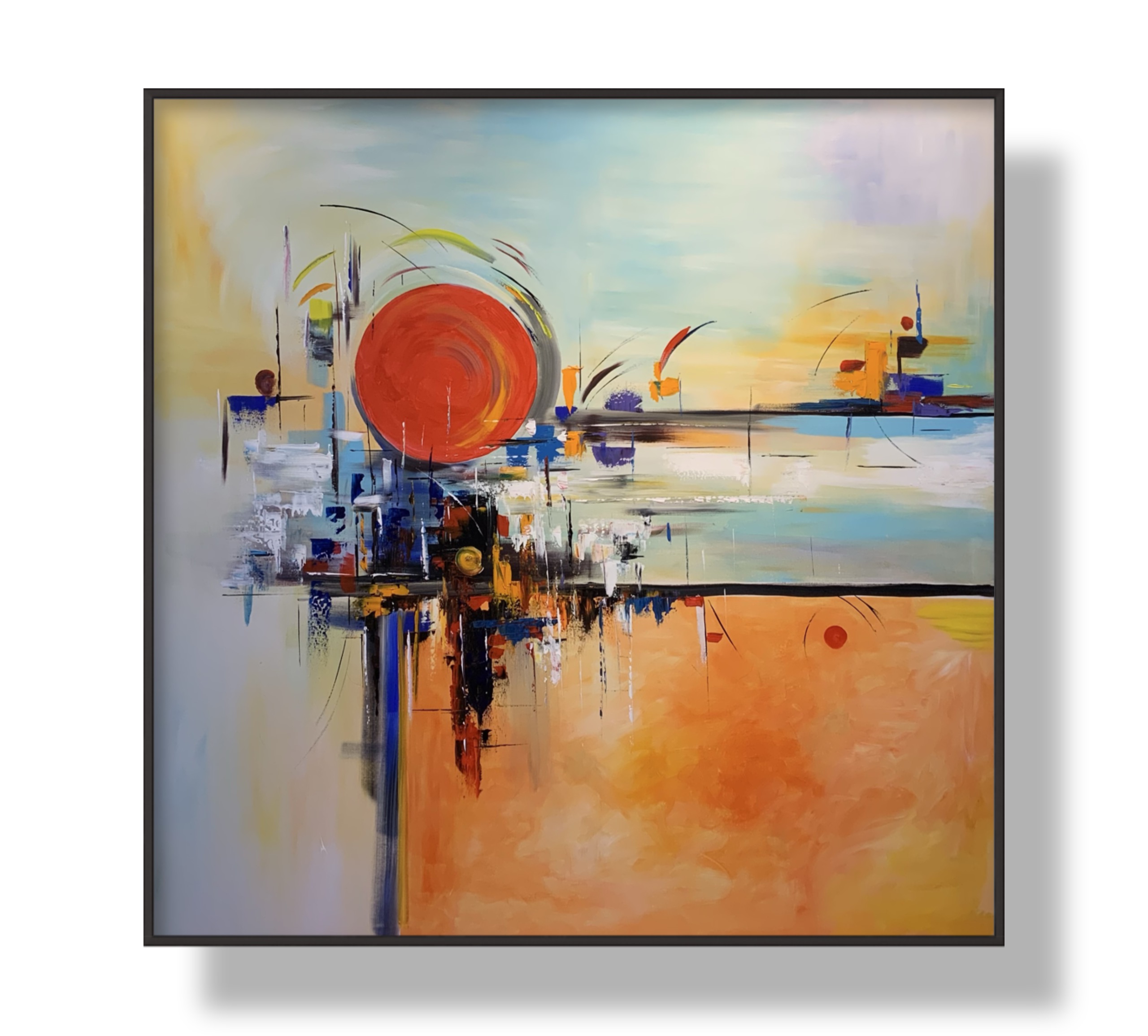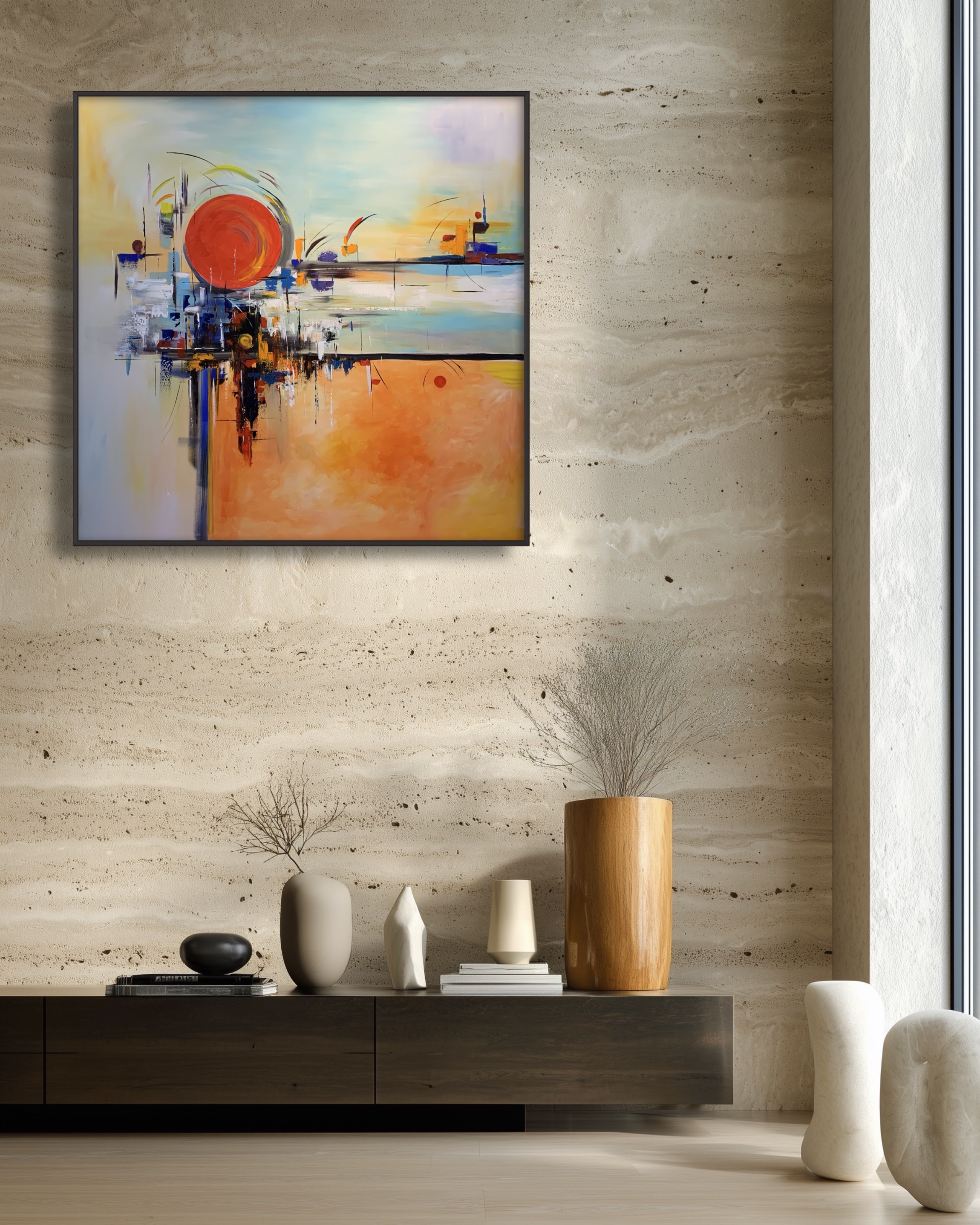 This painting captures an imagined sunrise through a contemporary abstract lens, where a bold red circle meets warm and cool color fields in visual harmony. The dynamic lines and fragmented forms suggest a distant cityscape or horizon, while the lower reflective area adds depth and a sense of spatial continuity, creating a luminous and contemplative atmosphere.
