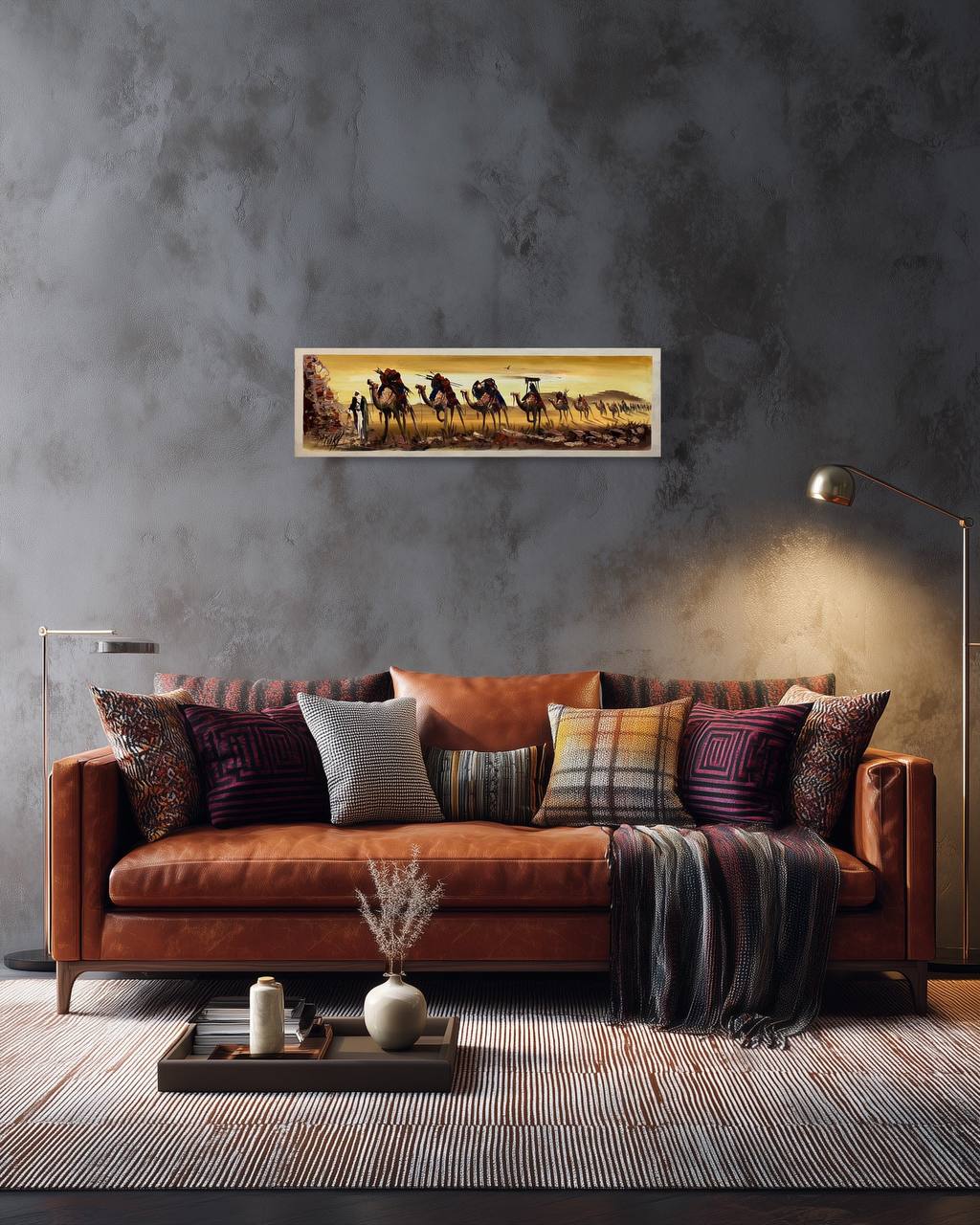 2. Perspective and Visual Depth: The artwork highlights the desert's vastness by gradually decreasing the size of the camels toward the horizon, creating the illusion of a very long caravan heading into the distance.