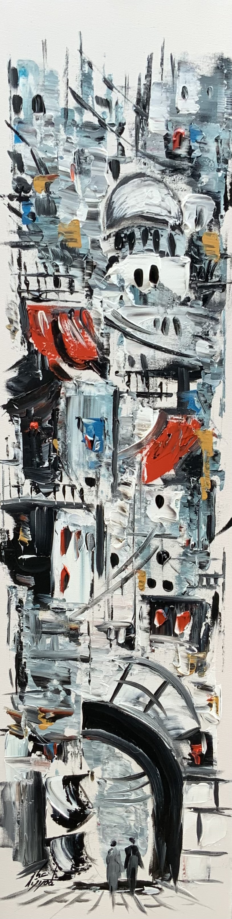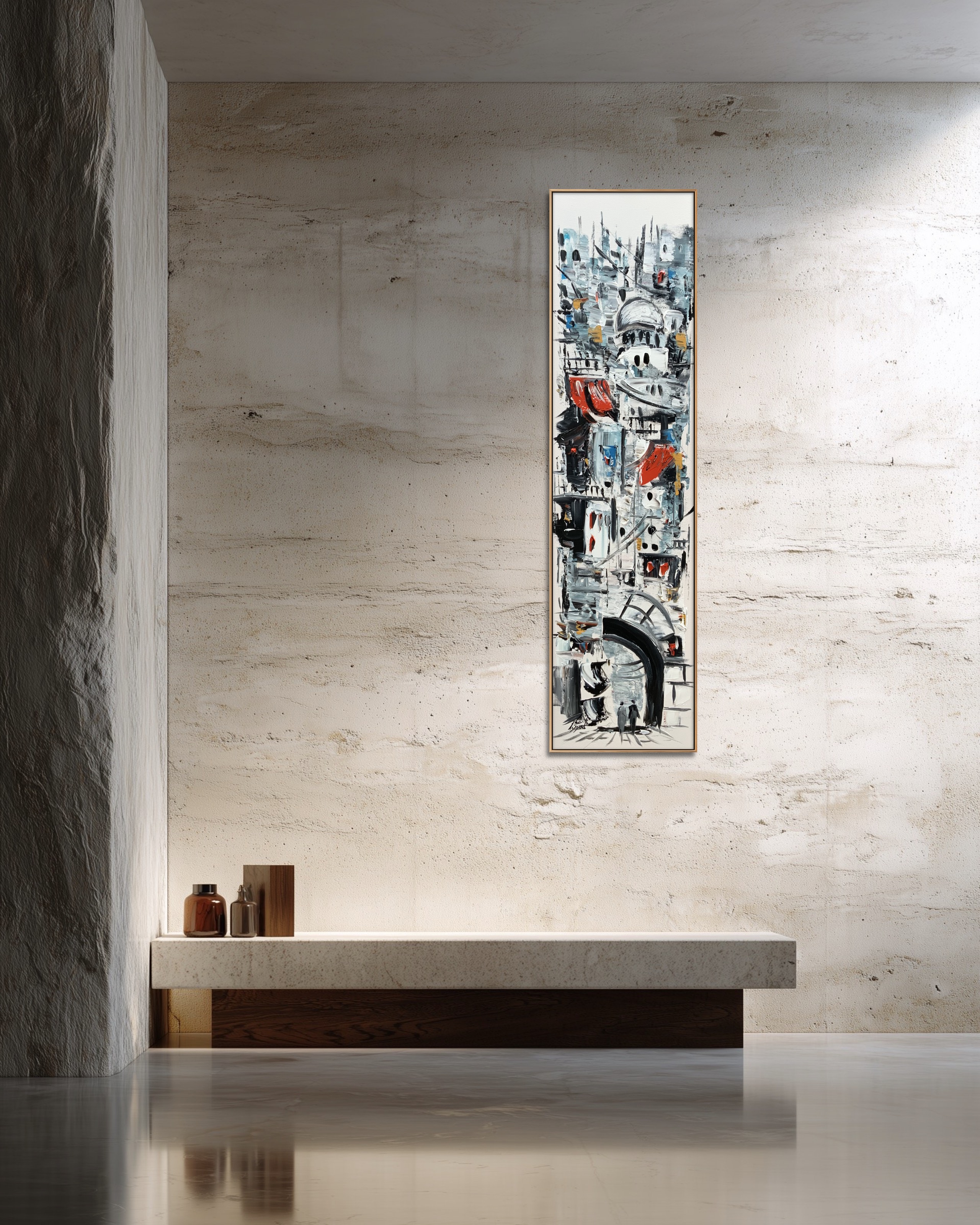 This painting takes us on a visual journey through lively alleyways, where blue and white houses embrace one another in harmony. Details flow like silent music, leading to an ancient archway that tells stories of passersby. Warm accents bring a sense of life and intimacy within a richly layered composition.