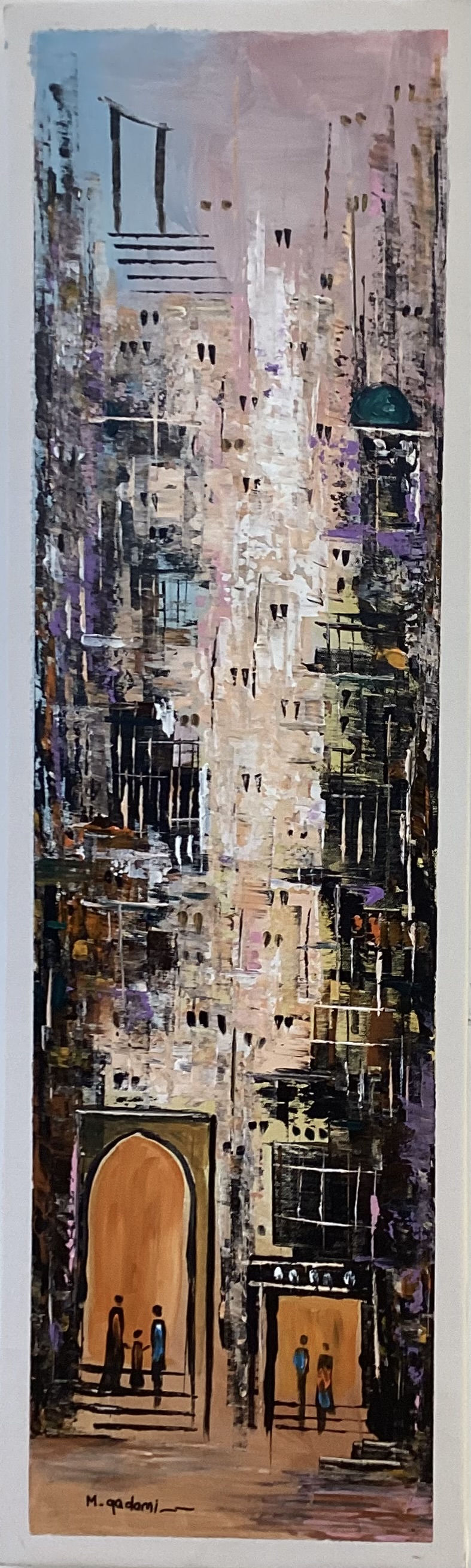 This painting beautifully captures Eastern Amman with the Temple of Hercules standing proudly atop the Citadel, bathed in the soft hues of sunset. The artist uses expressive strokes of lavender and pink to portray the warmth of the setting sun reflected on the old city’s architecture. The blue and pink sky evokes the magical moment between day and night — a poetic balance of warmth and serenity.