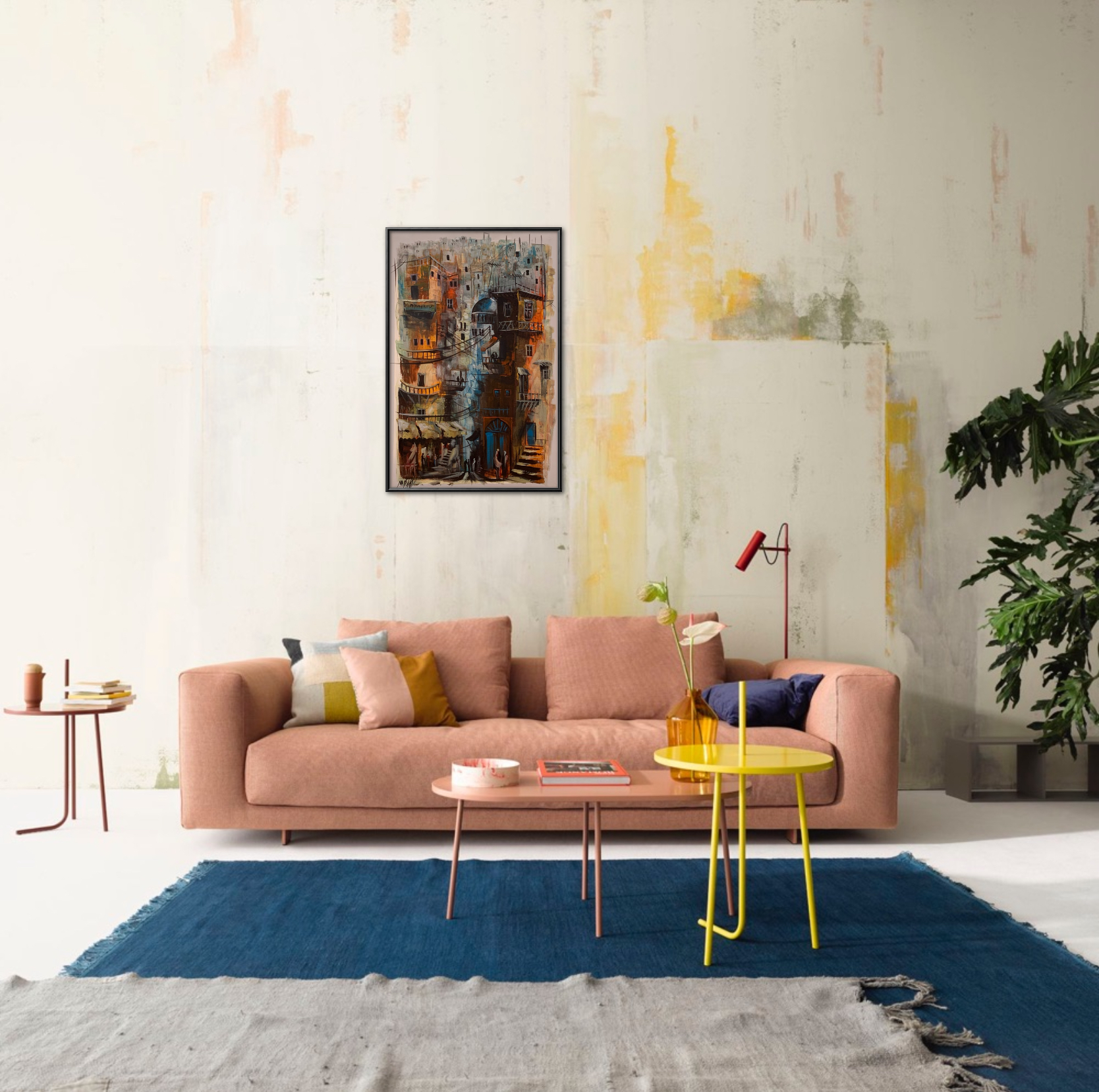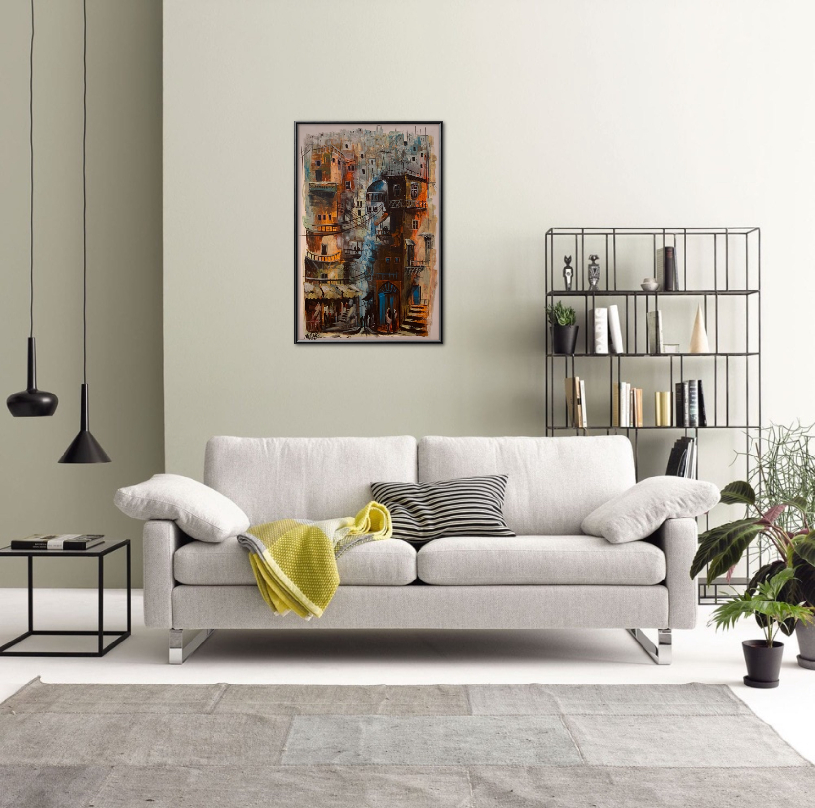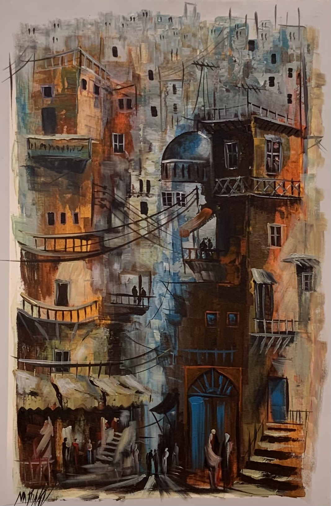 A lively painting of Amman, where traditional houses and bustling streets are filled with people whose presence radiates love and connection. The artwork captures the city’s warm soul — a blend of nostalgia and belonging — reflecting the beauty of everyday life and human closeness.