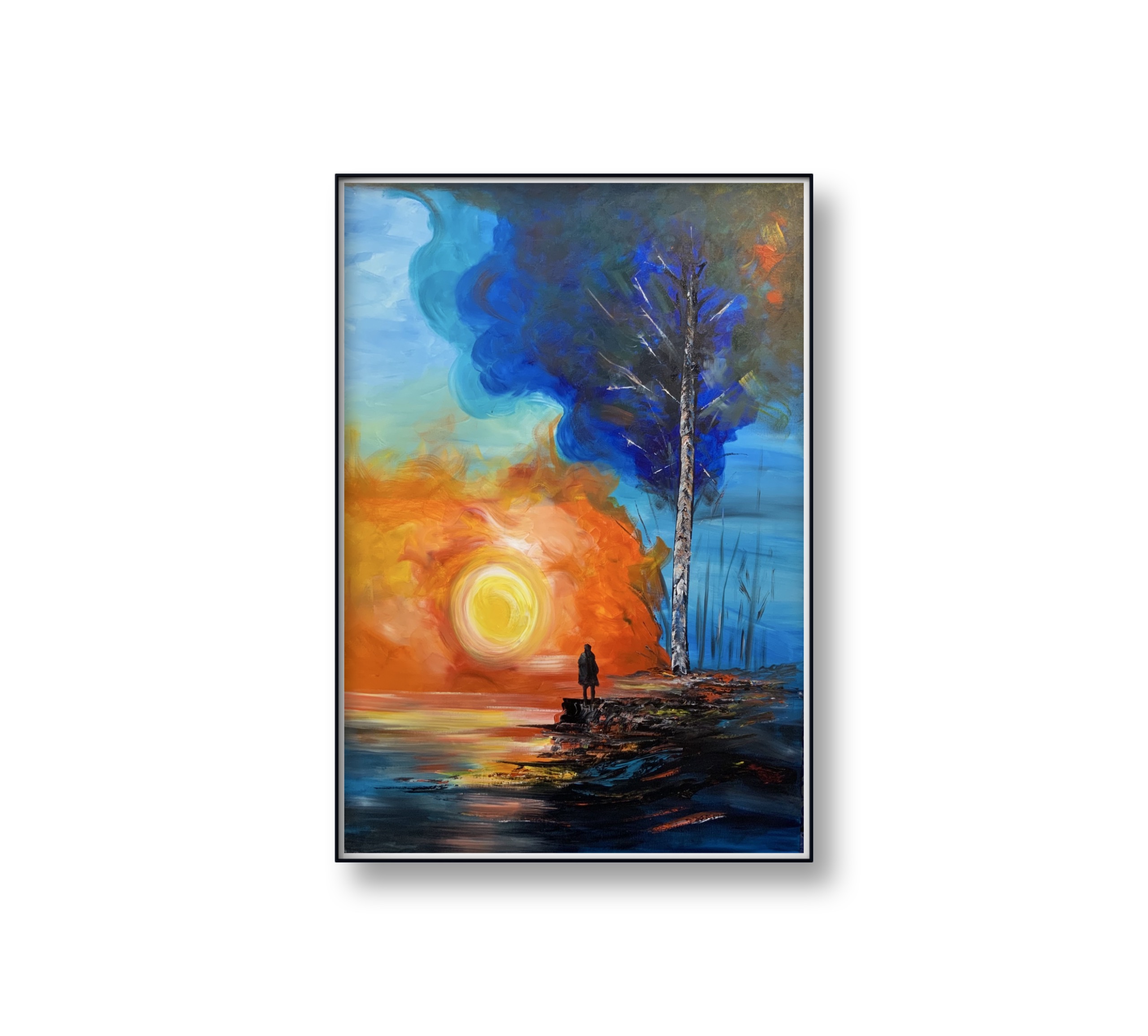 An expressive artwork that blends the warmth of the sun with the coolness of water. A solitary figure stands at the edge, contemplating a glowing sun. Fiery hues merge with deep blues, creating a poetic tension between hope and solitude, beginnings and endings. The tall tree adds a symbolic sense of strength and resilience against the passage of time.