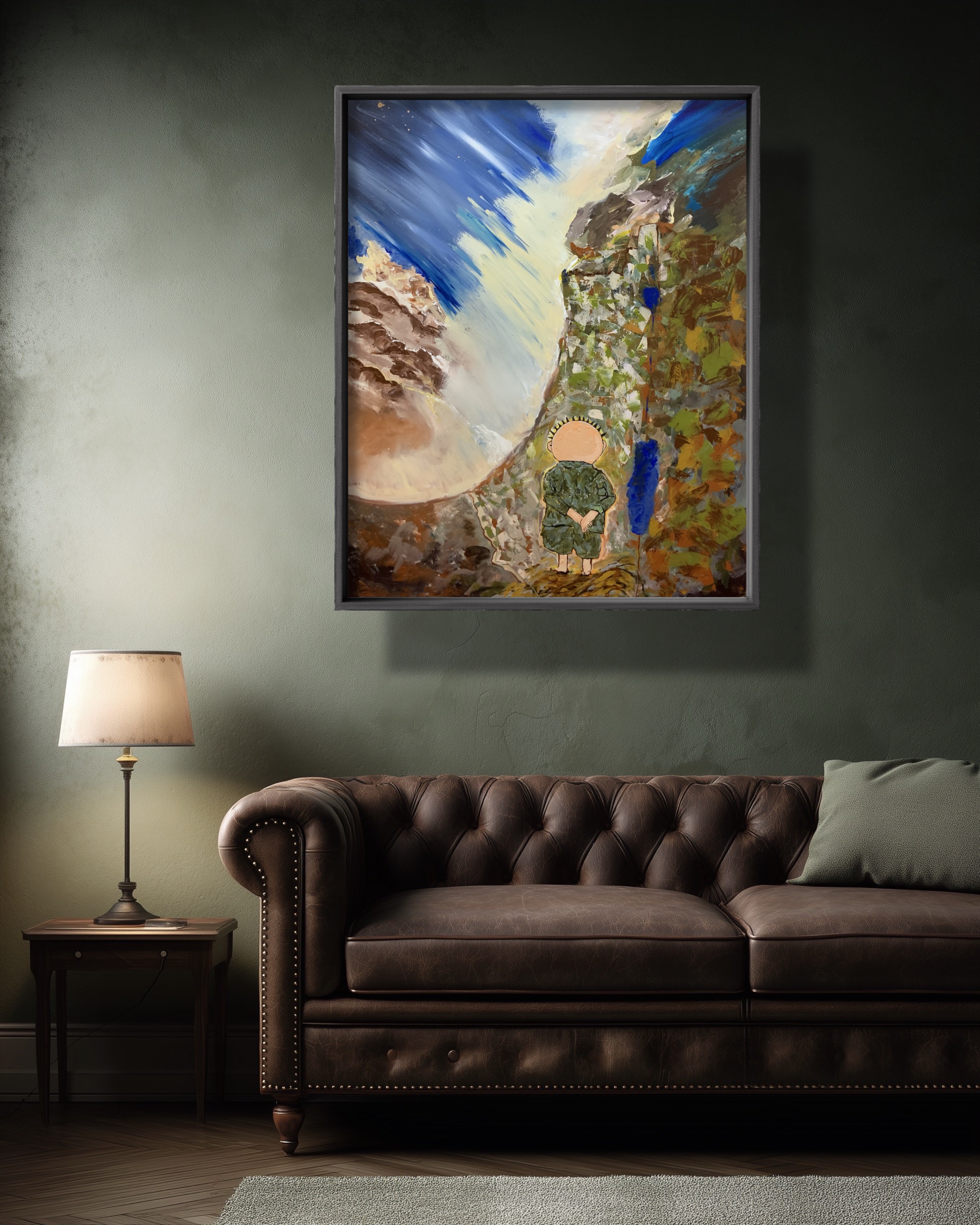This painting captures a silent moment of inner confrontation, where a child stands at the edge of a vast natural landscape—small in scale, yet grounded in presence. Bold brushstrokes and striking contrasts reflect the tension between innocence and strength, humanity and the immensity of the world, inviting deep contemplation and interpretation.