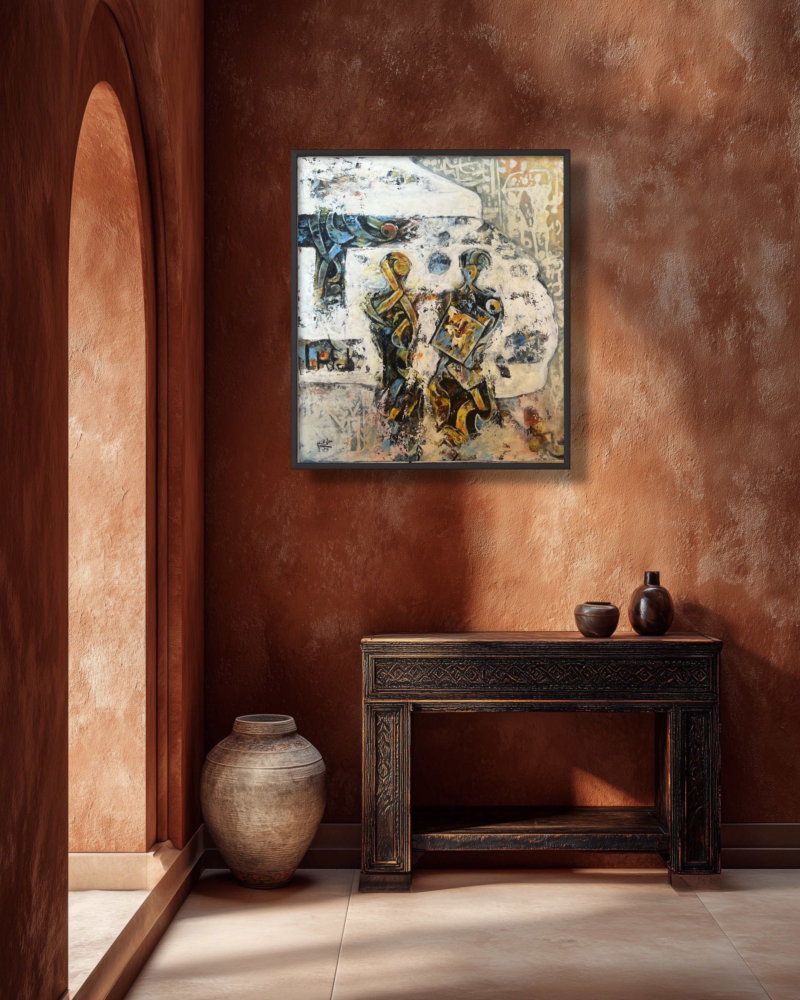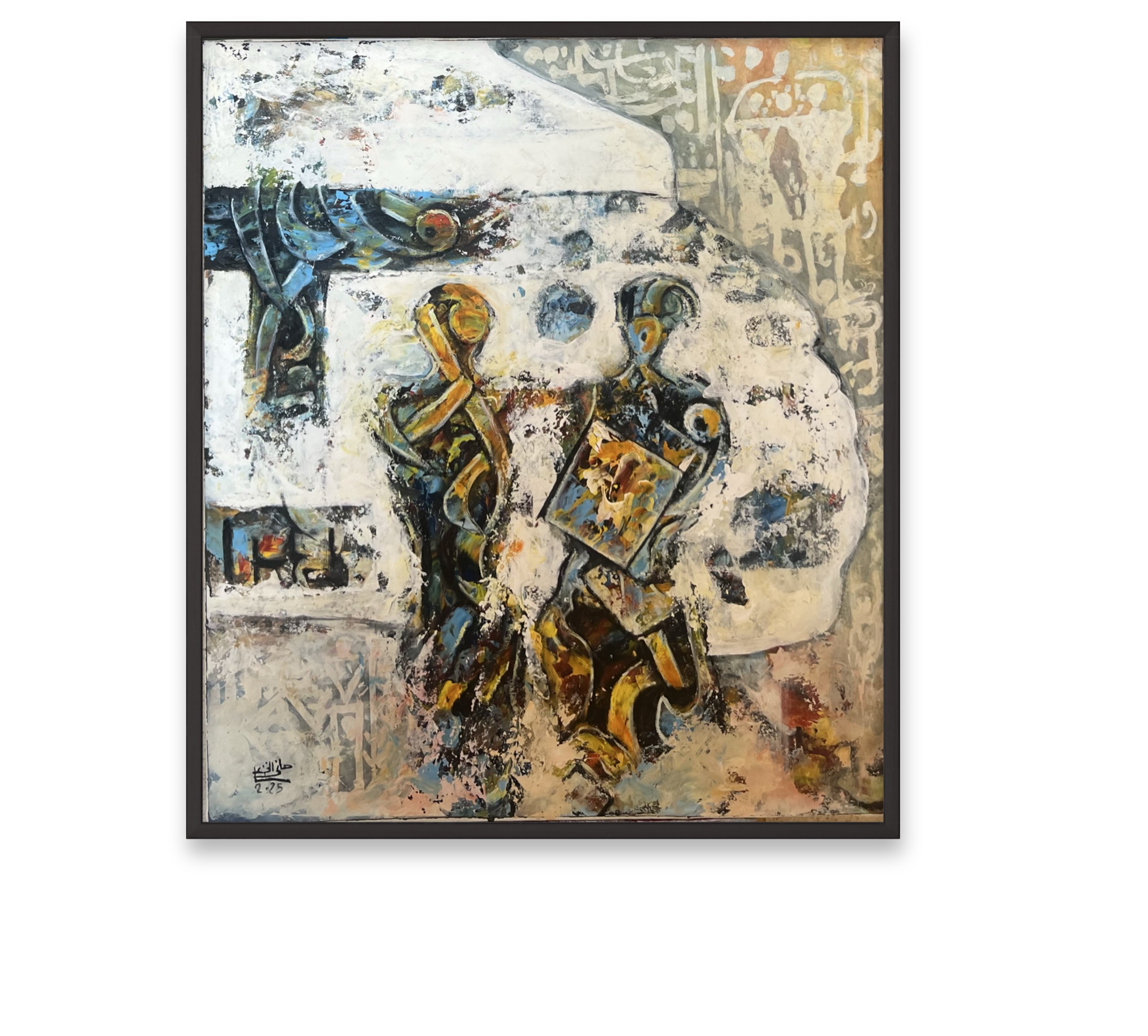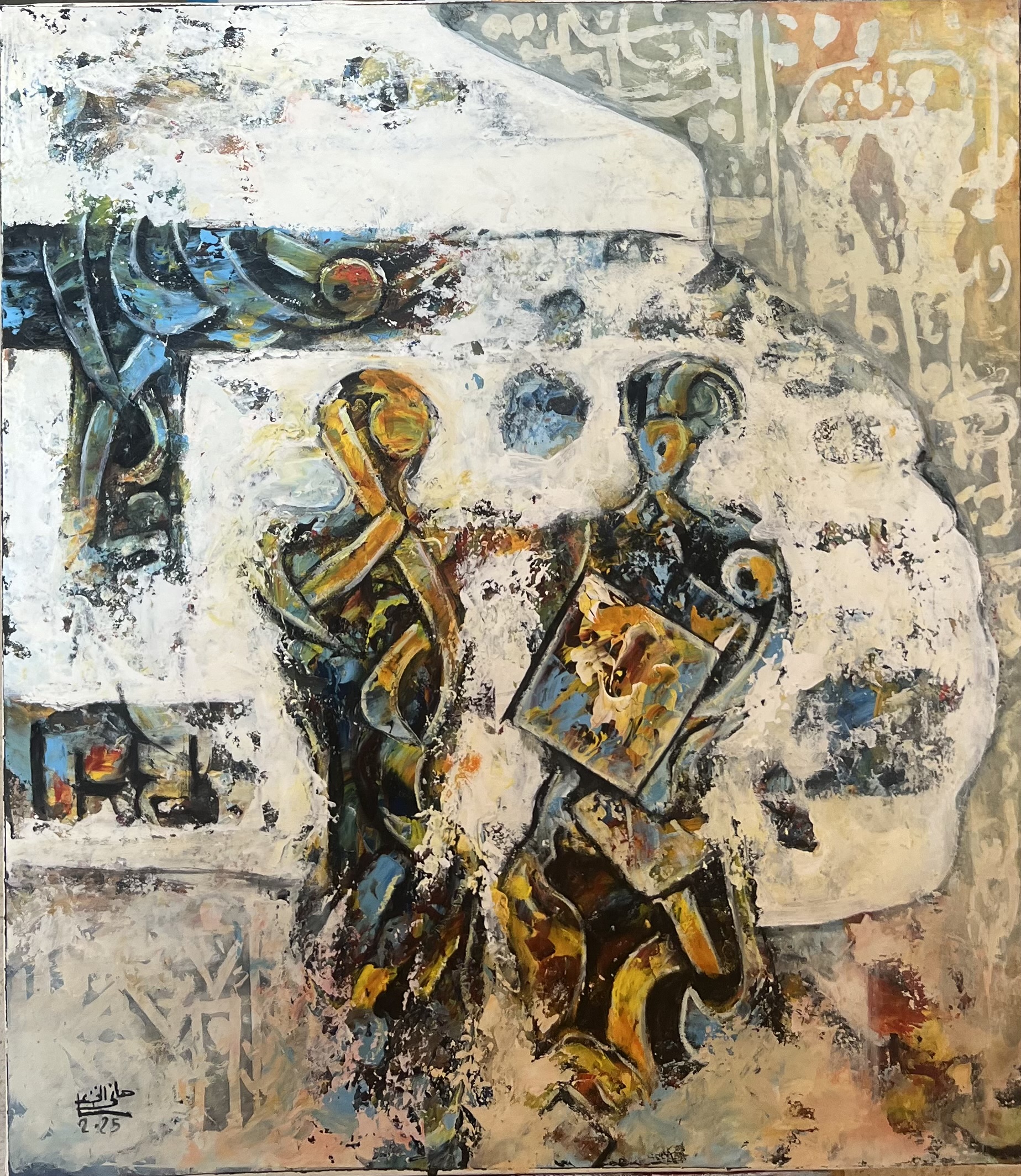 This painting depicts a silent dialogue between two figures walking through an open space, where human forms intersect with architectural traces and faint calligraphic symbols. The expansive white areas create a sense of calm and emptiness, contrasted by warm, expressive brushstrokes that suggest movement and memory. The work reflects a fleeting human encounter suspended between past and present.