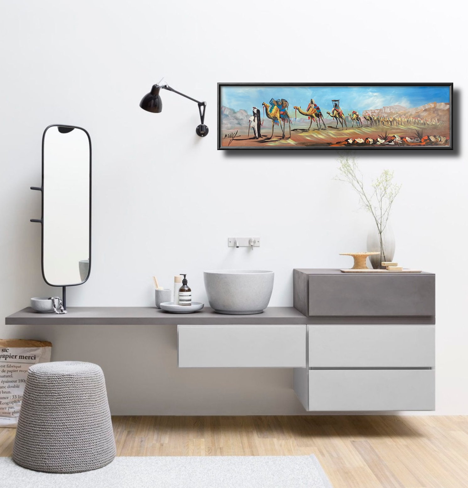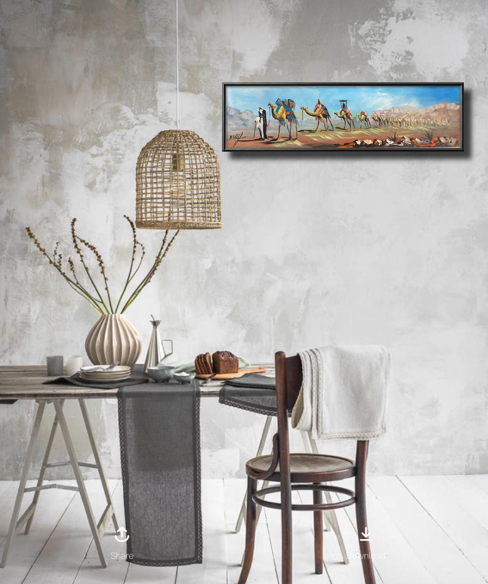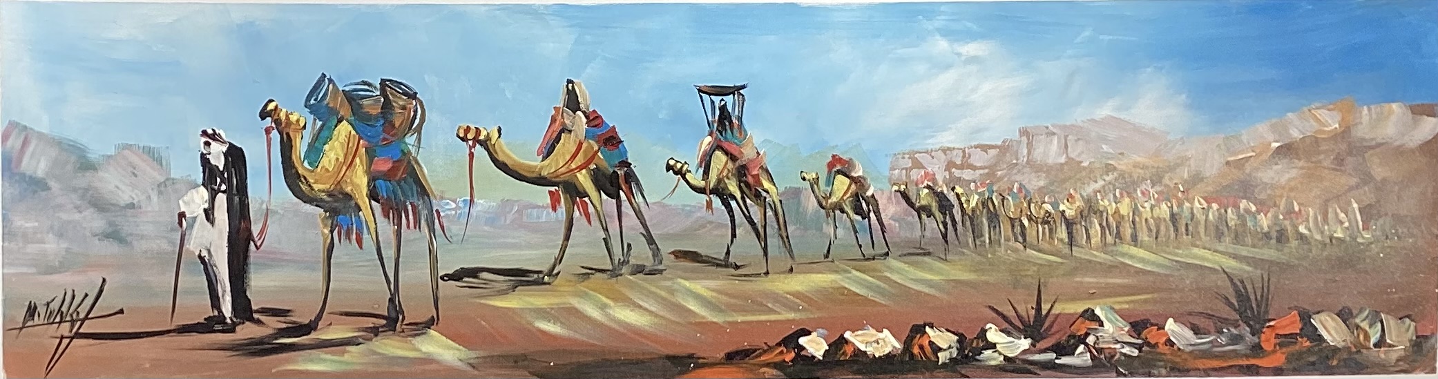 This painting unfolds the vast golden desert, where a camel caravan moves in a rhythmic line, symbolizing ancestral journeys through time. The clear blue sky creates harmony between the warmth of the earth and the purity of the heavens, giving the artwork a sense of freedom and infinite expanse. The scene captures both the stillness of the desert and the vitality of life.