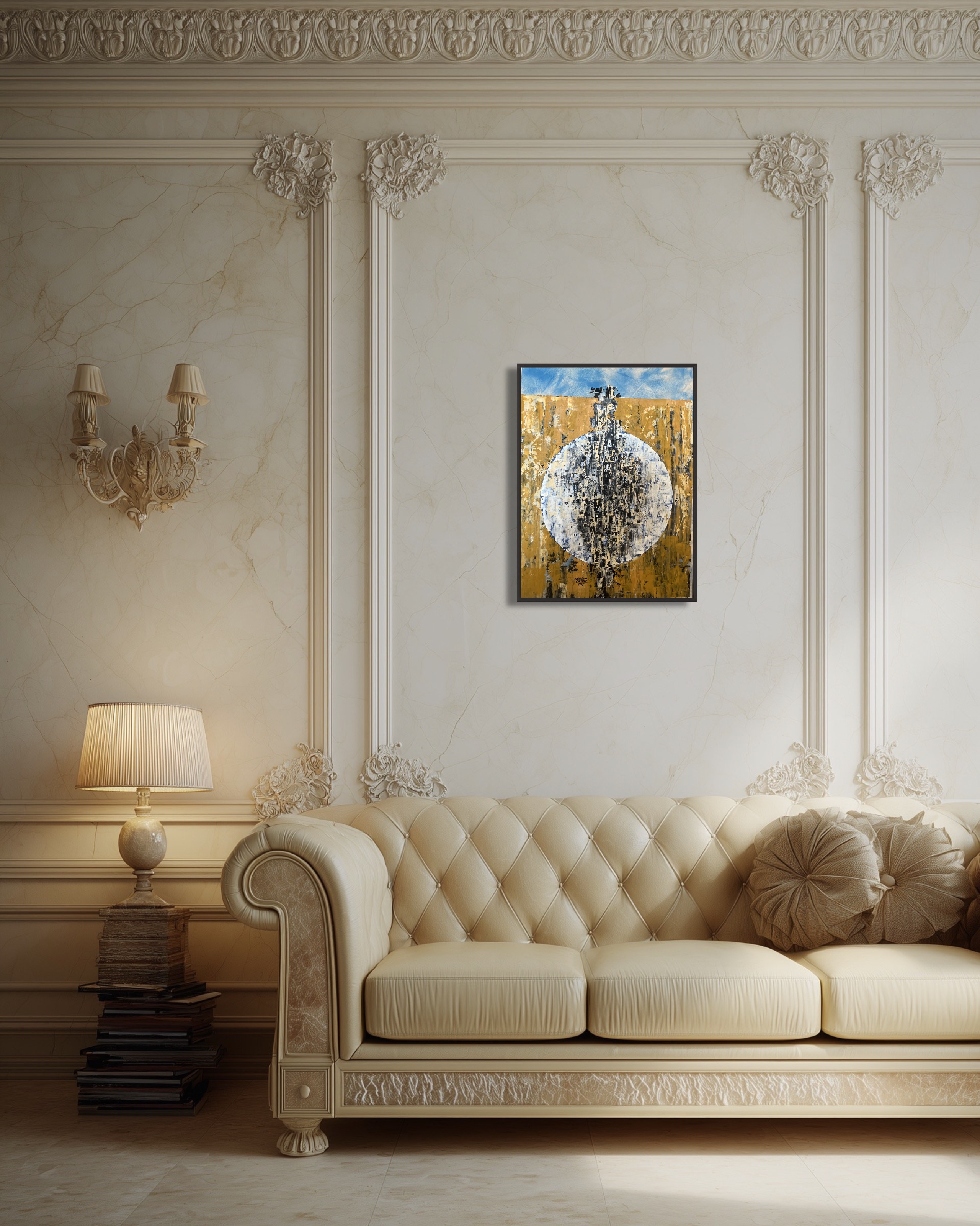 The painting revolves around a central circle that acts as a visual gateway between sky and earth. Vertical lines and rough textures intersect in an abstract dialogue, reflecting a balance between strength and calm. The artwork carries a symbolic sense of stability amid transformation.