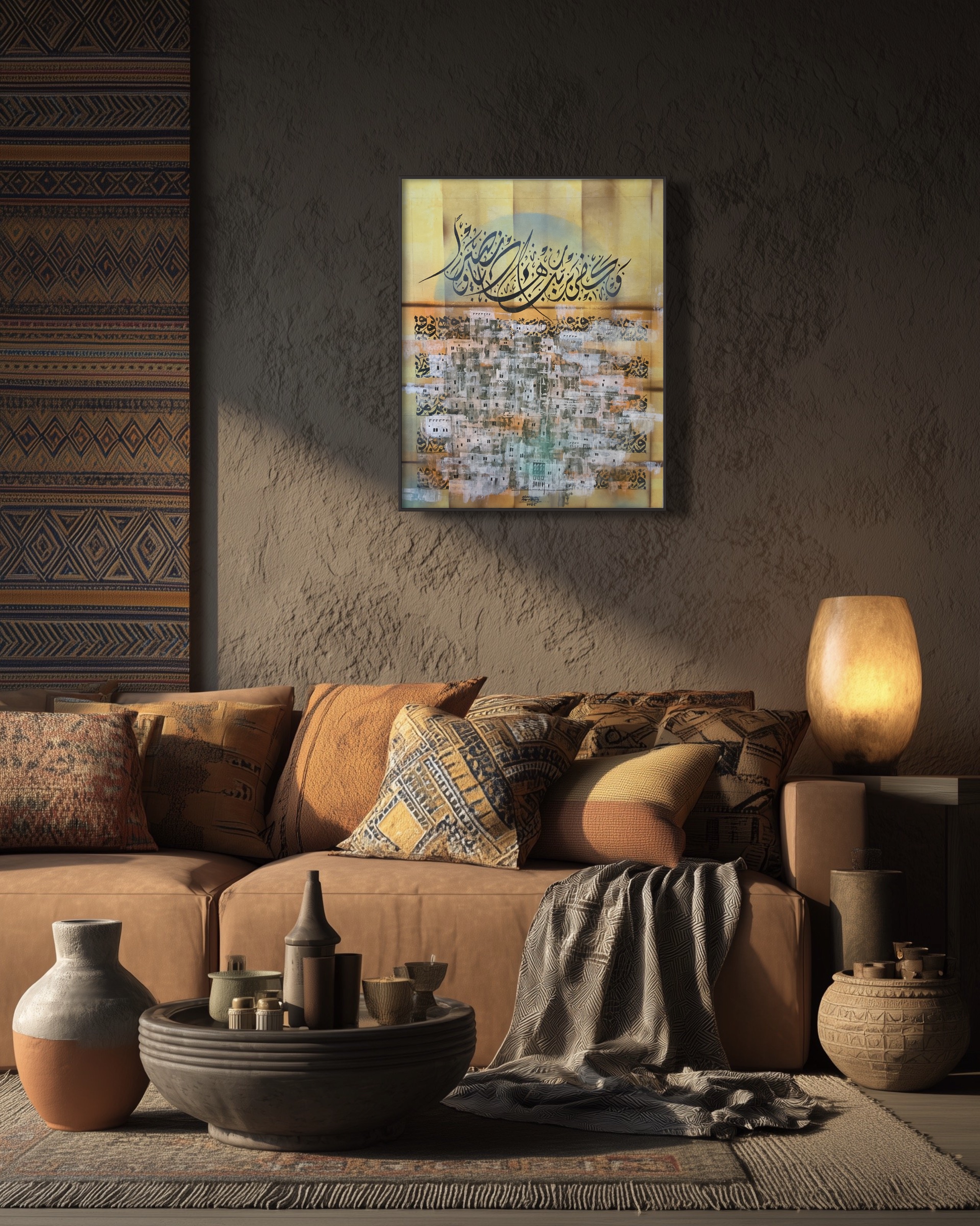 In this artwork, layers of stone-built city structures merge with the flowing Arabic calligraphy above, as if the script shelters the architecture and gives it a voice. The warm golden background radiates a spiritual glow, while the clustered houses reflect the memory and intimacy of old neighborhoods. The letters are not mere ornament—they are a living rhythm embracing the scene with visual harmony.