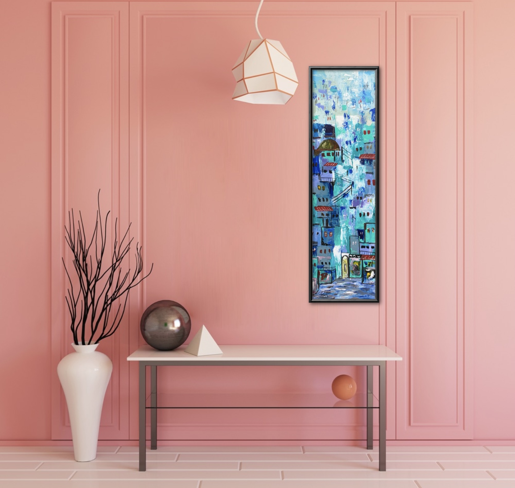 Abstract forms intertwine with the outlines of a city bathed in turquoise blue, creating a visual world between reality and imagination. The flowing lines and serene tones reflect emotional depth and inner calm, as if the city rests within a sea of light and dreams.