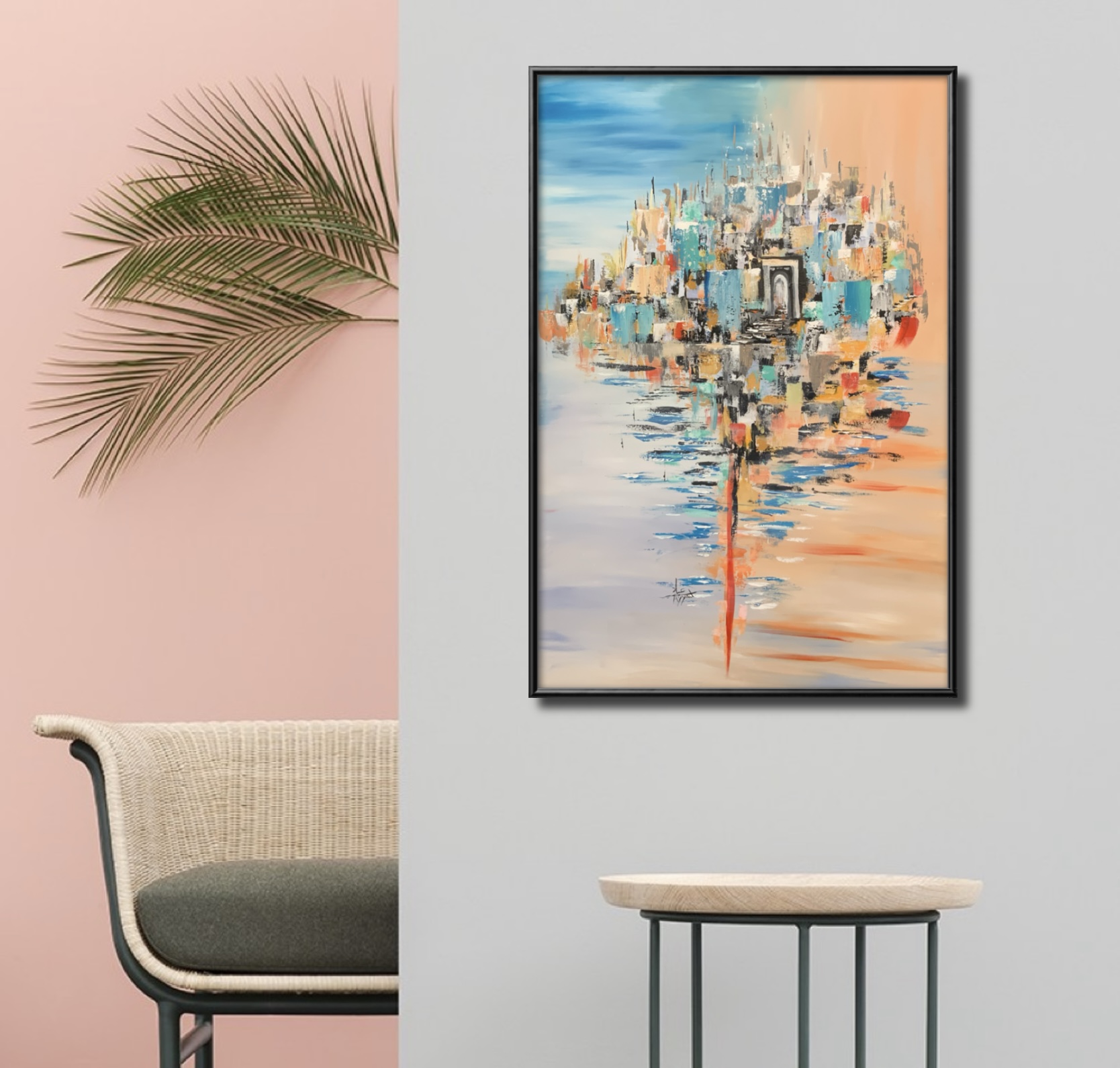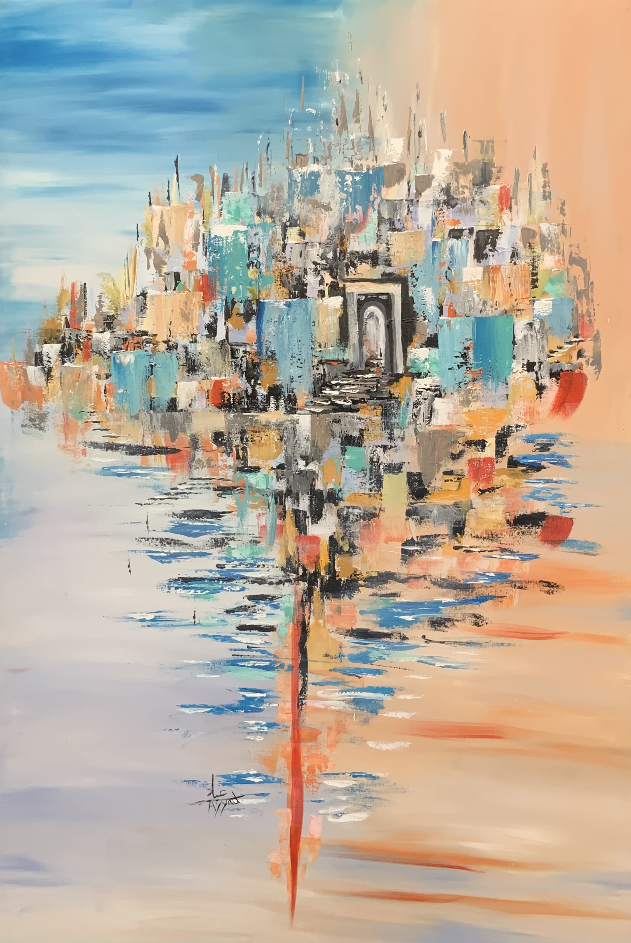 An abstract painting centered around a dreamlike architectural form, mirrored below as if gazing into a lake of memories. The harmonious blend of blue, orange, and gray evokes a balance between stillness and motion, while the central archway invites reflection and symbolic passage. The gradient background—from blue to peach—adds a temporal dimension, as if the city exists between dawn and dusk.