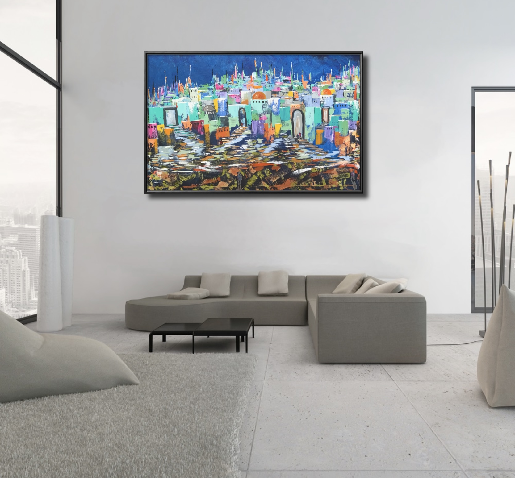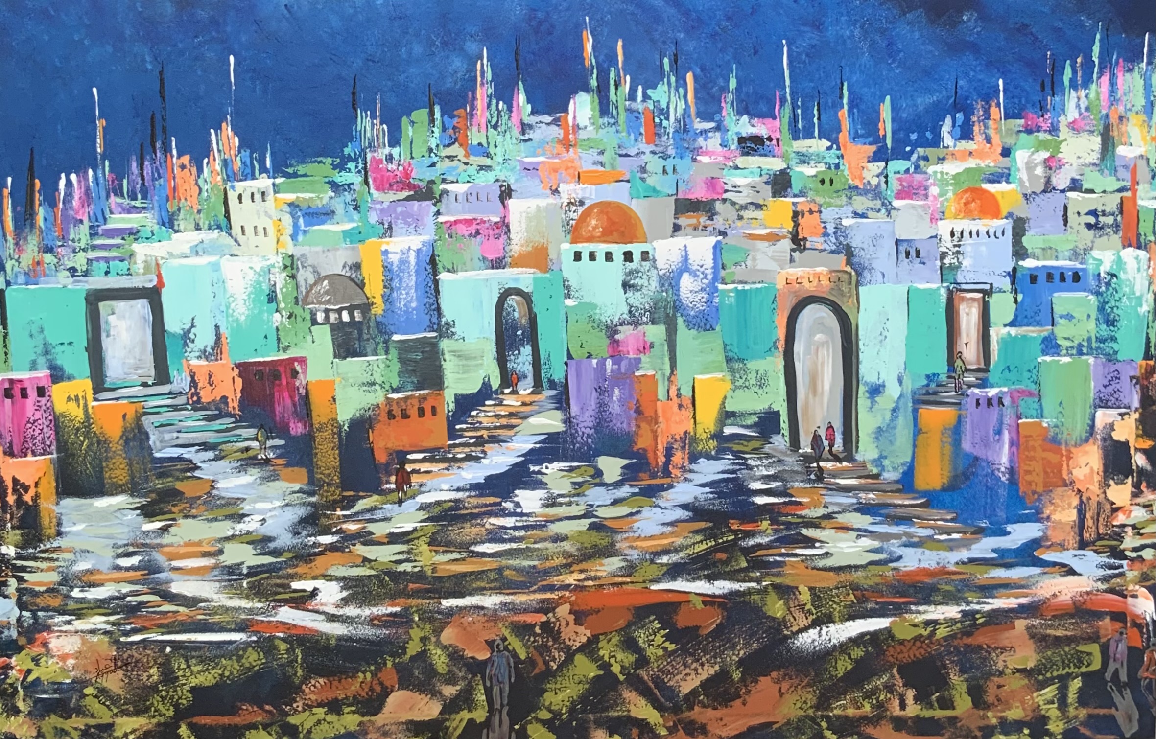This painting portrays an imaginative view of an ancient Eastern city, where colorful houses, arched gates, and winding streets come alive beneath a deep blue sky. The vibrant palette evokes nostalgia and warmth, celebrating the richness and harmony of Eastern life.