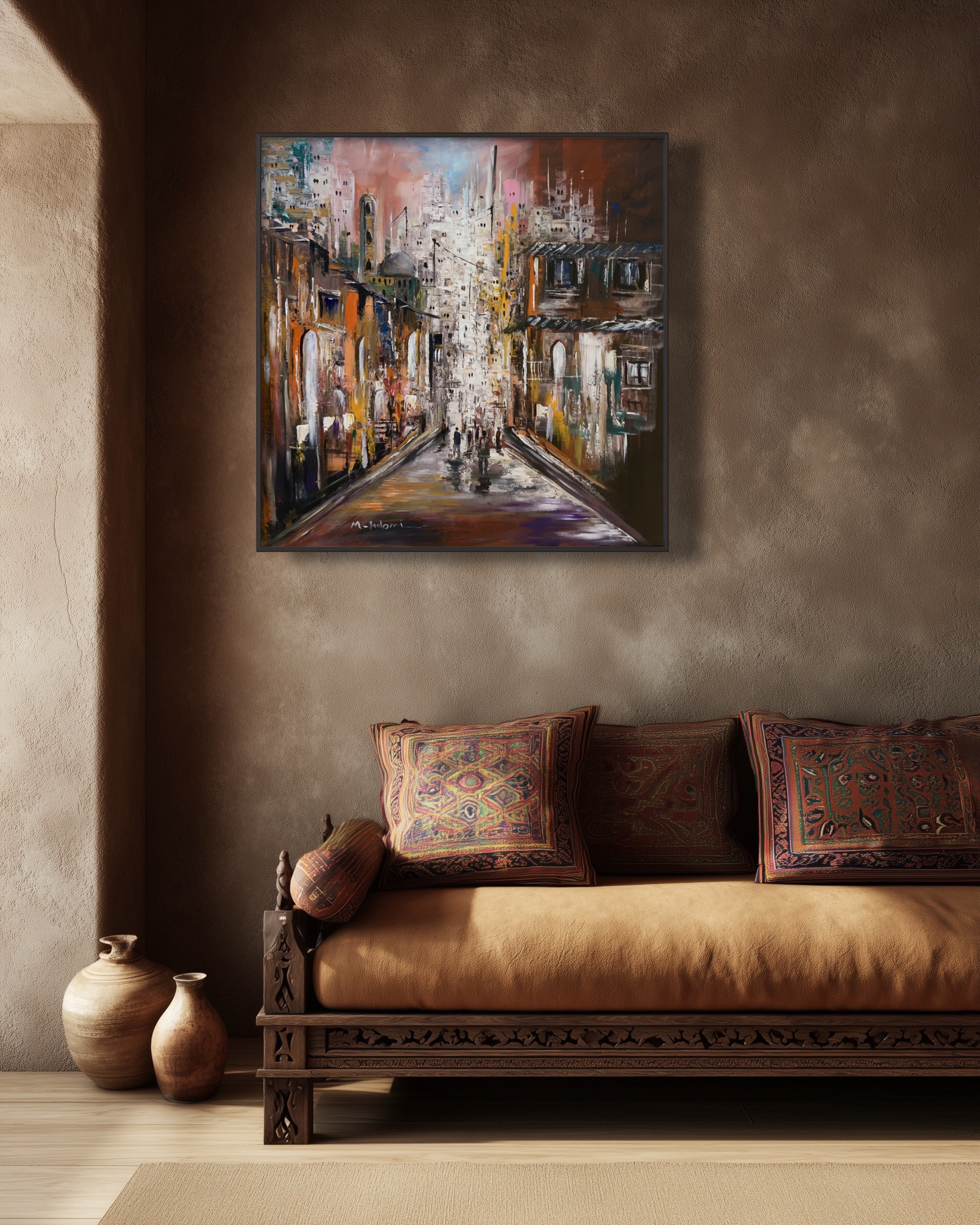 An abstract cityscape capturing the pulse of urban life, where historic architecture meets modern rhythm along a long urban passage. Warm and cool tones intertwine to reflect human movement and light reflections on the street, creating a sense of depth, nostalgia, and continuous motion.