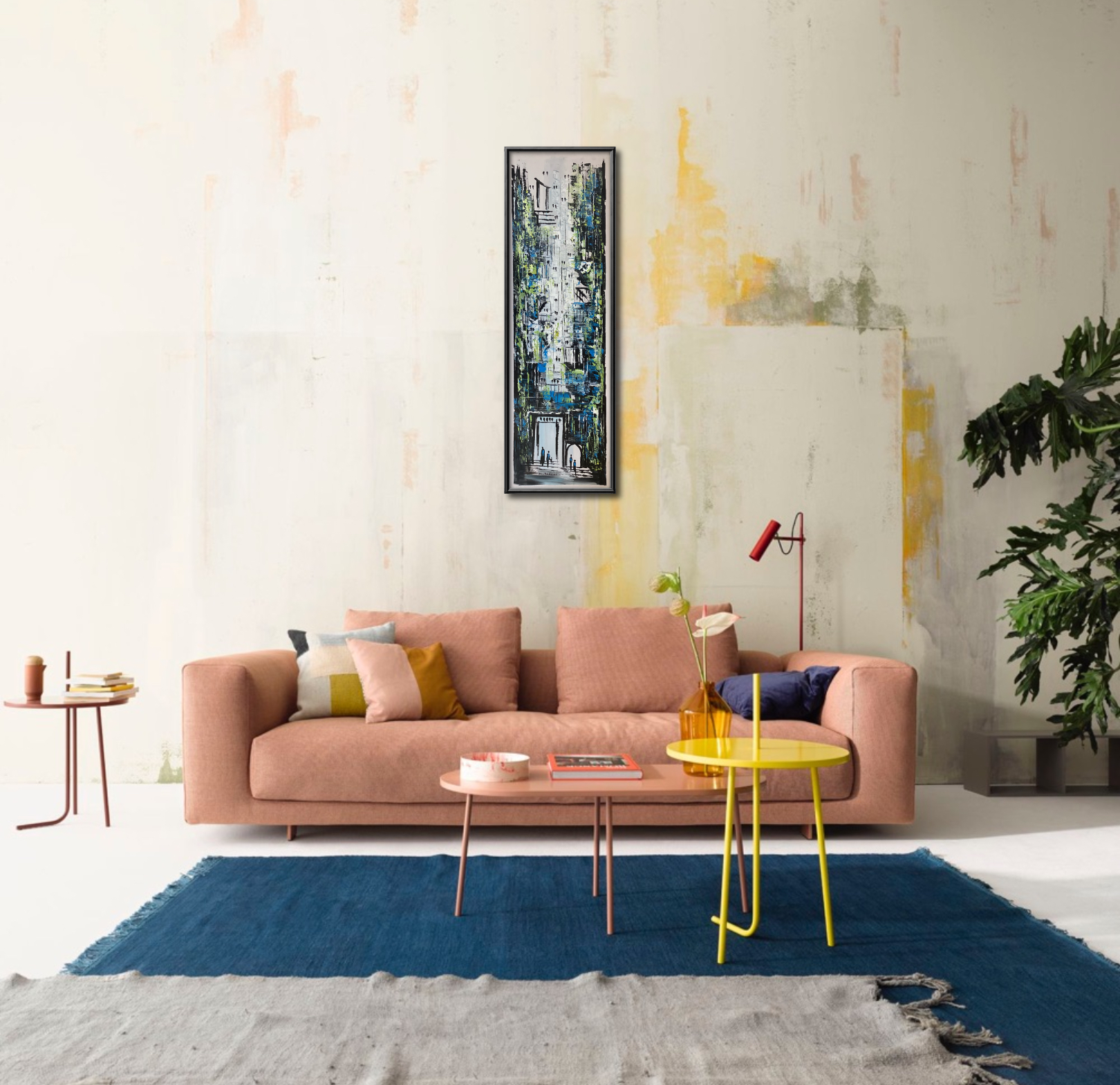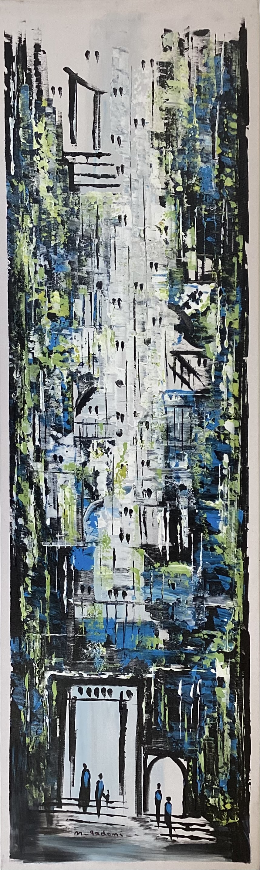 In this painting by Mohammad Qadomi, a towering abstract façade emerges through rhythmic layers of architectural form. The composition flows between obscurity and revelation, with vertical and horizontal lines intertwining to suggest height and endurance. At the base, a luminous entrance emanates light and vitality, while small human silhouettes stand before it, adding emotional depth and balance to the grand structure. The work captures the dialogue between time and space — a silent narrative of a city rising from its own memory toward the horizon.