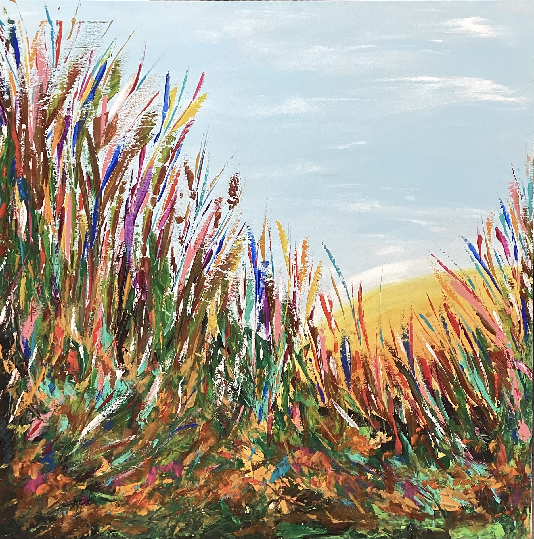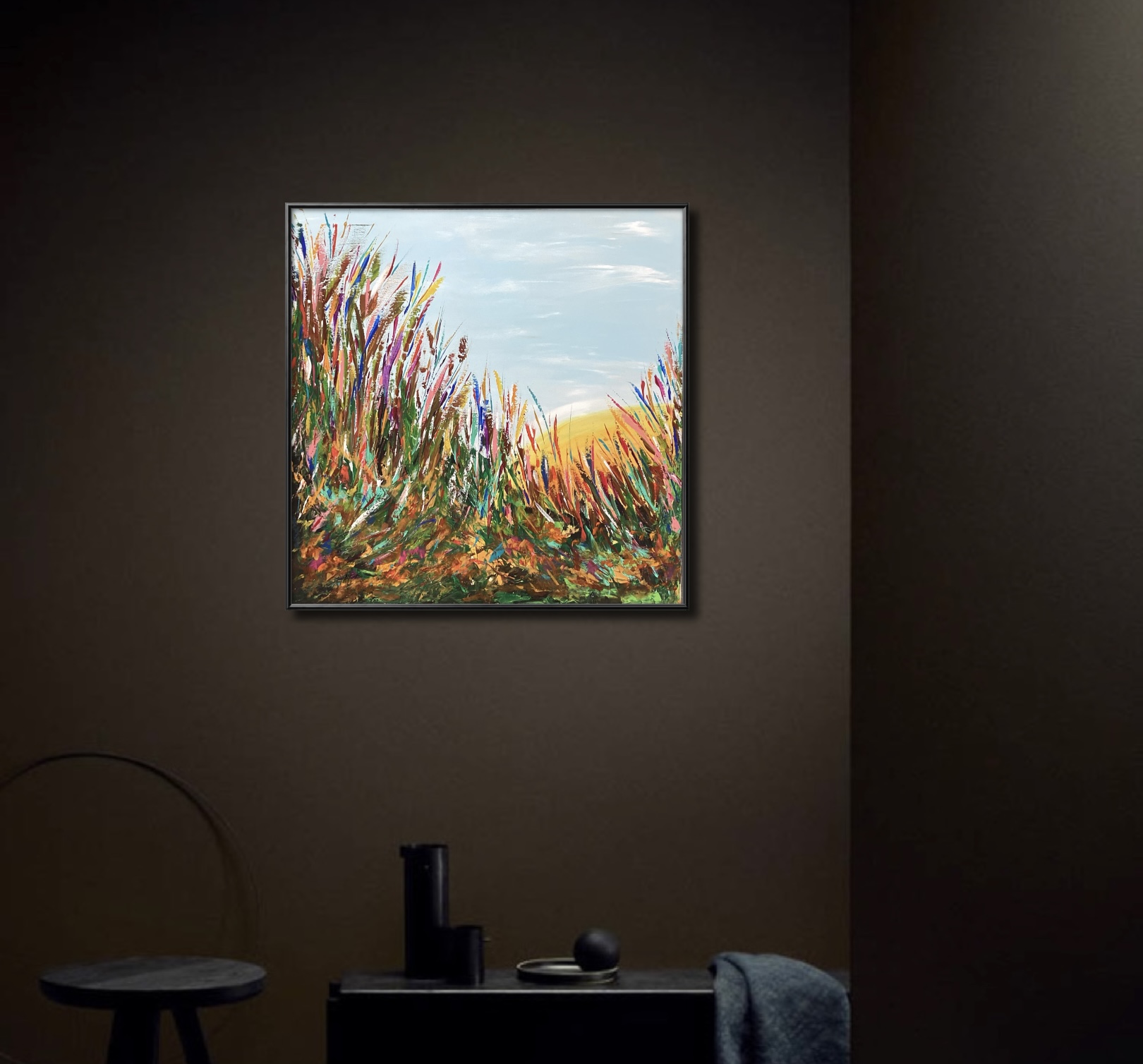 In this abstract painting, the golden wheat fields blend with the vivid colors of blooming flowers under a radiant sun and a vibrant sky. The flowing lines and harmonious hues express energy and abundance, while the color transitions evoke the warmth of harvest season. The artwork celebrates nature’s joy and the artist’s tribute to life and light.