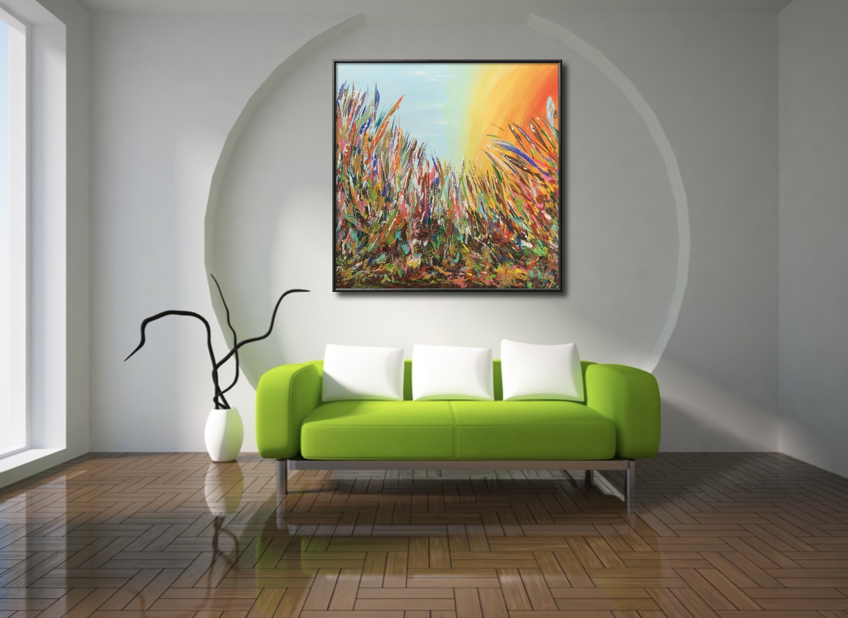 This abstract artwork portrays a vibrant flower field through expressive colors and fluid forms. Instead of realistic details, the composition relies on movement, texture, and bold hues to evoke the liveliness and joy of nature. The painting delivers a refreshing and uplifting atmosphere that invites the viewer into its energetic visual rhythm.