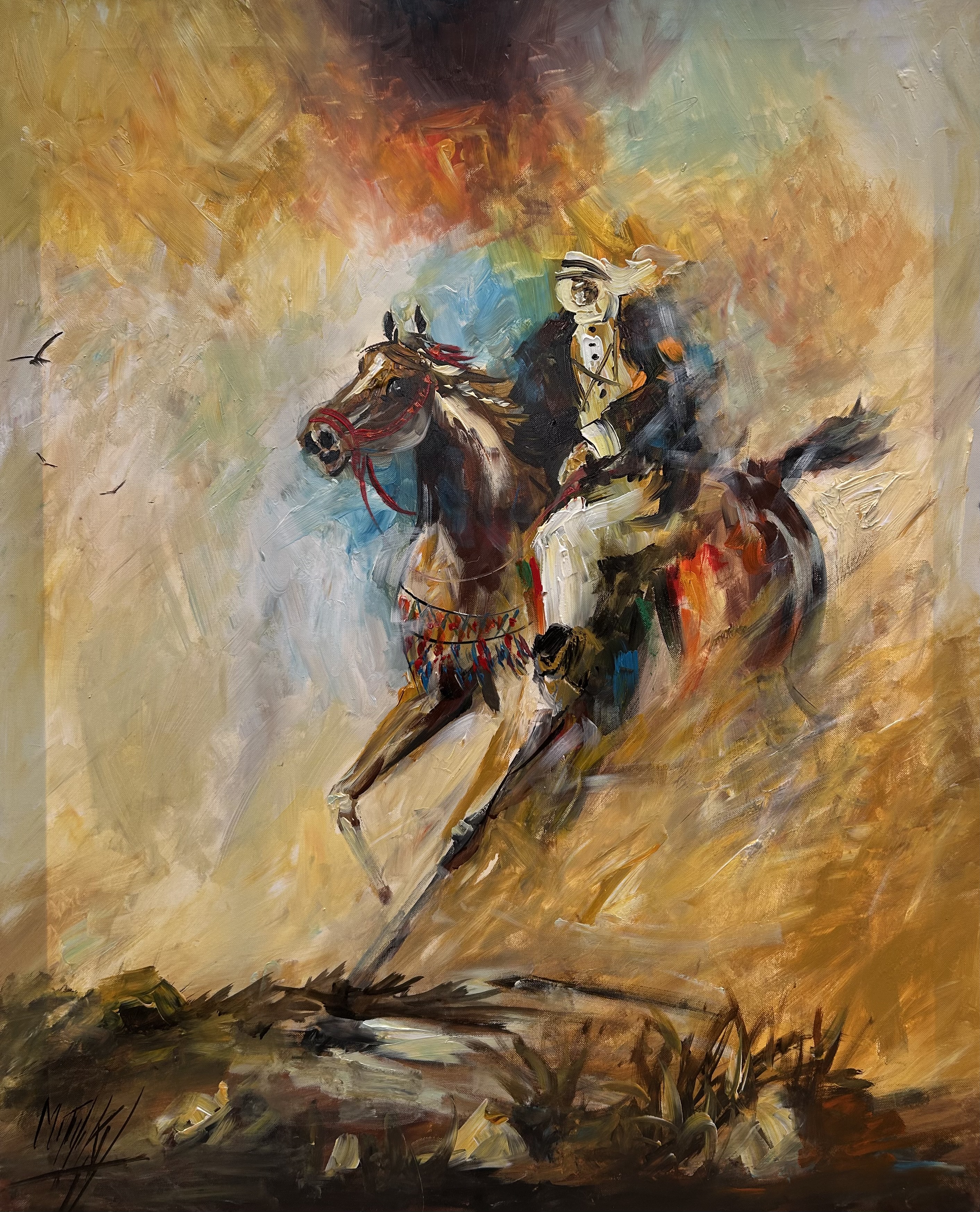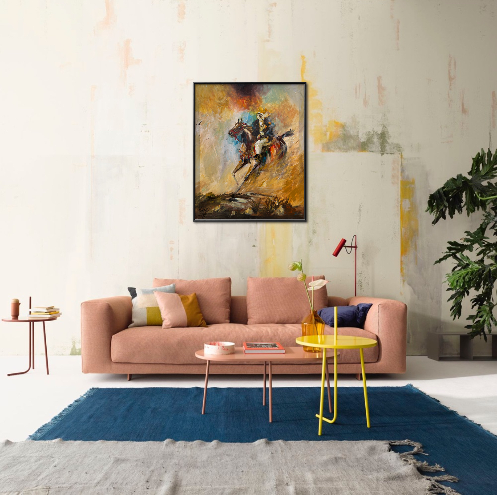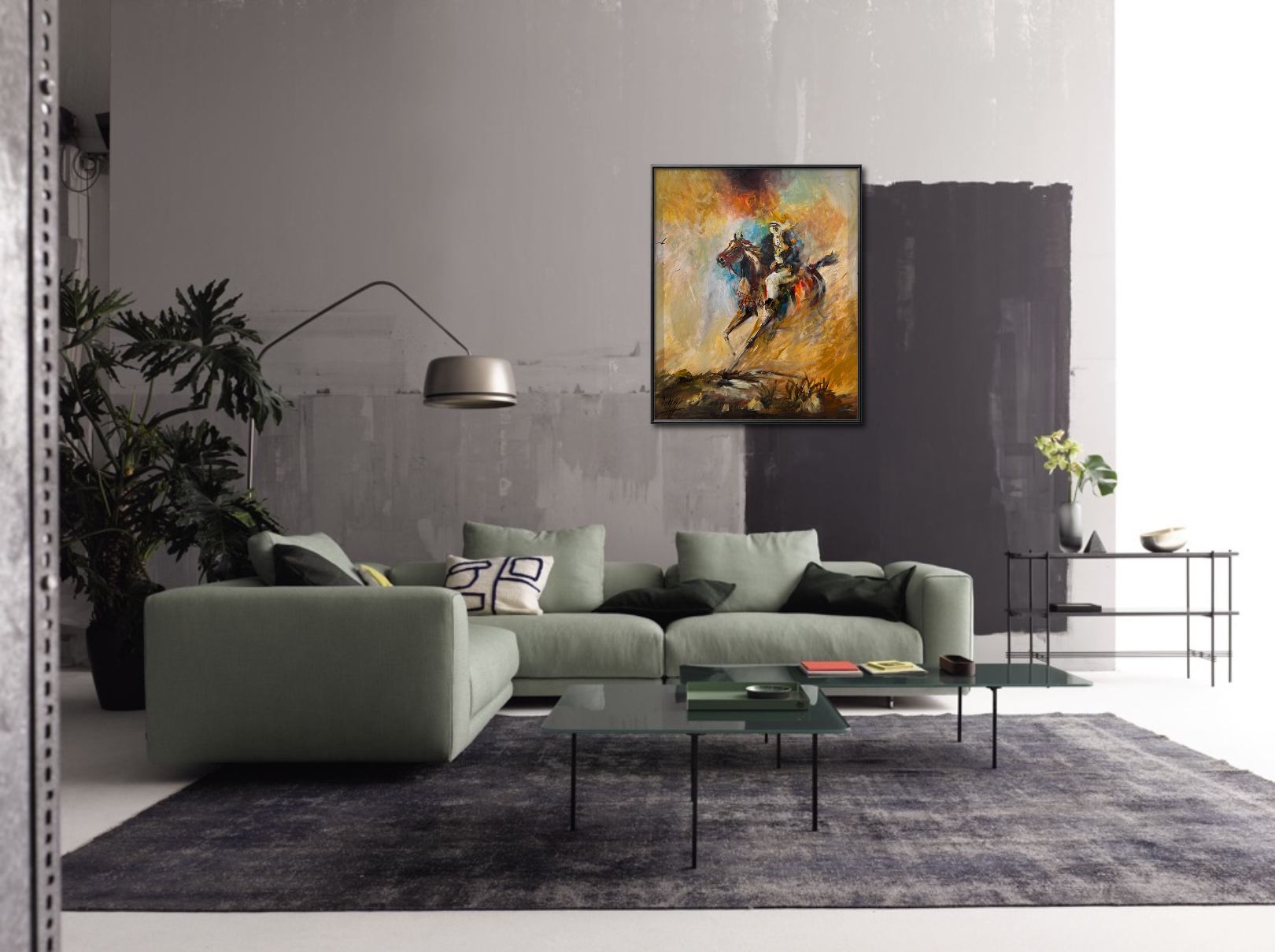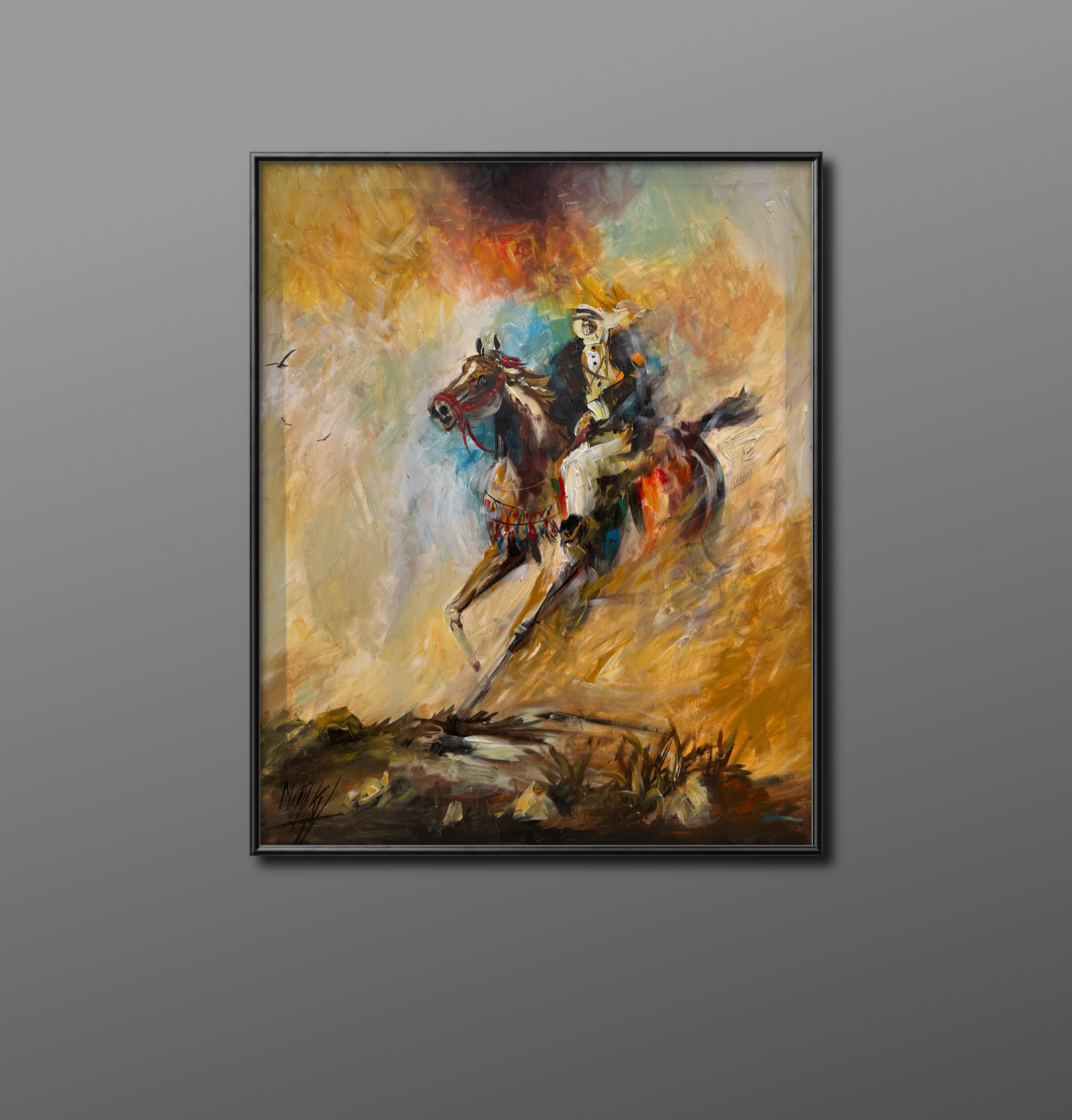 In this vibrant composition, the horse and its rider appear surrounded by a burst of warm colors—orange, red, and yellow—racing through waves of light and motion. The horse embodies strength and freedom, while the rider mirrors courage and harmony with its rhythm. The swirling background of blended tones enhances the sense of movement, striking a balance between realism and abstraction.