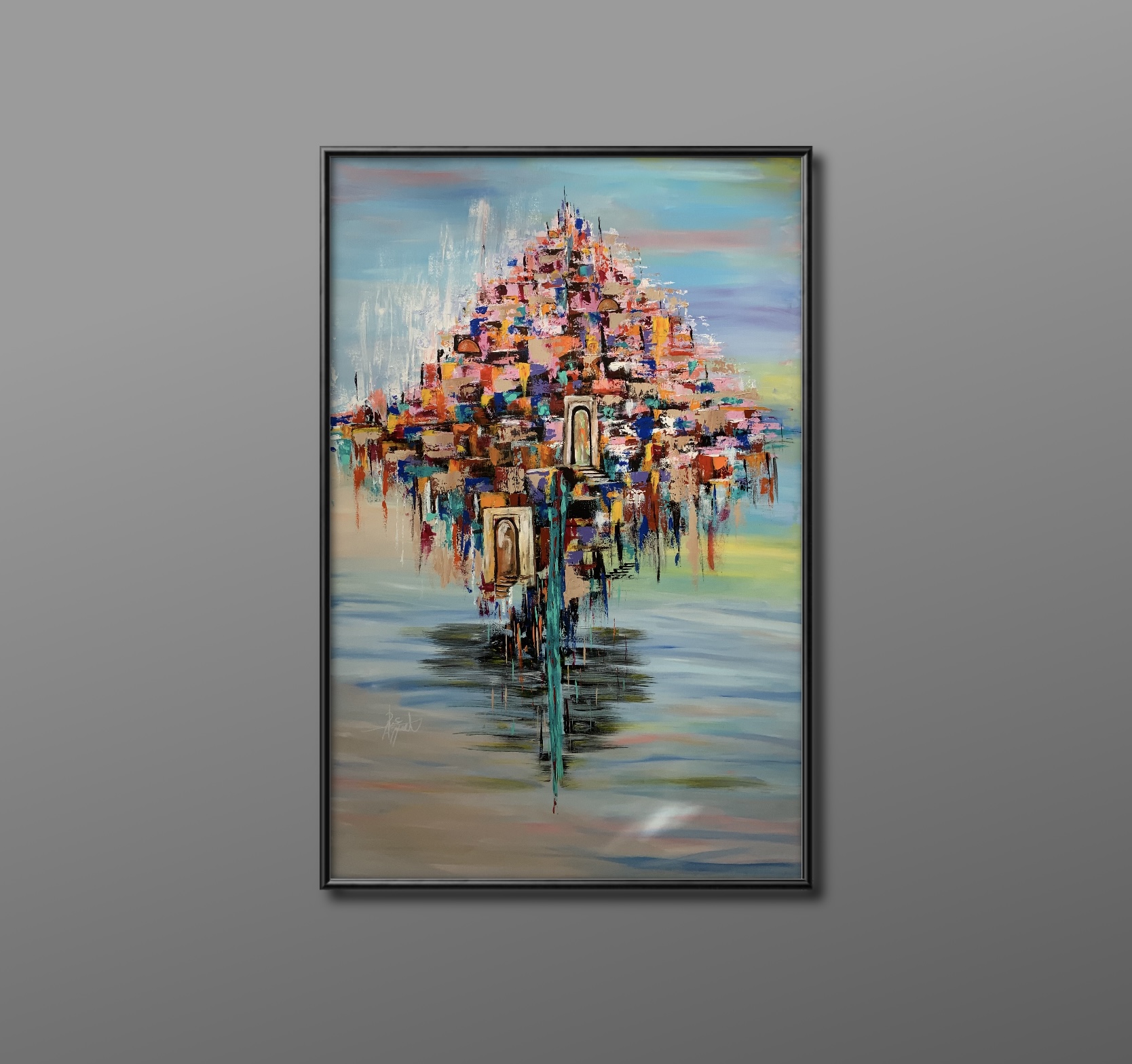 A captivating abstract painting blending the geometry of an ancient city with the spirit of a dream. Two gates open into a mysterious realm floating above a calm reflection, surrounded by vibrant hues of blue, pink, and orange. The artwork symbolizes a passage between reality and imagination, between past and present, glowing with light and symbolism.