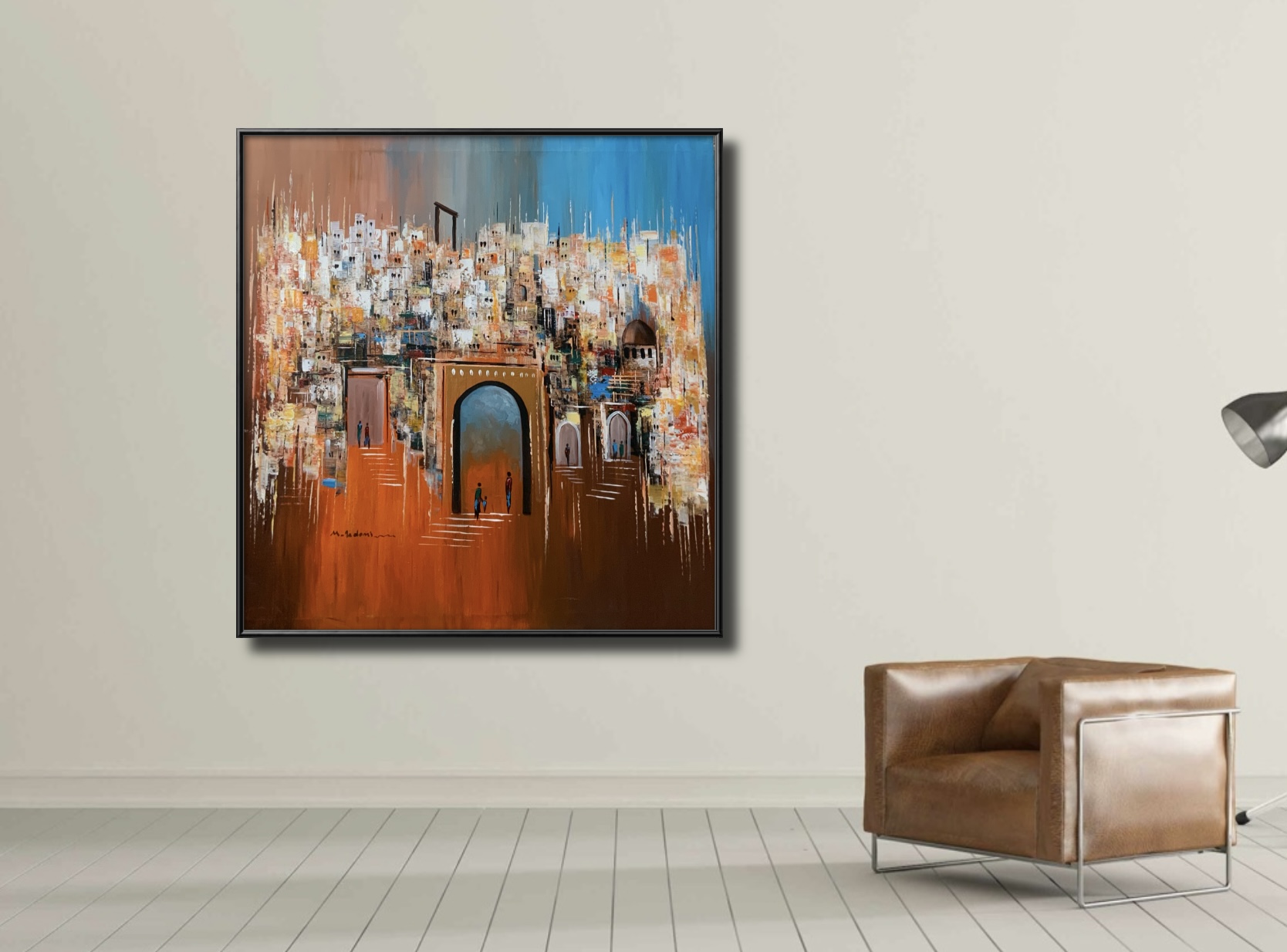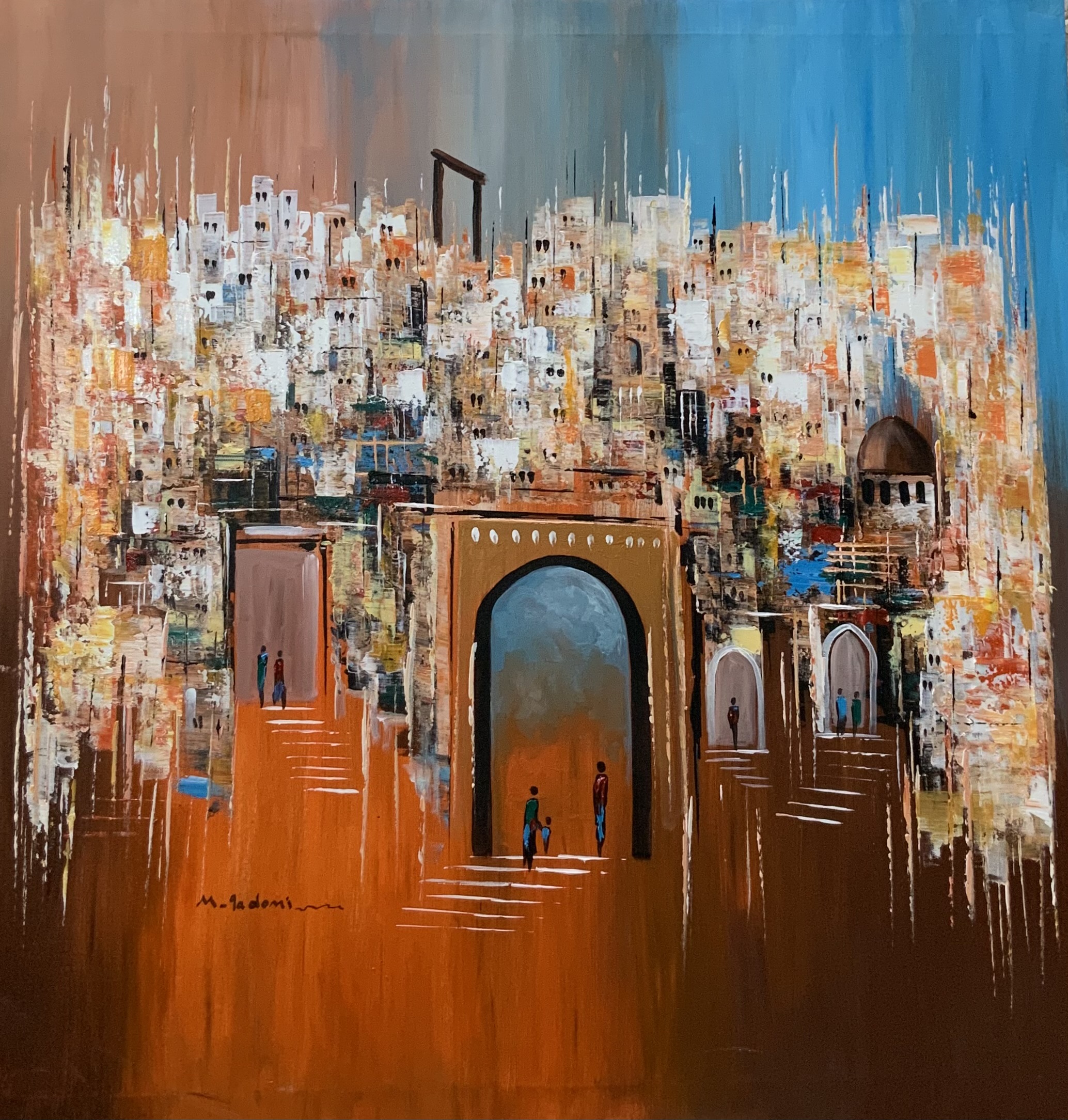 The painting depicts a symbolic scene of Amman, with a grand gate in the foreground and several smaller ones alongside, representing diversity and new beginnings. People are shown passing through the gates toward the city, while the historic Citadel hill rises in the background. The blend of warm and cool colors creates a balance between heritage and vitality.