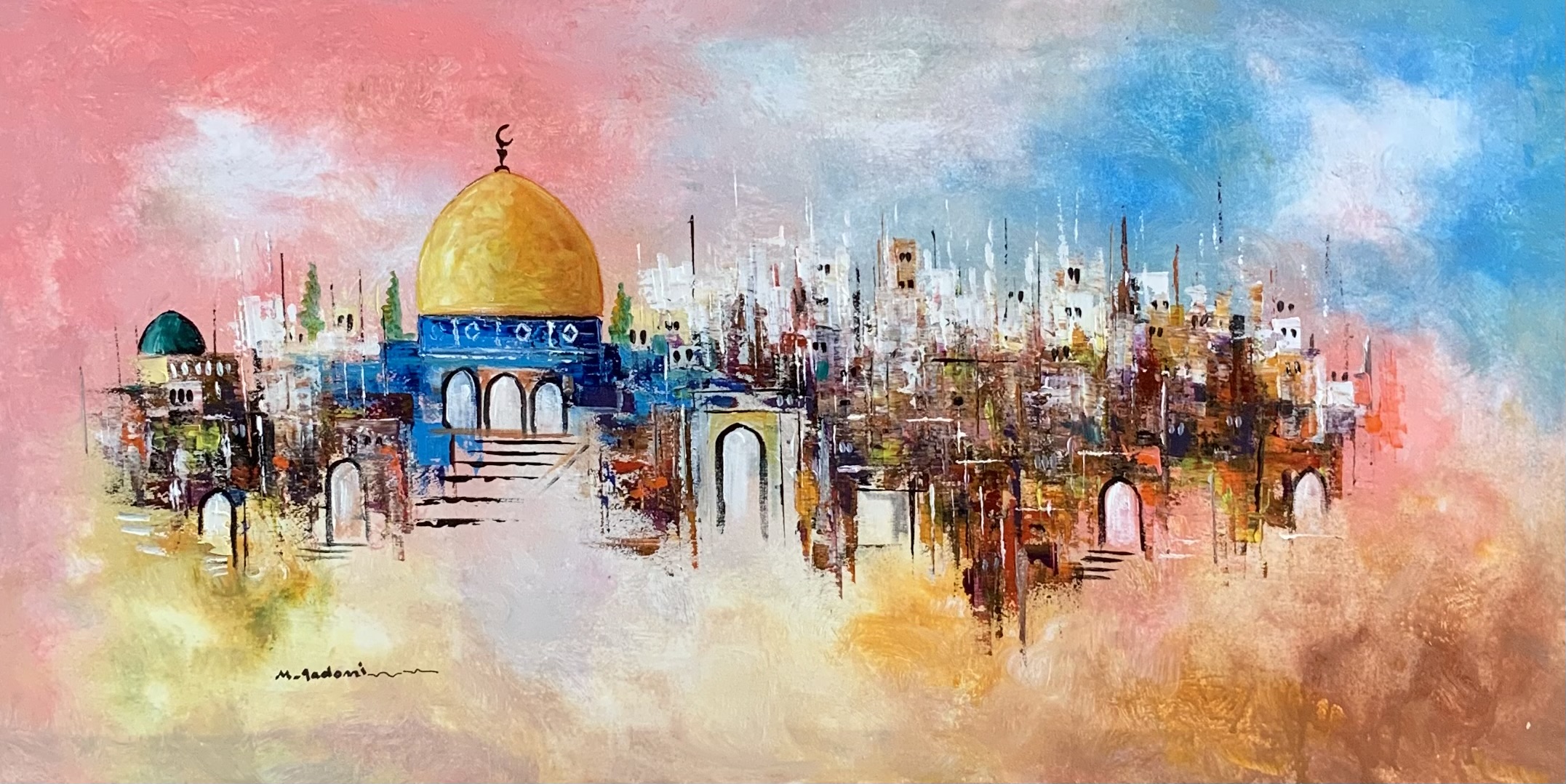 This artwork captures a spiritual vision of Jerusalem, with the golden Dome of the Rock standing at the heart of the composition. Surrounding arches and gates evoke layers of history and human presence. The luminous blend of pink, blue, and gold symbolizes hope and peace, while the harmony between architecture and sky gives the scene a transcendental, timeless quality.