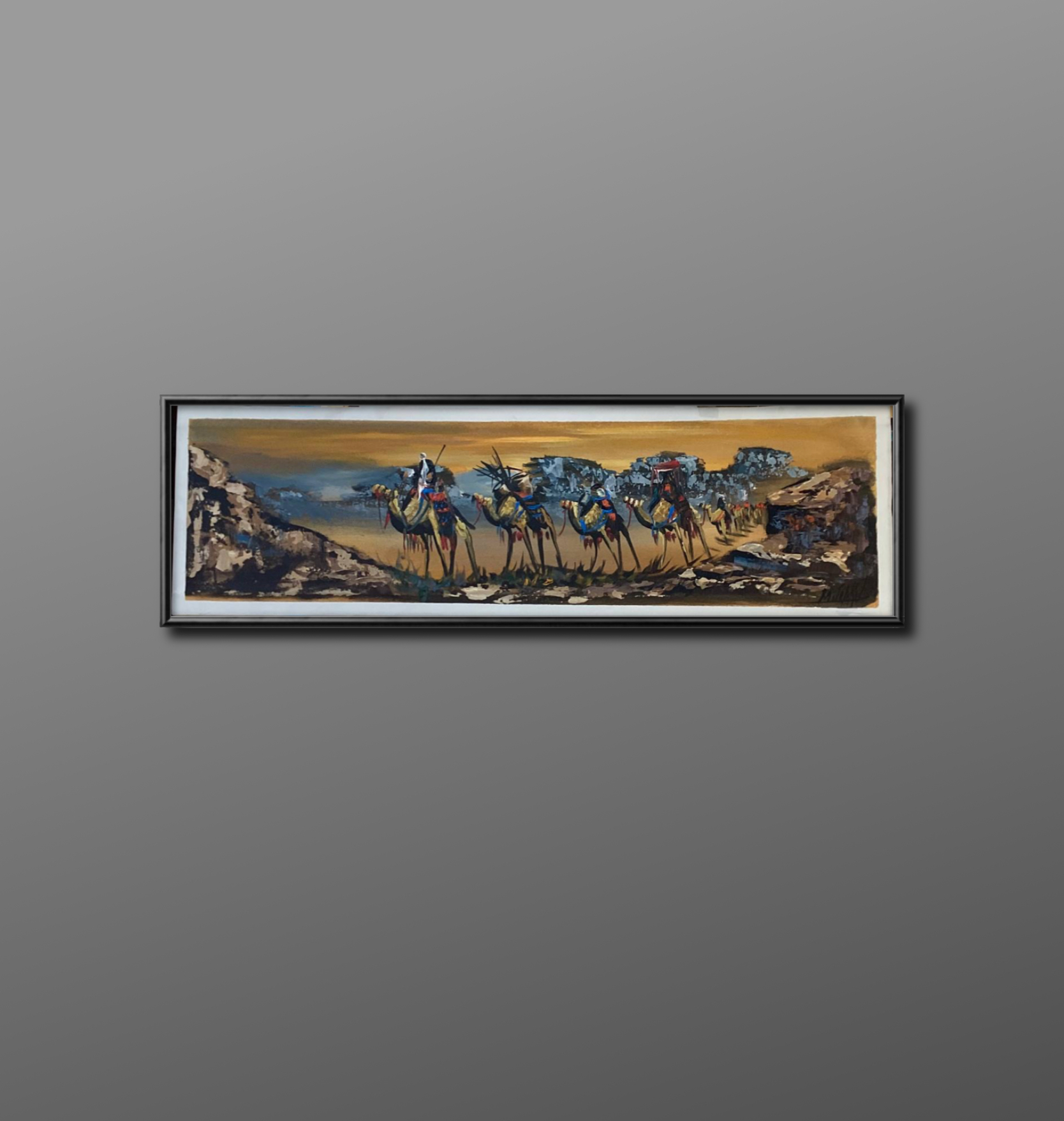 A painting that reveals the timeless stillness and beauty of the Jordanian desert, where a caravan of camels moves gently beneath the glowing Rum sun. The horizon blurs between sand and sky — a meeting of reality and dream, telling the story of eternity in an endless desert.