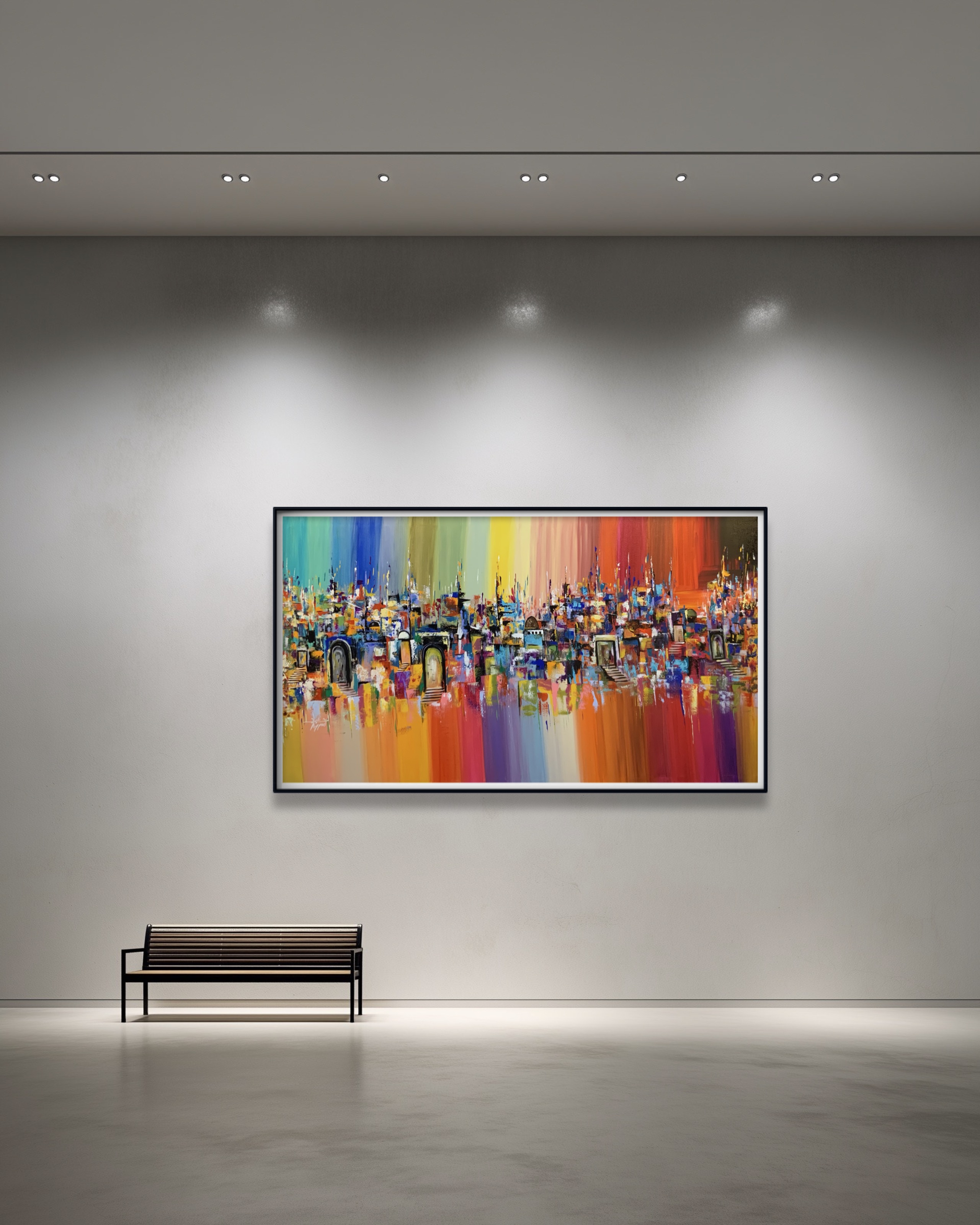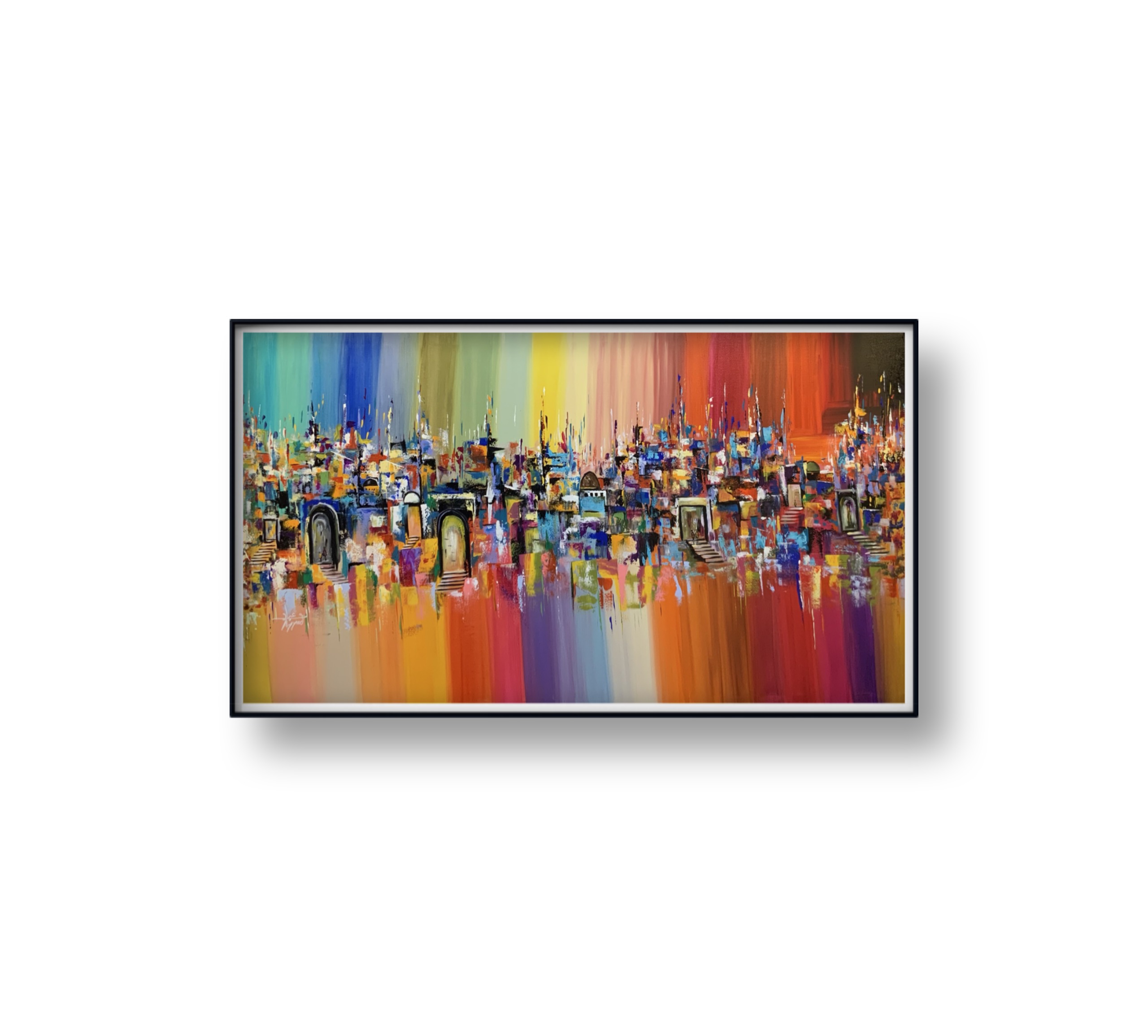 A vibrant abstract painting depicting an imaginary city where doors and windows stand as symbols of memories and human stories. Warm and cool colors blend harmoniously, creating a sense of movement and vitality, while vertical and flowing strokes evoke the passage of time and nostalgia for place.