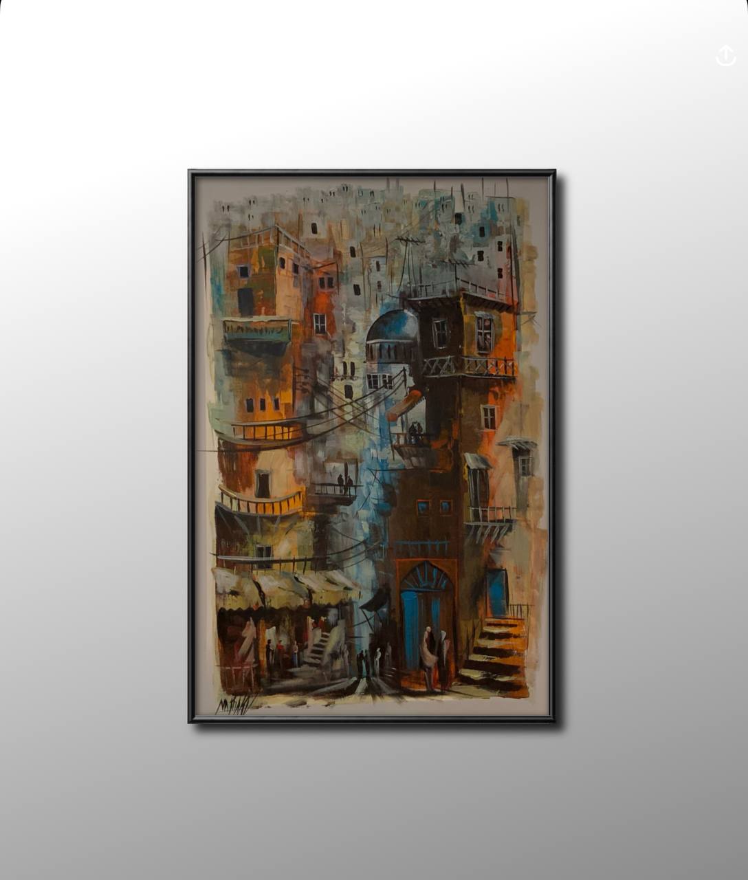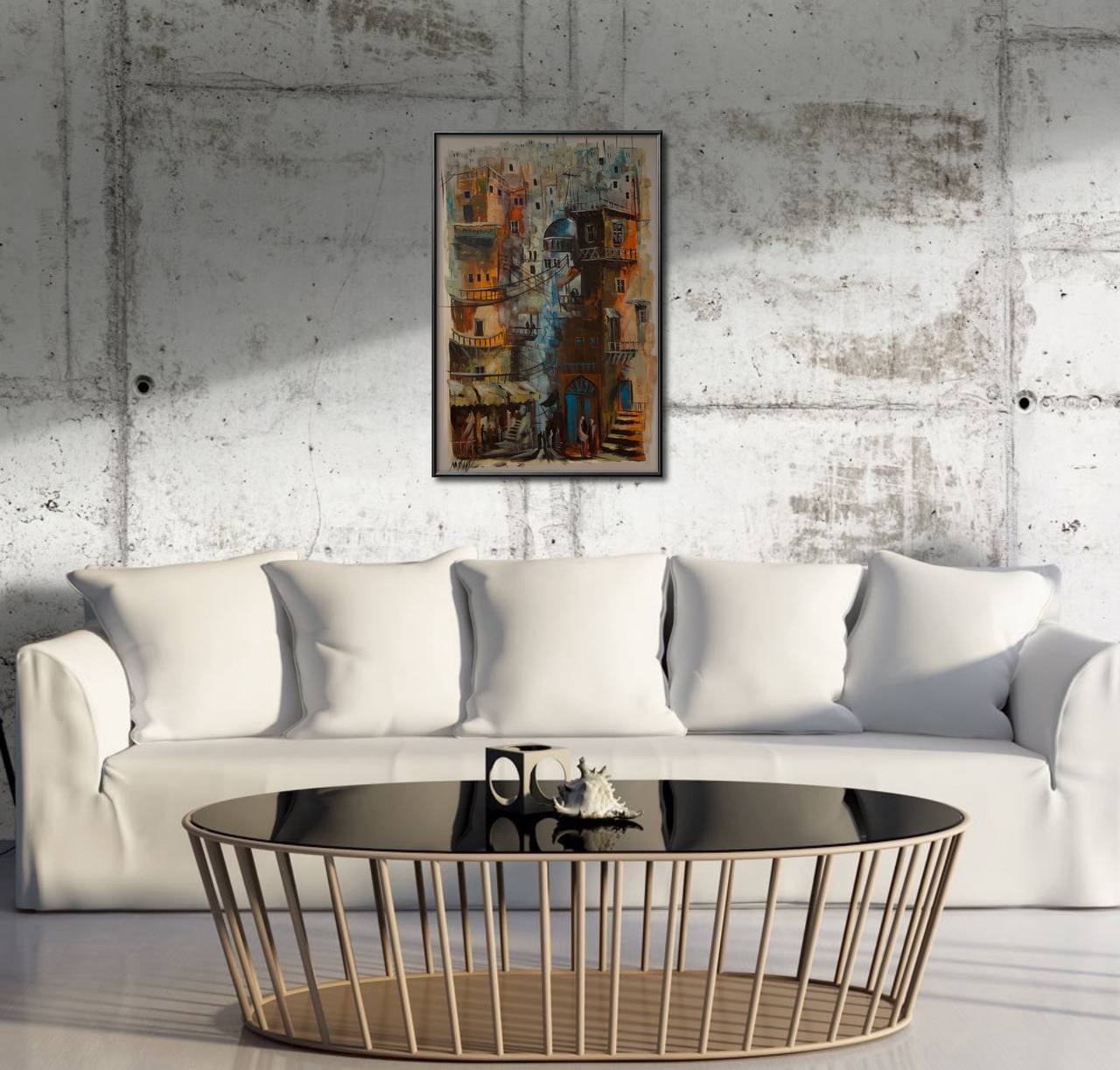 This painting captures a lively scene from the old neighborhoods of Amman, where stone houses stack upon one another in warm tones, reflecting the city’s timeless spirit. The narrow alleys filled with movement and the crisscrossing wires between windows and balconies add a familiar sense of urban life. Figures scattered through the streets and shops bring warmth and intimacy to the composition.