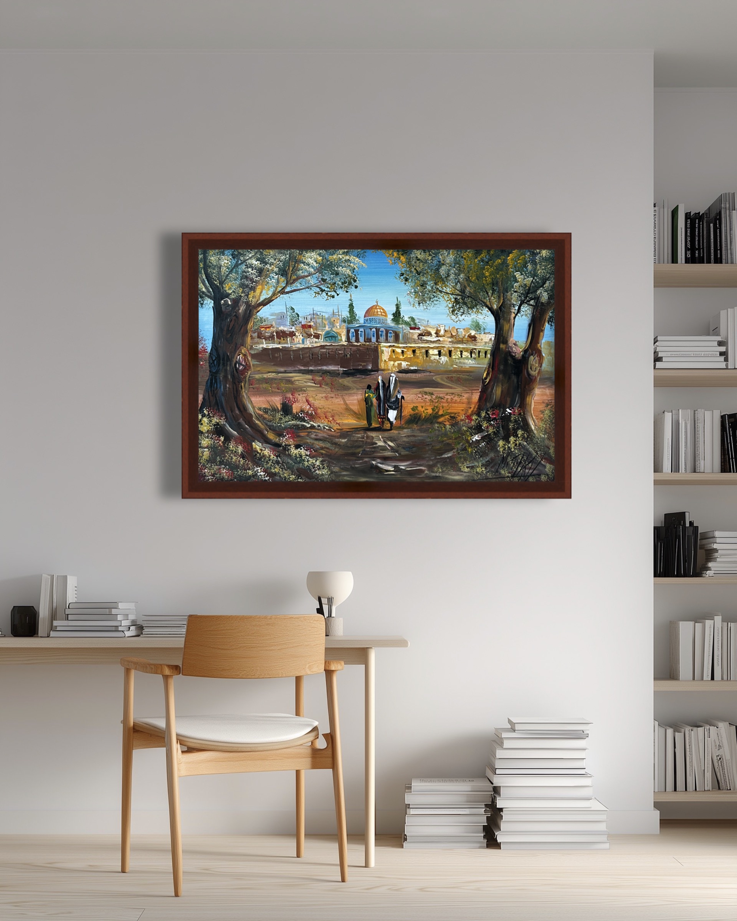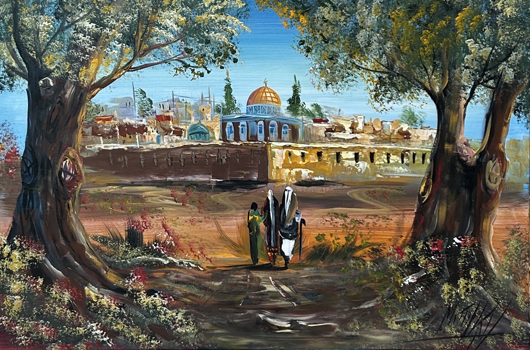 The painting portrays a serene scene in which a gentle earth path leads travelers toward the city of Jerusalem, with the golden dome standing at the heart of the composition as a symbol of sanctity and peace. Trees frame the landscape like a natural embrace, protecting memory and guiding the journey. Warm earthy tones harmonize with the blue sky, creating visual balance and calm. The quietly advancing figures express longing and belonging, transforming the artwork into a contemplative reflection on peace, identity, and spiritual connection to place.