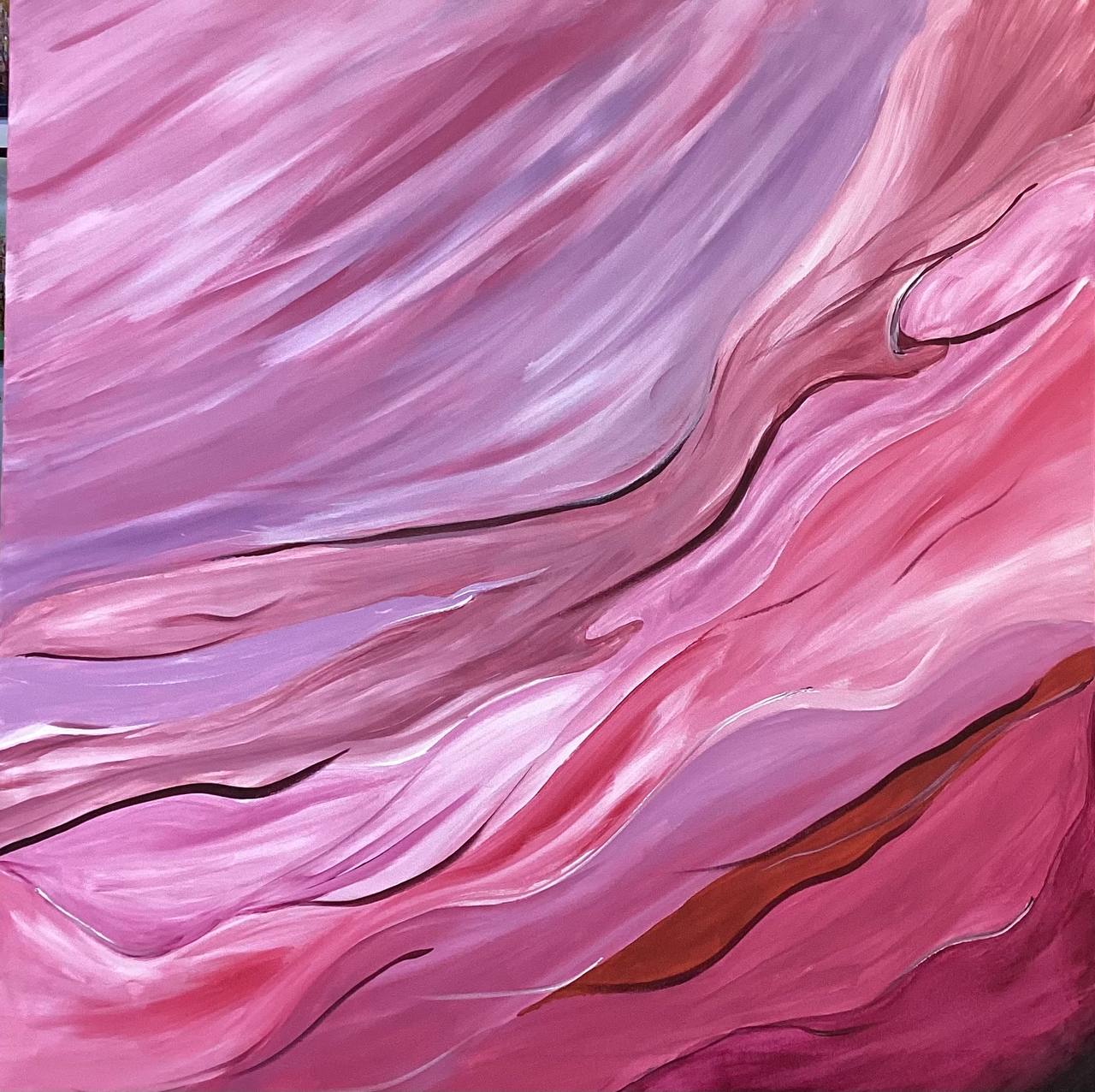 An abstract painting where pink waves flow in soft gradients, creating a sense of visual harmony and emotional calm. It is a color journey that carries the viewer between the delicacy and depth of pink, between the transparency of light and the warmth of feeling.