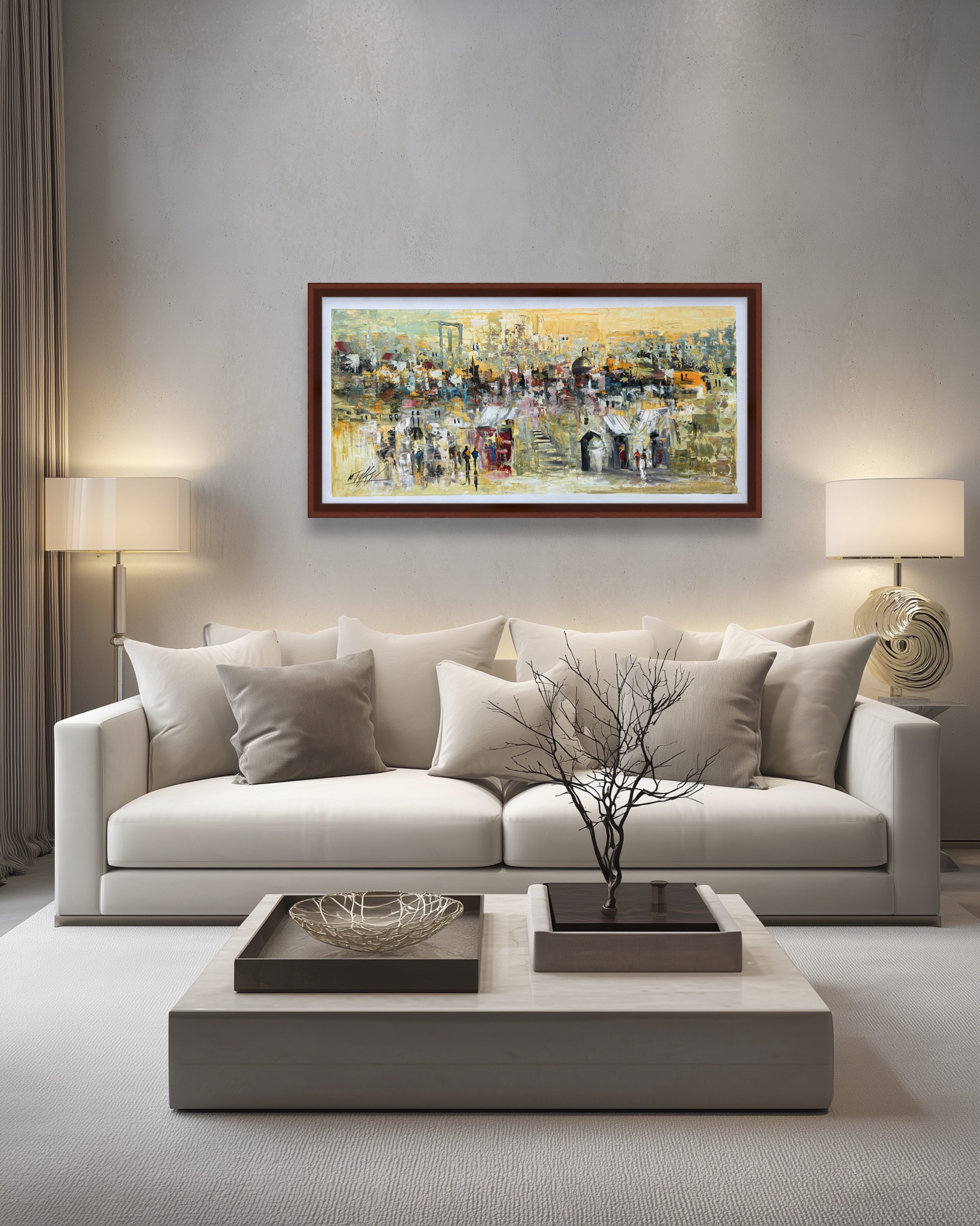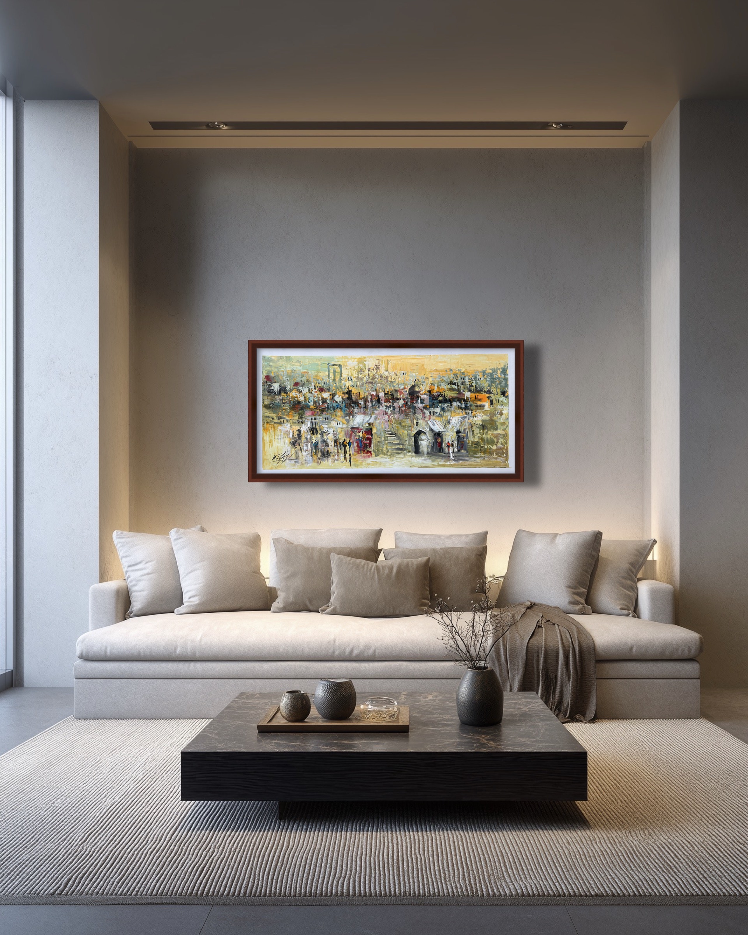 This painting presents an abstract urban scene filled with the spirit of place, where historic architecture merges with human movement in a richly layered and textured composition. Warm and muted tones evoke a sense of history and everyday life, while stairs and pathways guide the eye through the city’s alleys and memories. The artwork is a visual reflection on time, belonging, and the stories held within the walls.