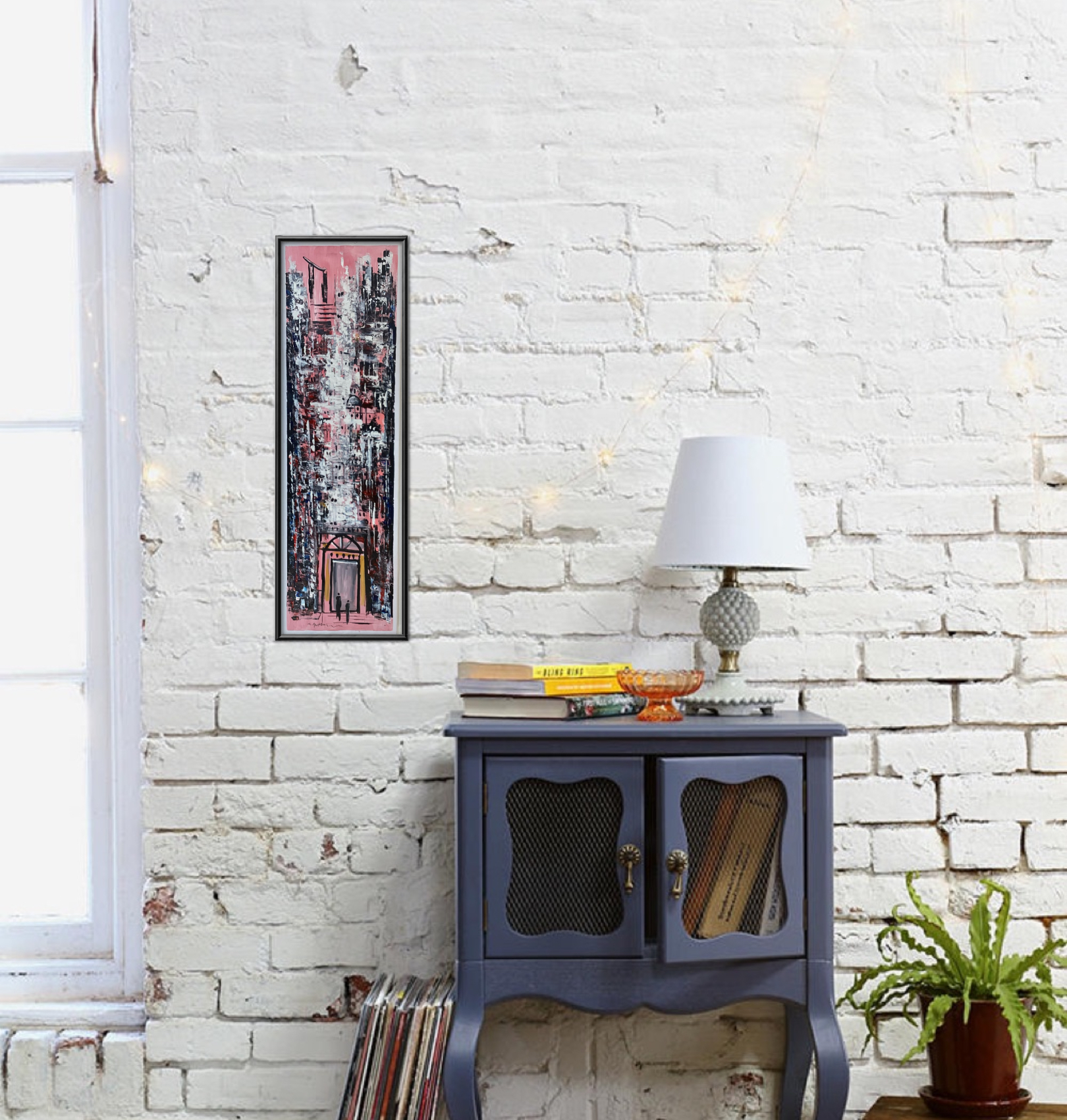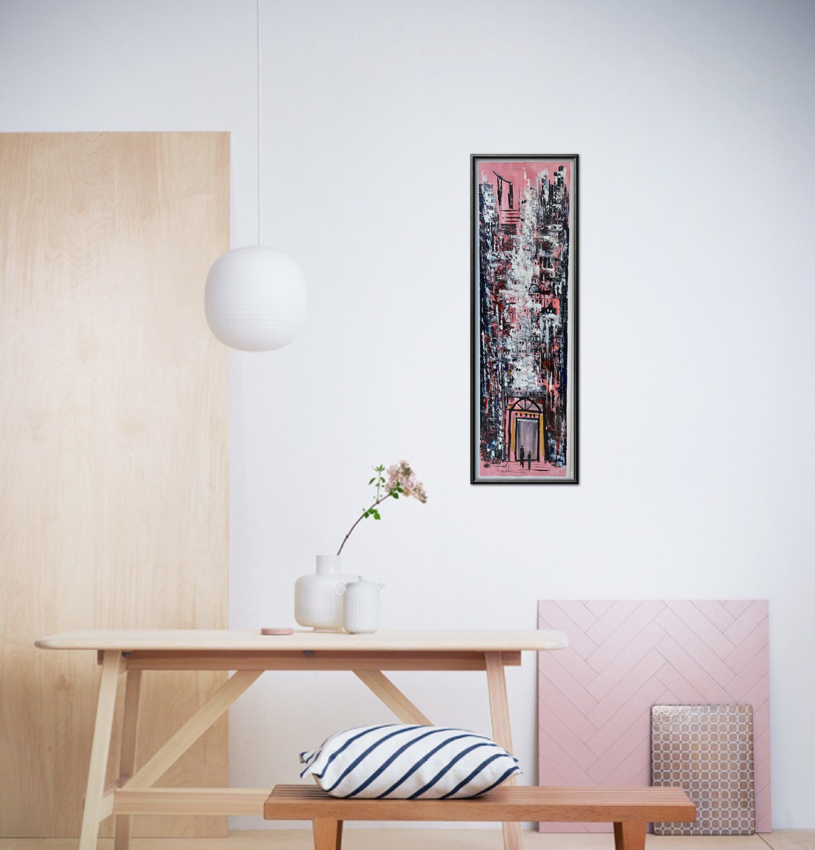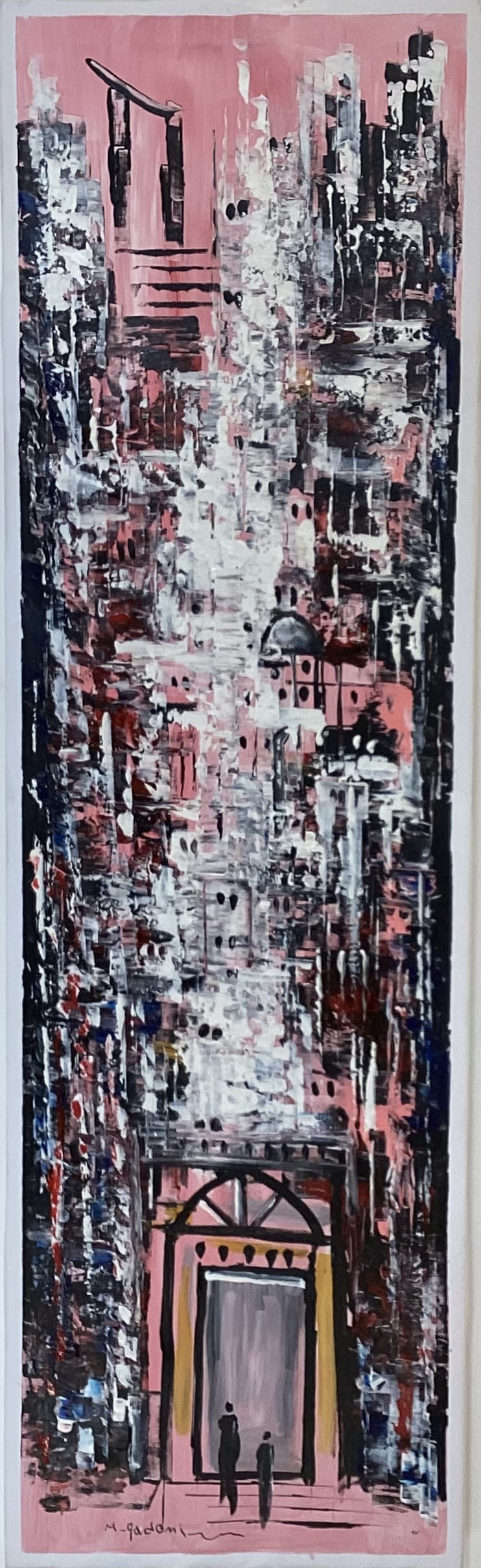 In this painting by Mohammad Qadomi, the vertical abstract façade radiates serenity and delicacy. Lines and forms flow harmoniously, creating a sense of depth and transparency that draws the viewer inward. At the base, a softly illuminated doorway serves as the focal point, while small human silhouettes stand nearby, evoking quiet motion and anticipation. The composition feels poetic and dreamlike — as though the structure itself hovers between memory and imagination.