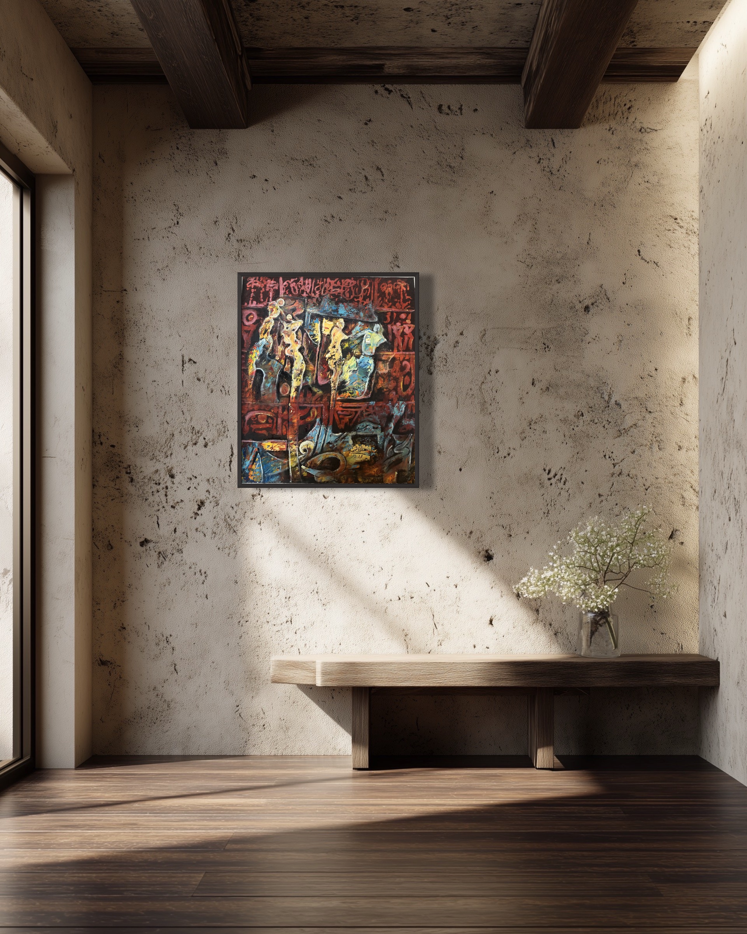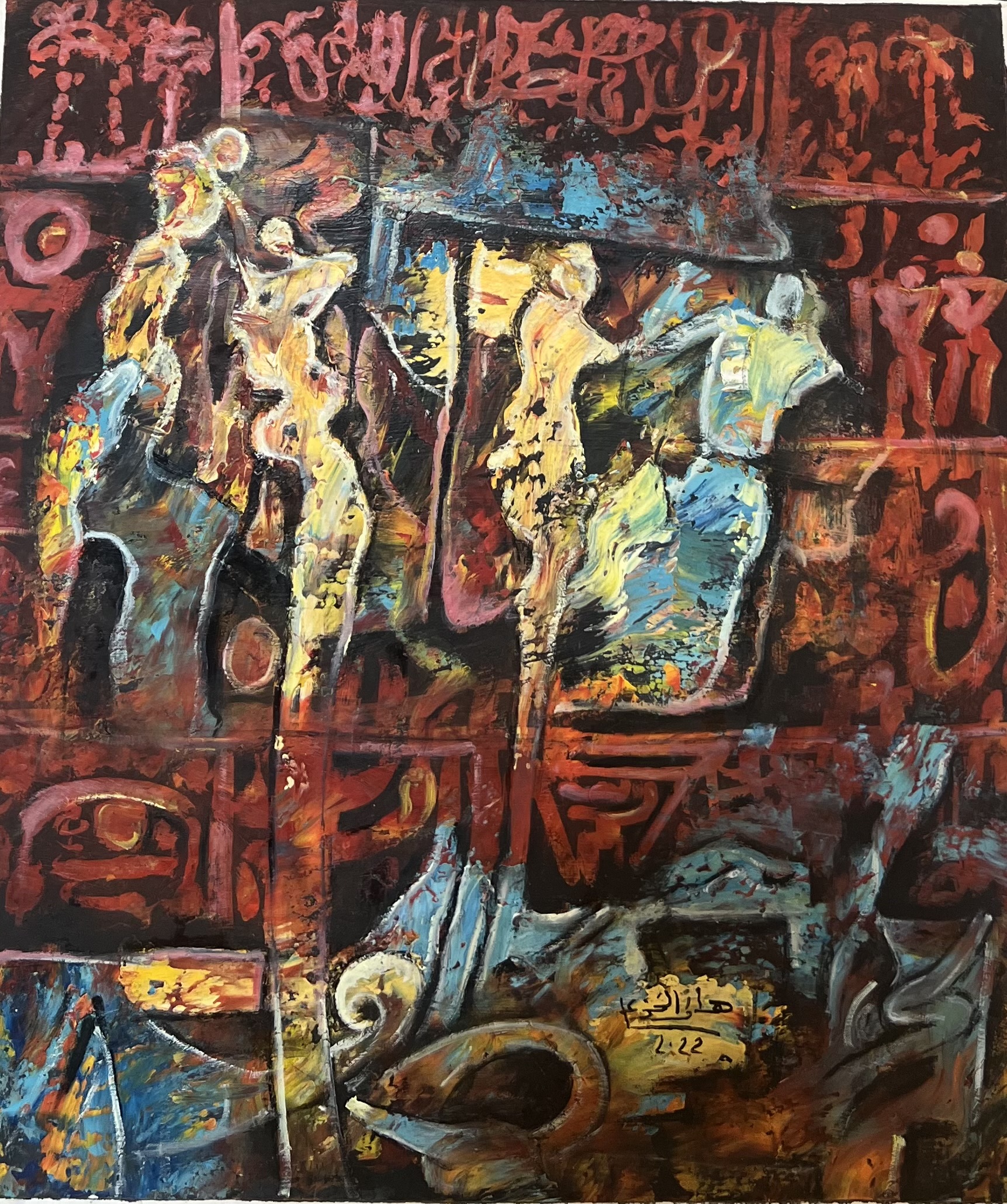 This painting presents an expressive scene rich in movement and symbolism, where human figures appear in a constant state of transition between different states of being. The dark background infused with red and copper tones intertwines with primitive marks and calligraphic traces, creating a ritualistic atmosphere that evokes transformation and collective memory. Strong color contrasts lend the work a powerful visual intensity.