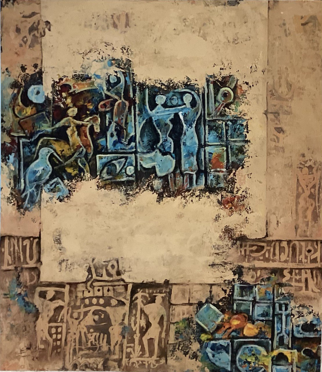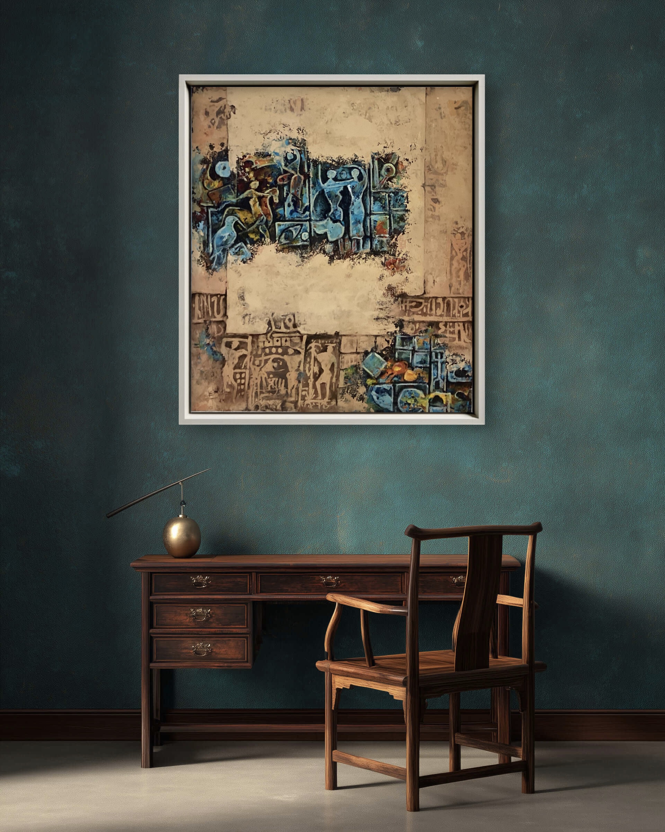 This artwork blends primitive symbols with human silhouettes, creating a visual tapestry that feels like layers of ancient memory coming back to life. Earthy and blue hues form a stage where figures move as if performing a spiritual ritual across the walls of time. The central empty space adds contemplative depth, balancing silence and motion—what remains and what has been lost.