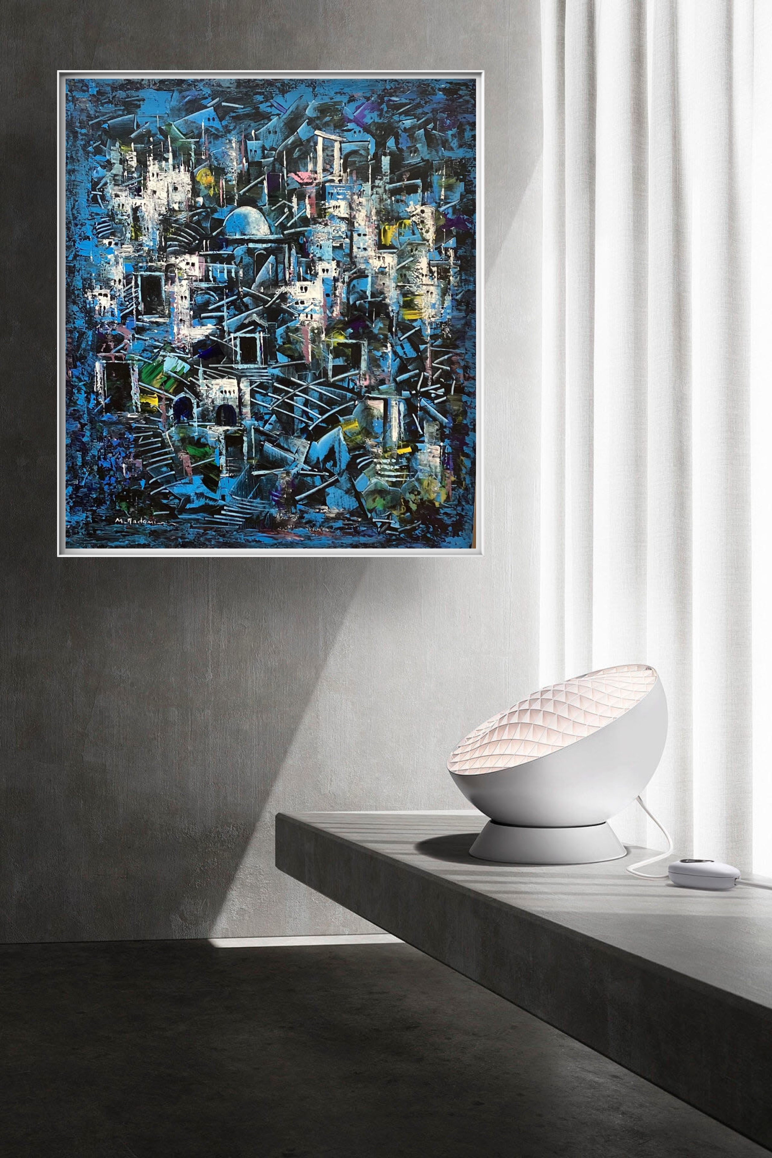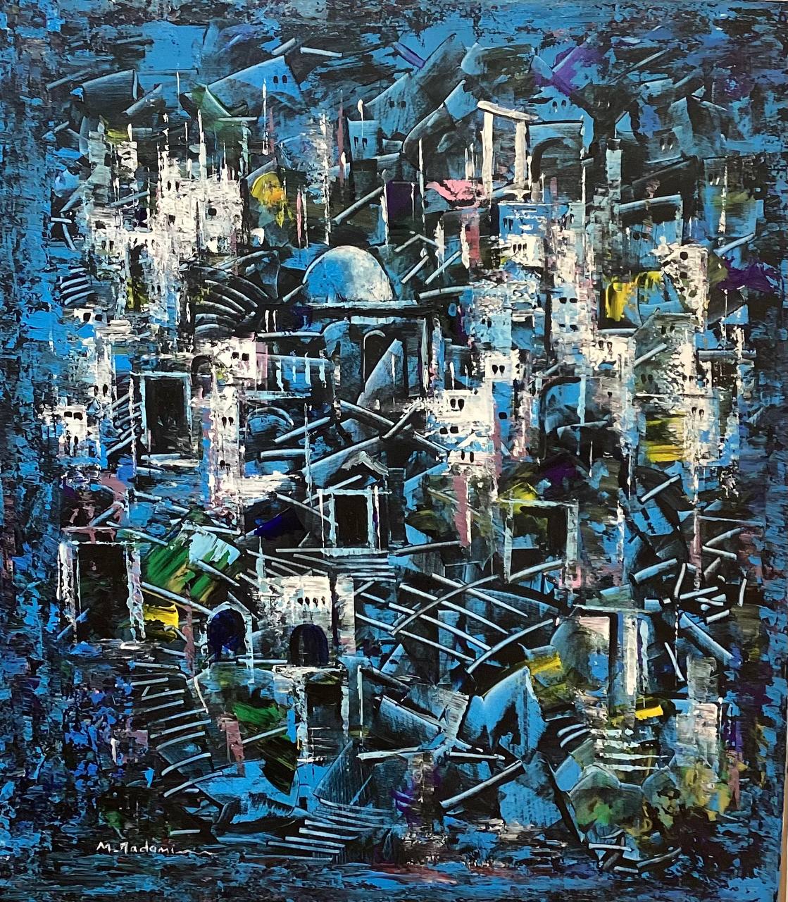 An ancient underground city bathed in cool shades of blue, where old tunnels and worn-down passages whisper forgotten tales. Fragile houses and crumbling buildings stand as the last remnants of a civilization that defied time—its mysteries preserved in the shadows beneath the earth.
