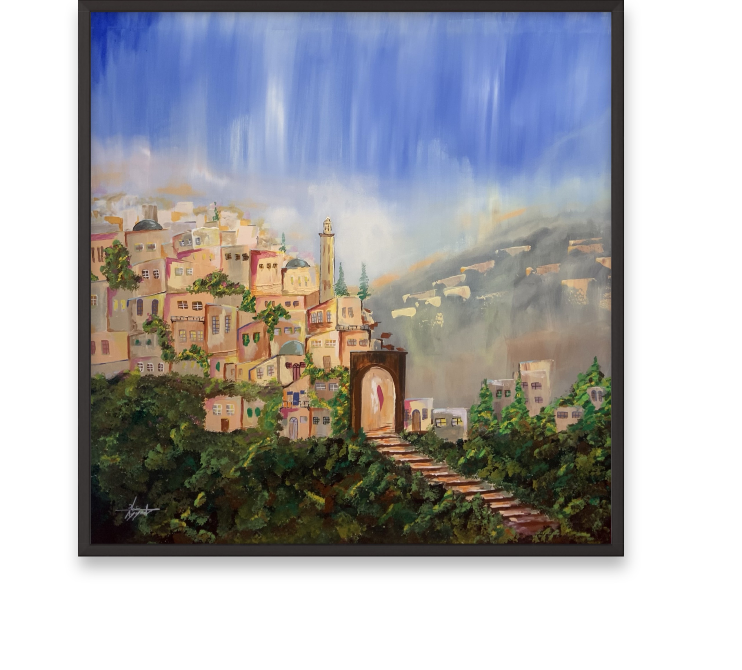 This painting depicts an abandoned city resting quietly within a mountainous landscape, where silent architecture merges with the raw majesty of nature. The absence of people evokes a profound sense of solitude and reflection, as if the place holds untold memories—balancing stillness with quiet awe.