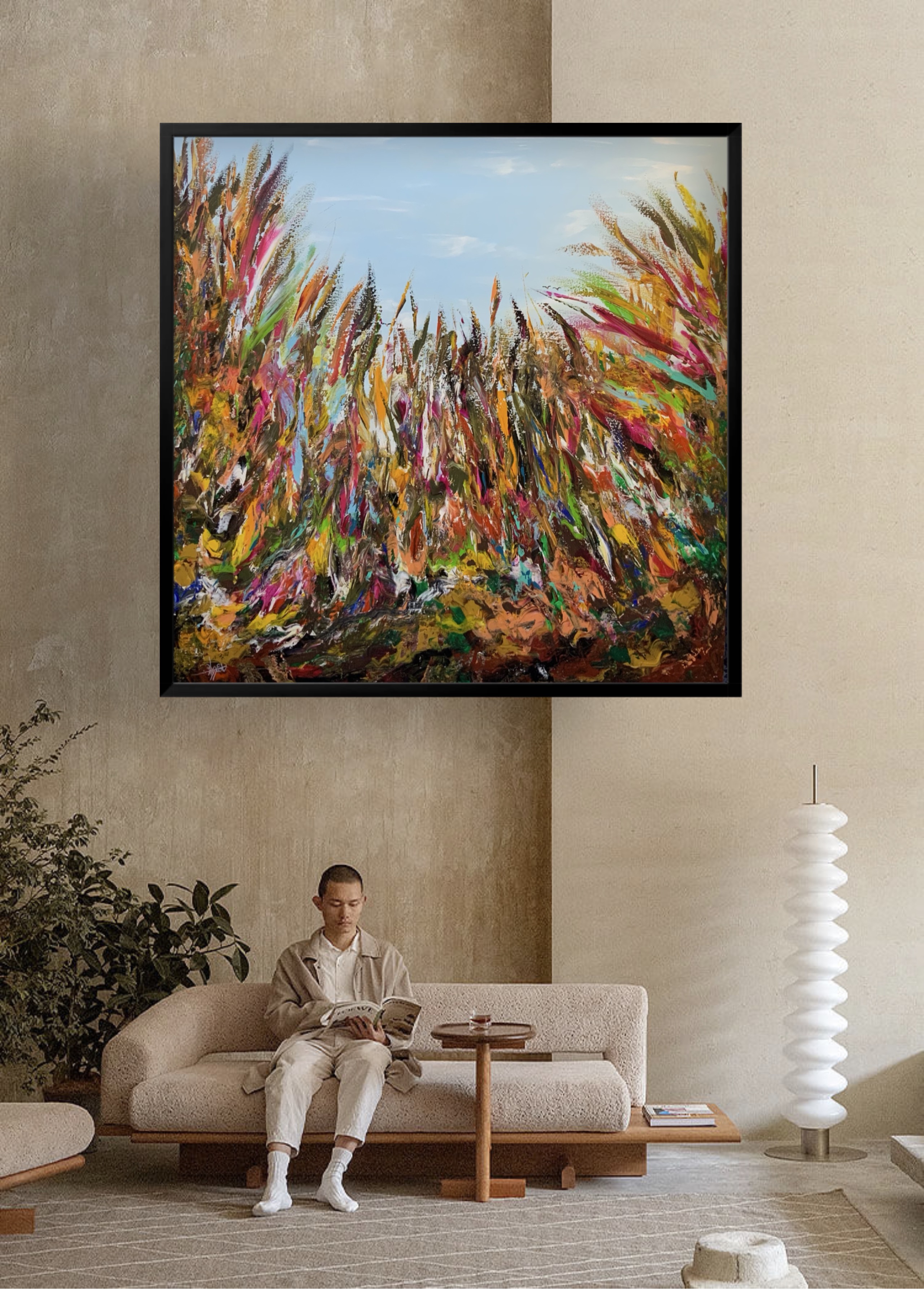 An abstract painting capturing a magical sunset over a vibrant field. The lower half bursts with multicolored brushstrokes—greens, oranges, purples, blues—suggesting wild grasses or tall vegetation in motion. Above, the sky transitions from deep blue to radiant yellow and orange, glowing with the final light of day. The contrast between the lively earth and the fiery sky creates an emotional and contemplative energy.