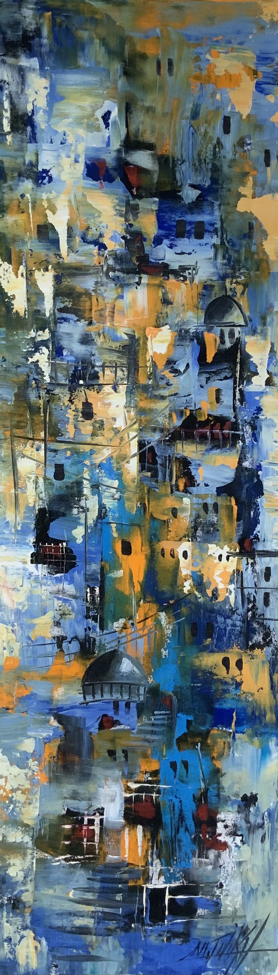 This painting captures the mountainous city of Amman with its tightly stacked houses rising along the hillsides, forming a unified architectural rhythm. Shades of blue dominate the composition, creating a sense of calm, depth, and elevation. Through intertwined alleys and layered structures, the artwork reflects the city’s spirit and memory, where history and everyday life meet in a poetic visual harmony.