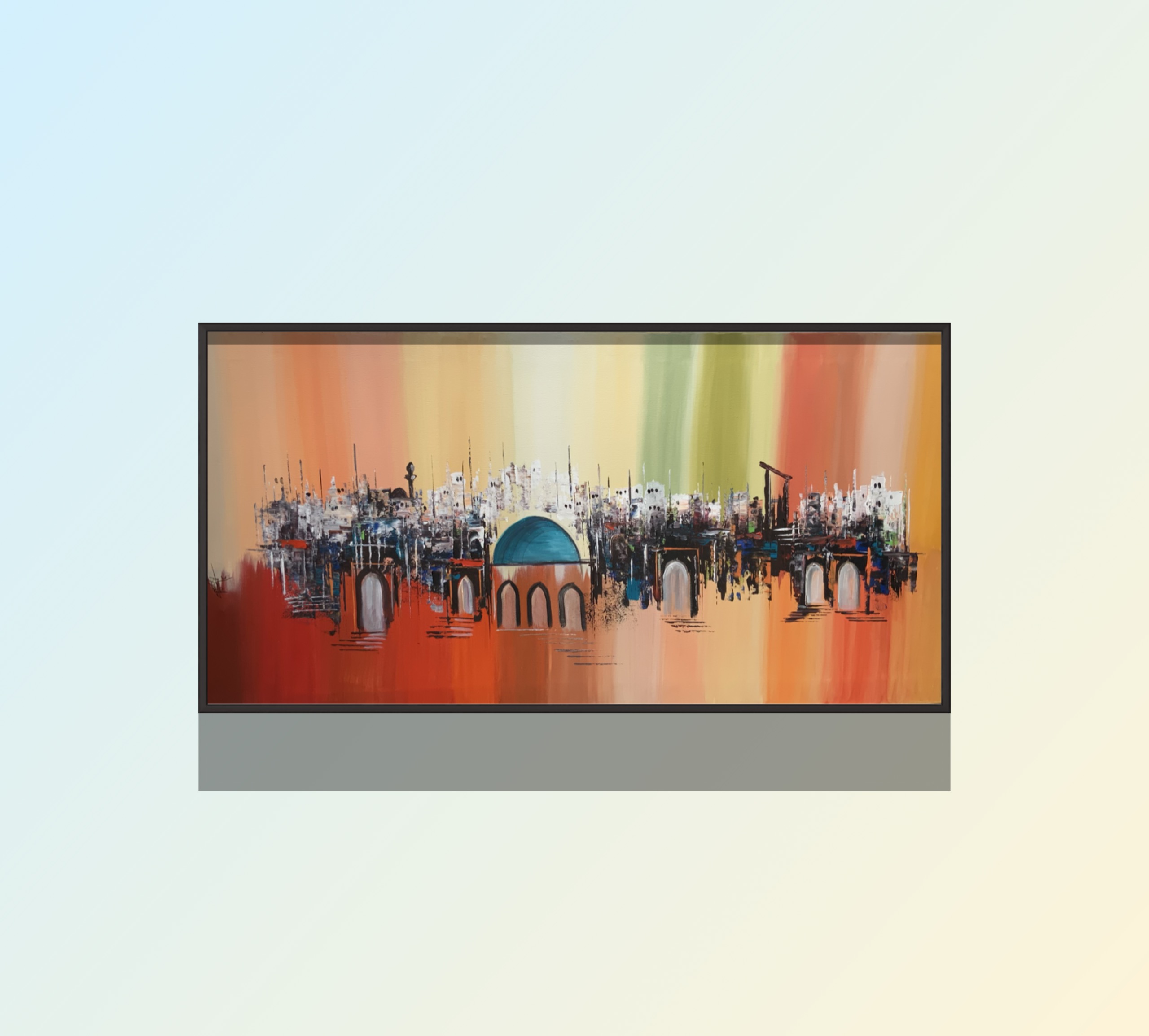 An expressive abstract painting that captures a vibrant cityscape blending traditional and modern architecture. Arches and domes emerge through a warm, gradient background, reflecting movement and urban energy. The turquoise dome acts as a visual anchor, bringing calm amidst the city’s dynamic rhythm.