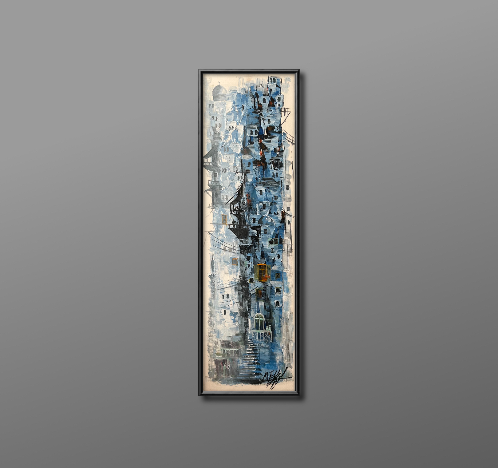 The painting “The Splendor of ammani Houses” captures the charm of traditional Omani houses in deep blue, highlighting the detailed roofs and windows that tell the story of the place. The colors harmonize beautifully, creating a sense of depth and movement, offering viewers a rich and lively visual experience.