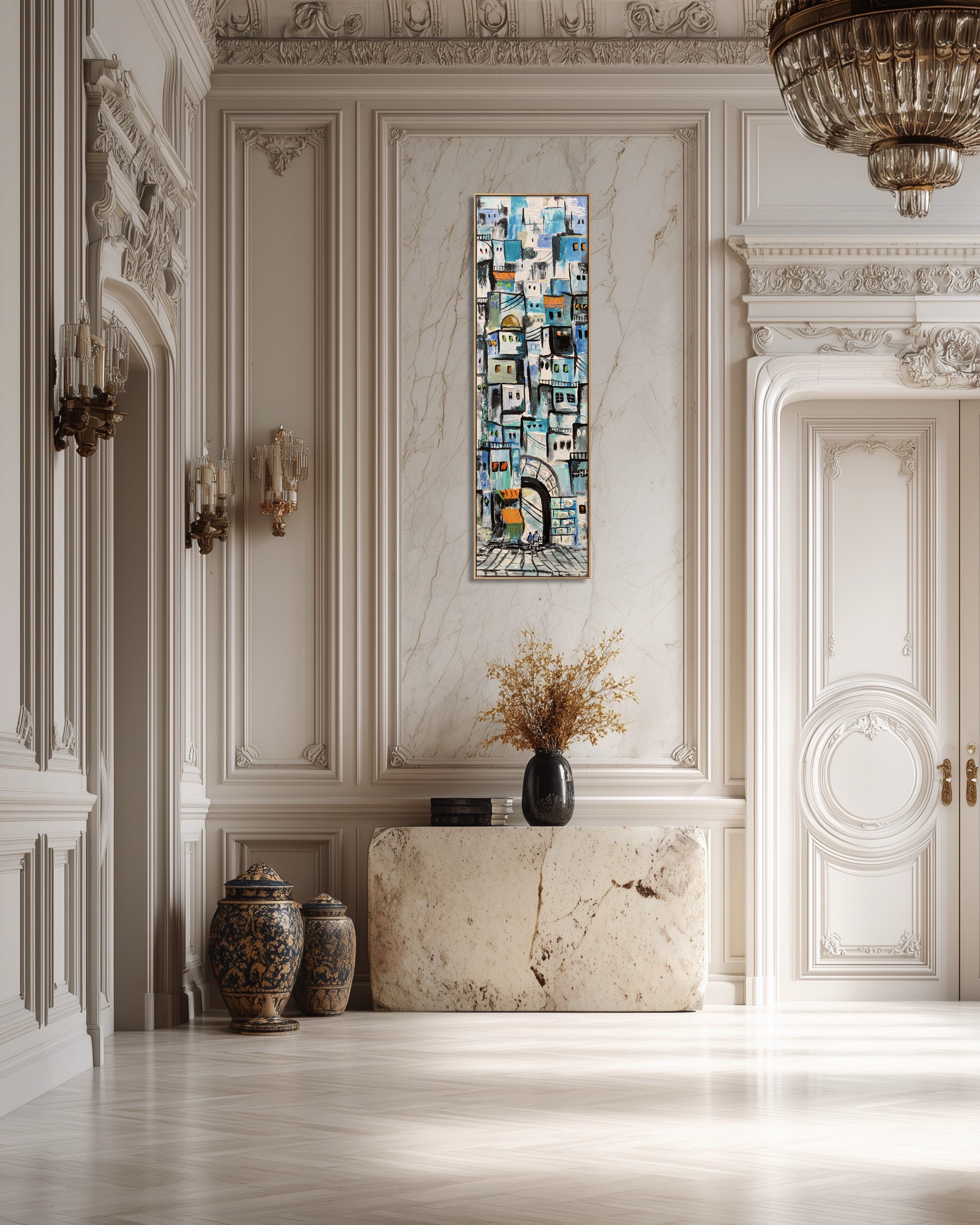 A vibrant painting that captures the spirit of old cities, where stacked houses resemble layered memories. Shades of blue intertwine with warm accents to tell stories of the people who once lived there. The archway at the bottom is more than an entrance—it symbolizes a passage between past and present, reality and imagination.
