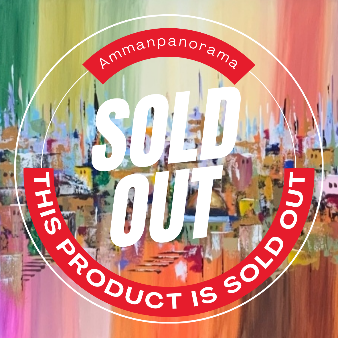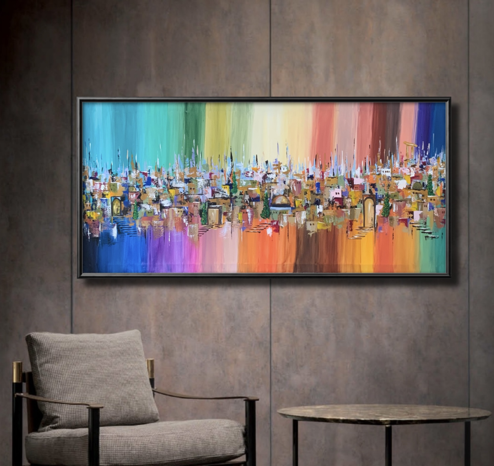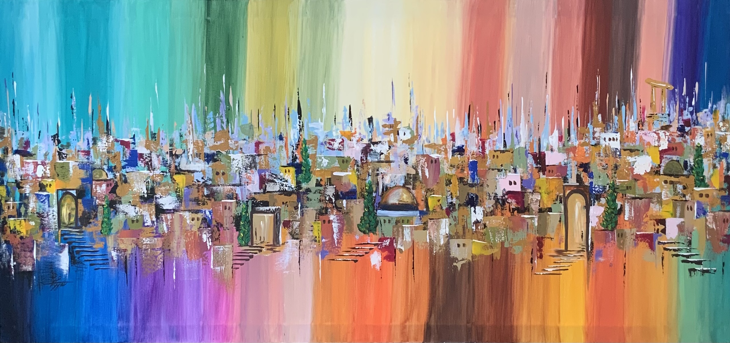 A panoramic painting that portrays a vibrant city where houses, domes, and historic columns merge with a wide spectrum of colors, stretching from turquoise and blue to red, orange, and violet. The colors form a dreamlike backdrop that reflects human diversity and the richness of life within the city, while doors, domes, and trees symbolize the connection between past and present.