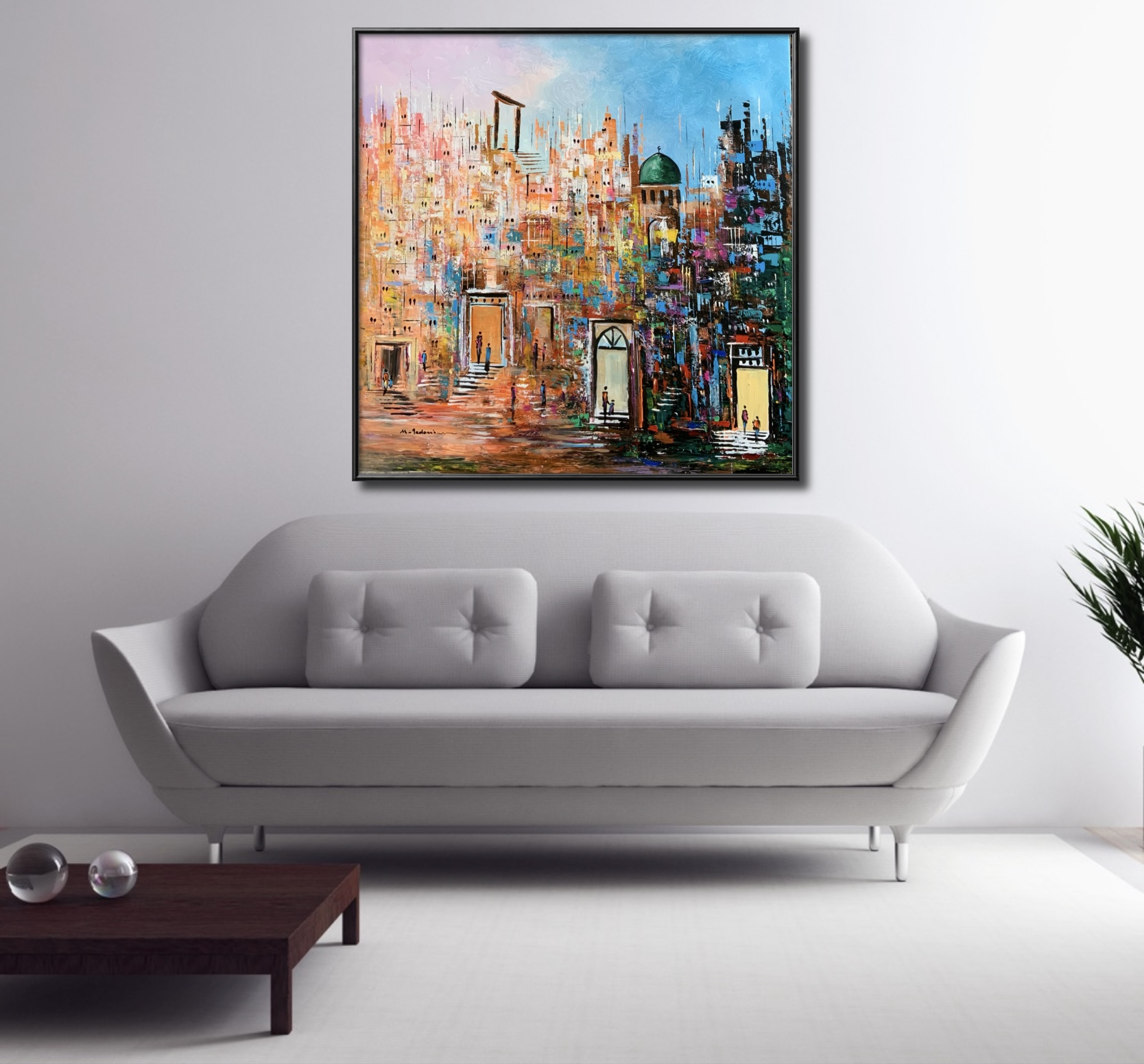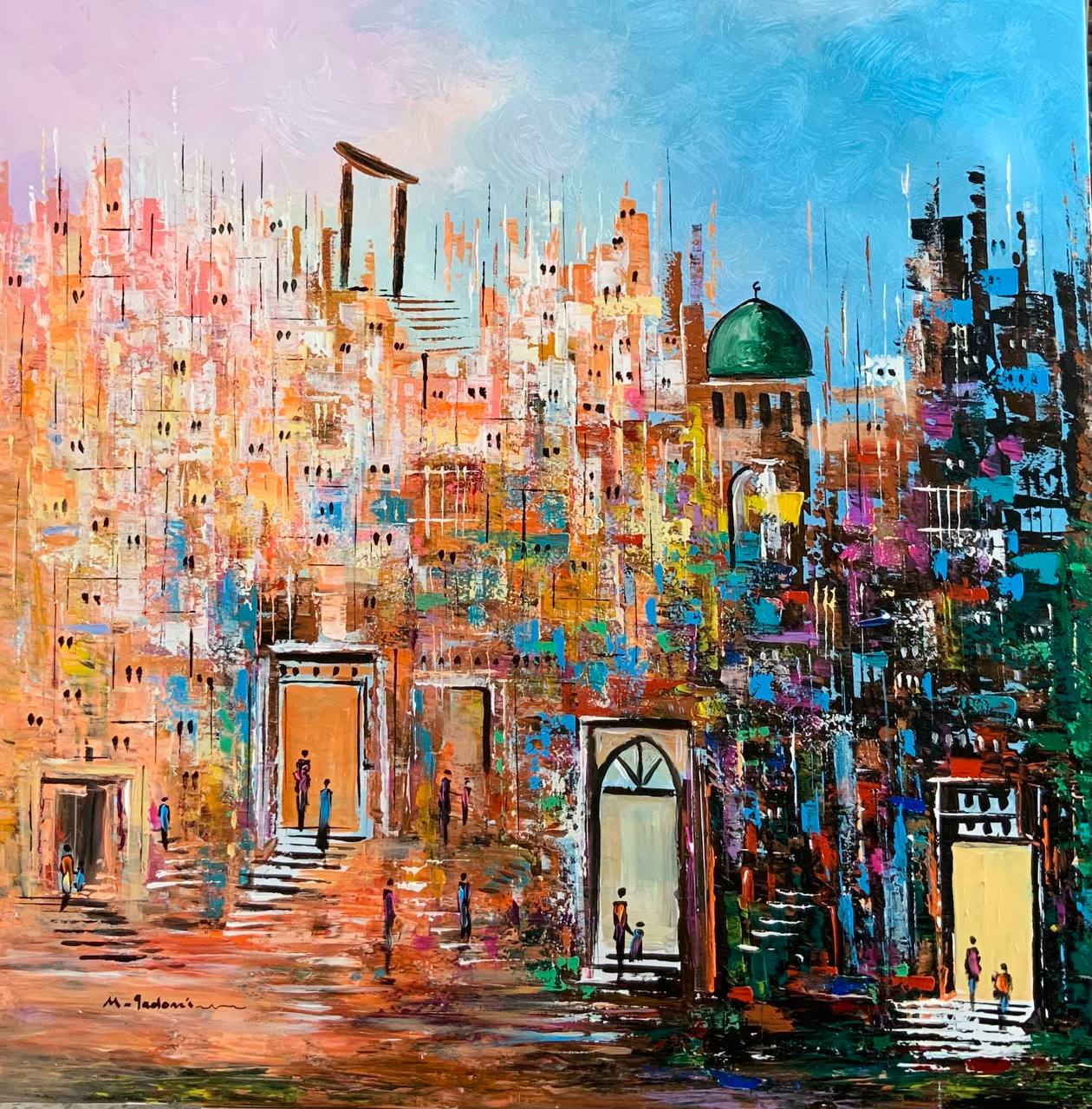 This painting captures the spirit of old Amman, where warm and cool colors blend to portray clustered houses, the Roman columns of the Citadel, and the green mosque dome in a scene that unites history with daily life. The open doors symbolize openness and communication, while the vibrant colors reflect the city’s diversity and vitality.