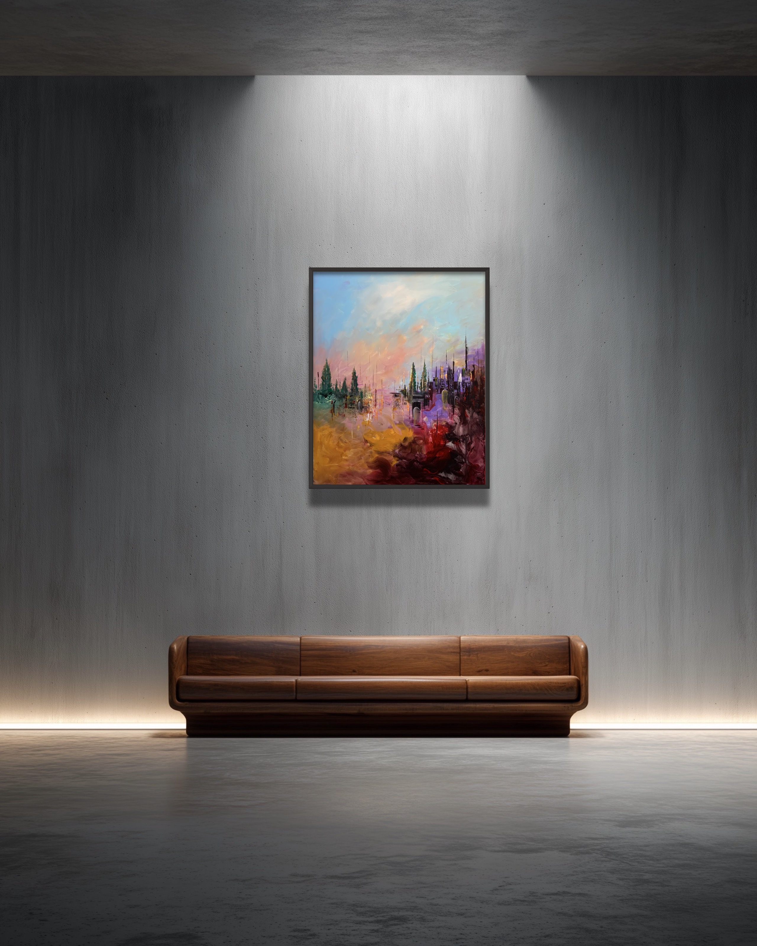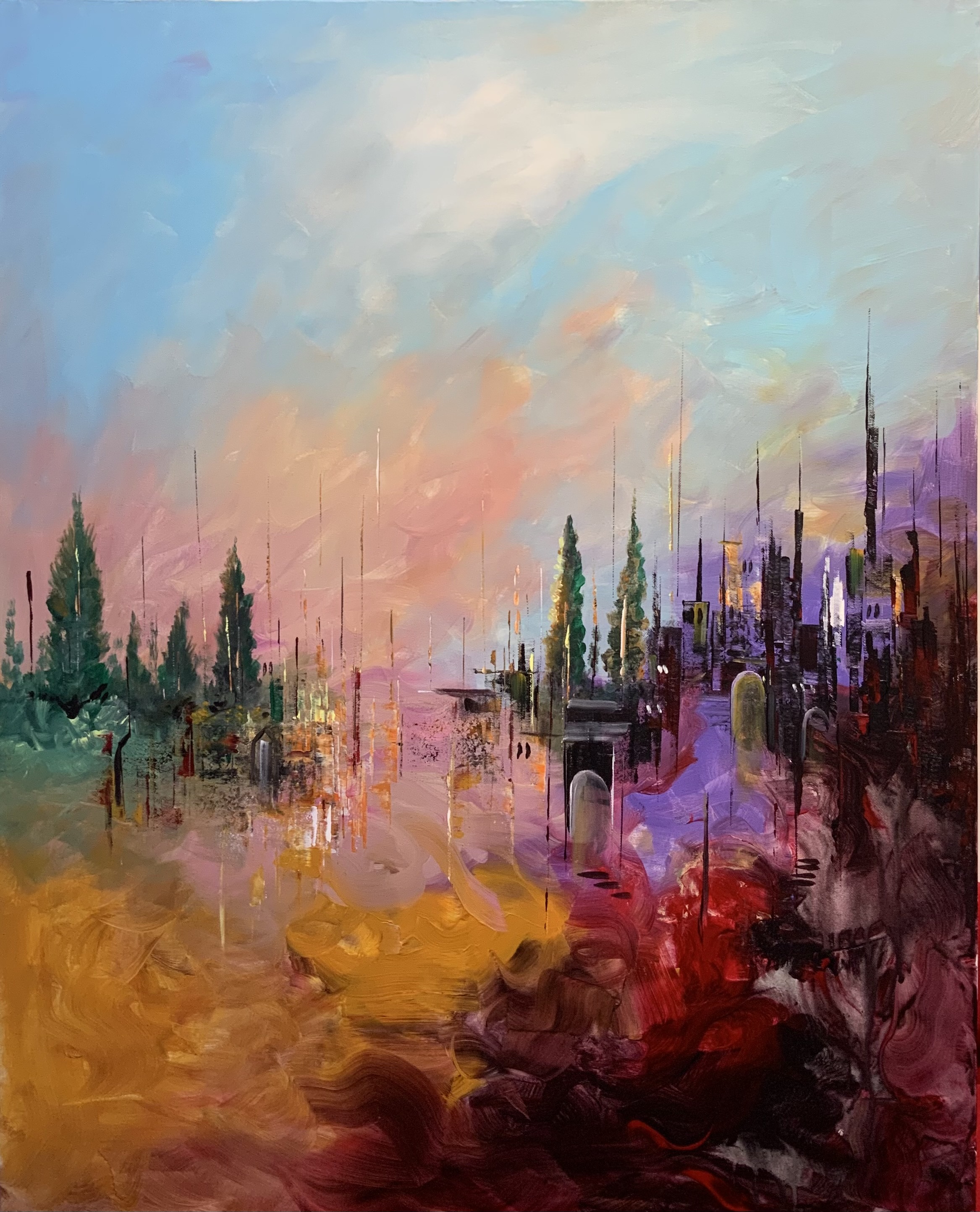 This painting portrays a dreamlike city reflected upon a calm water surface, where architecture and nature merge in a harmonious flow of color. The sky shifts between soft blues and warm pinks, while vertical brushstrokes fall like streams of light, creating a serene yet imaginative atmosphere.